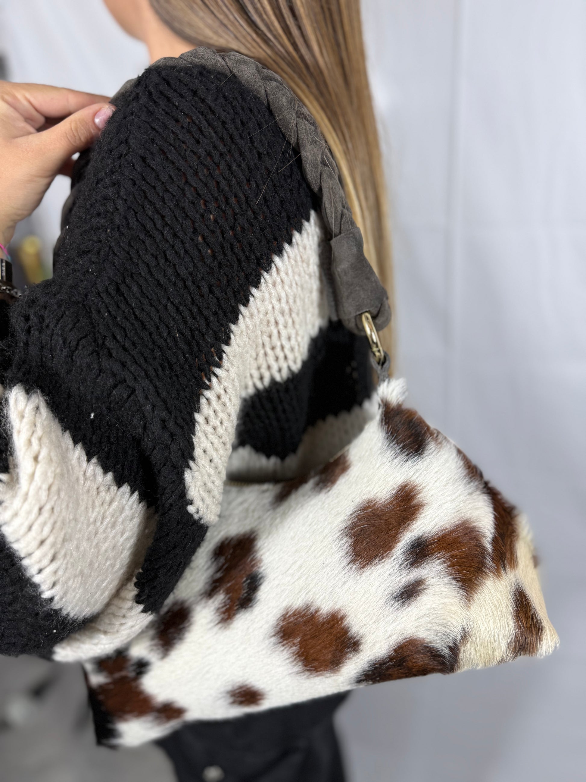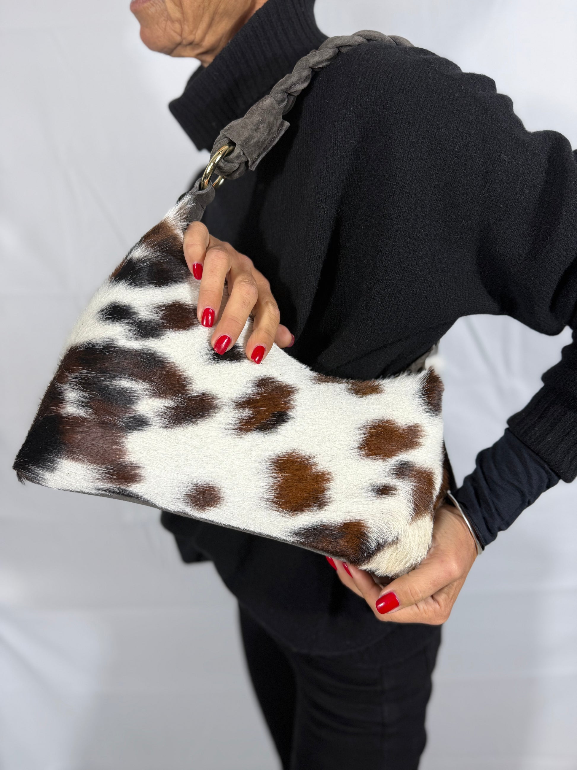 Borsa a spalla realizzata in pelle di vitello scamosciato, manico intrecciato, chiusura a cerniera tasca esterna con cerniera