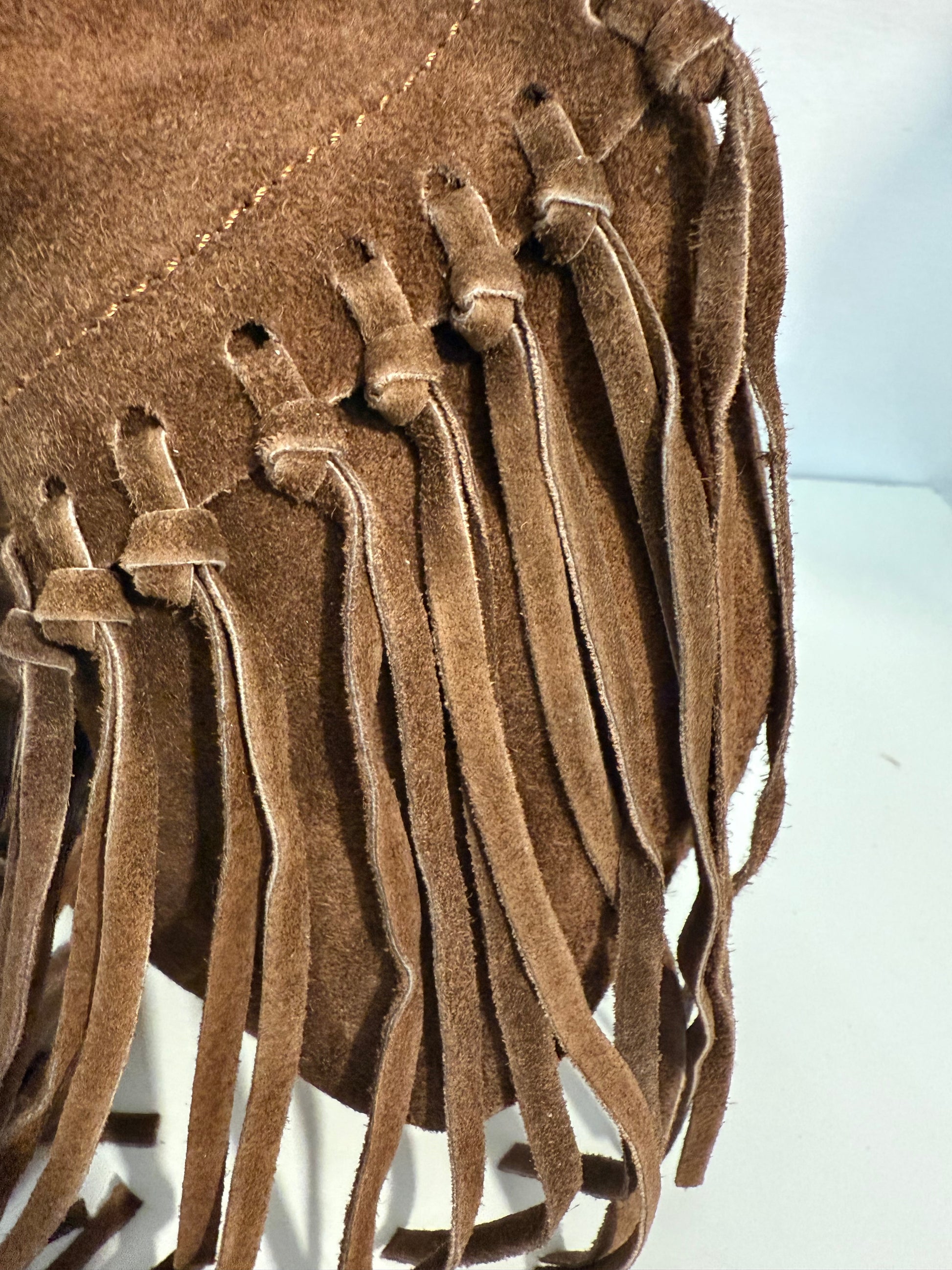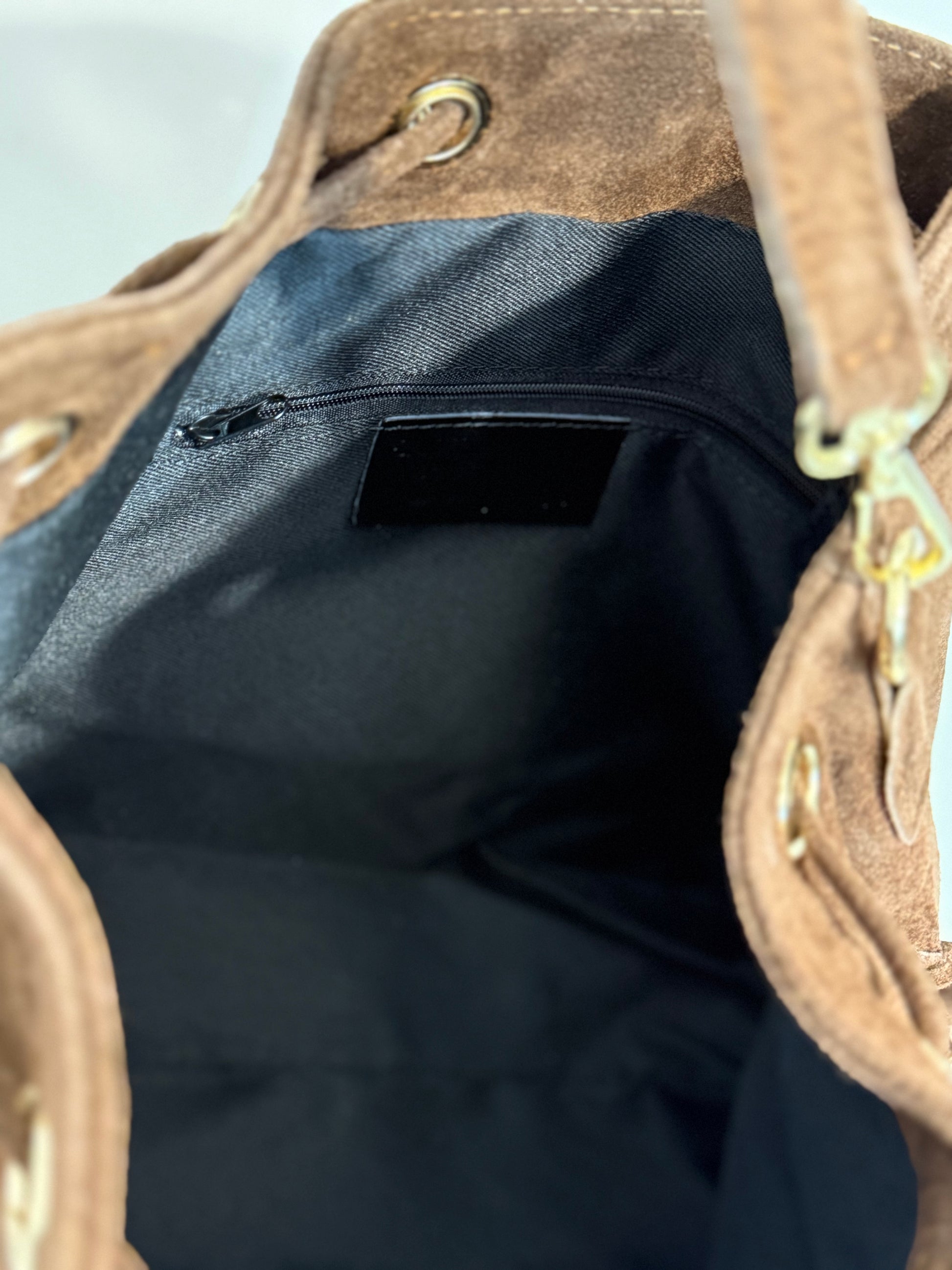 Secchiello in suede con frange , con maniglia e tracolla in suede interno foderato in cotone