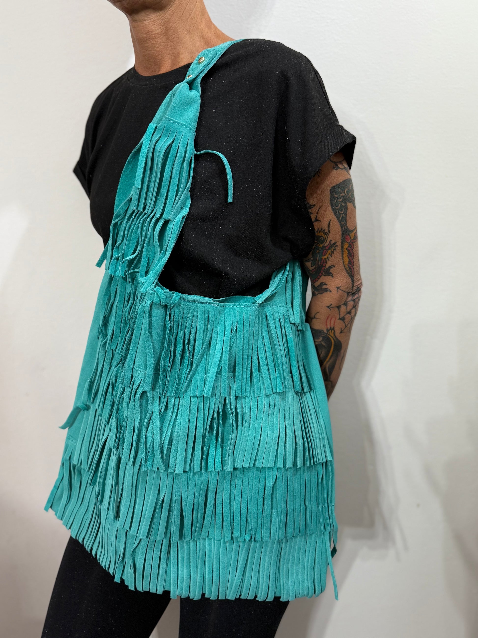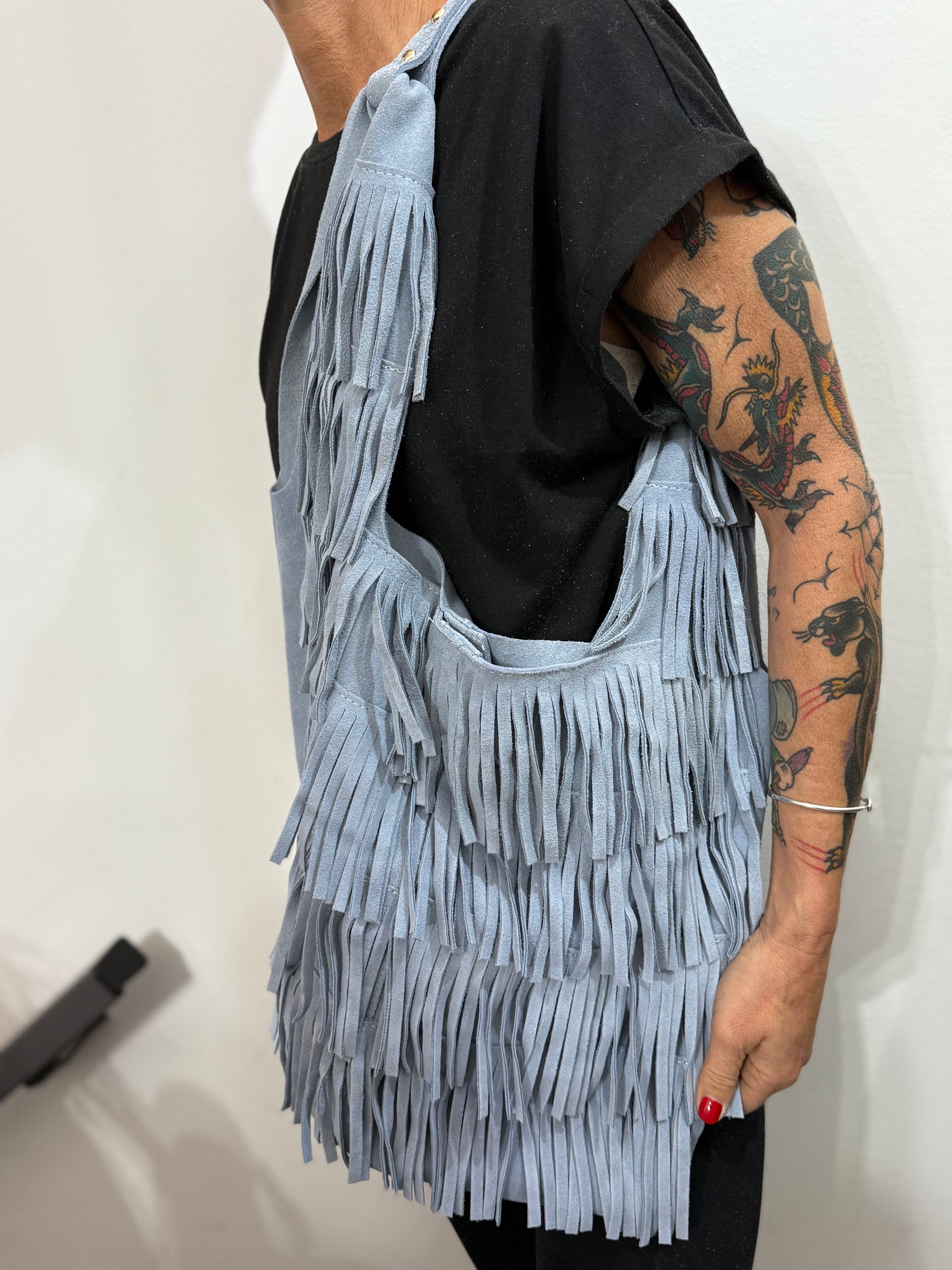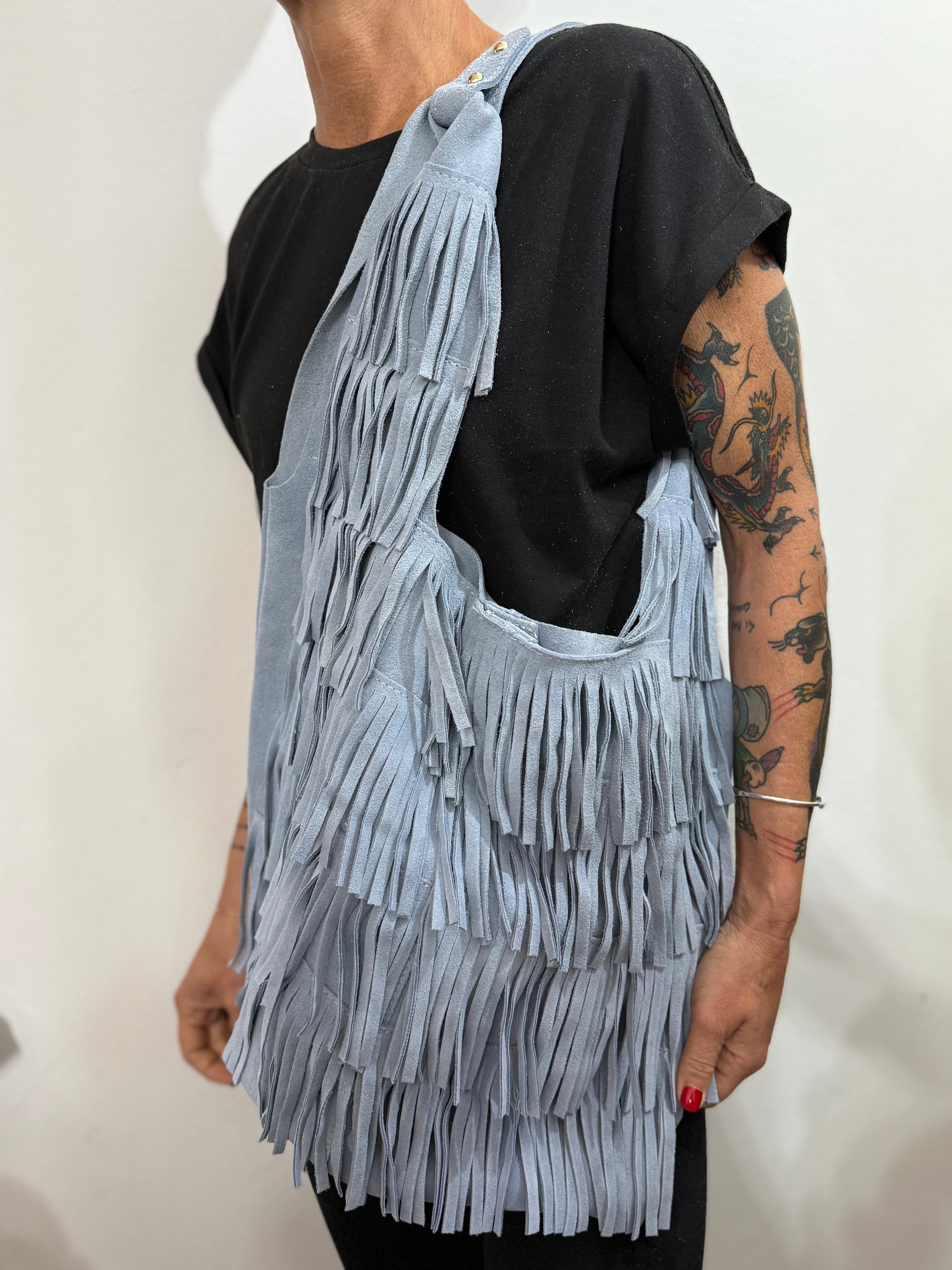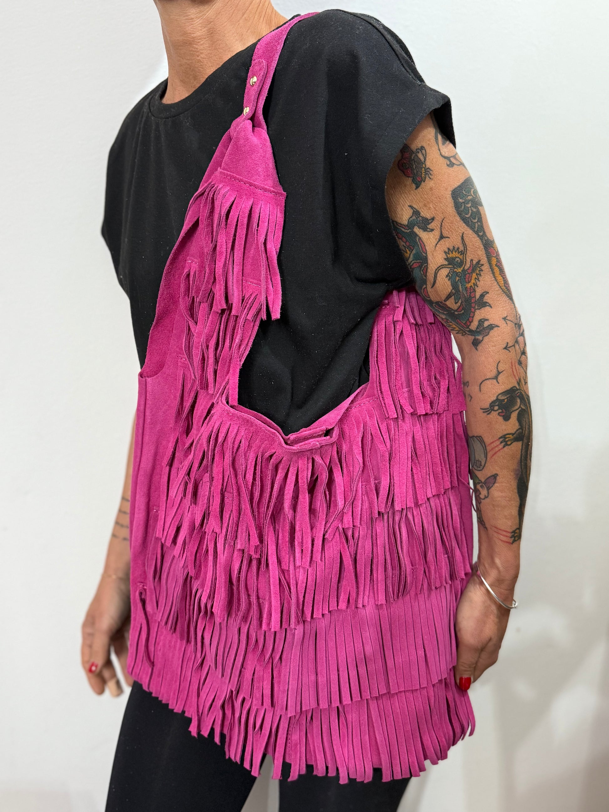 Borsa a spalla in pelle di vitello scamosciato con frange.