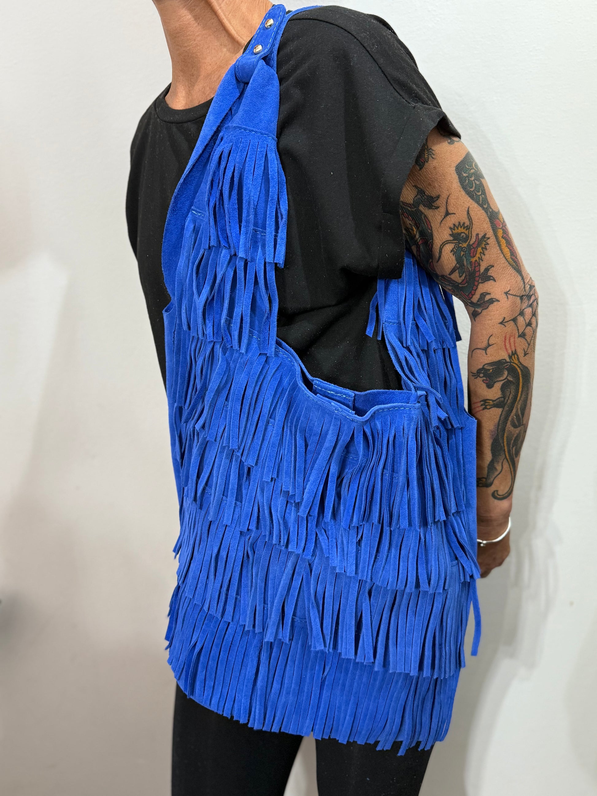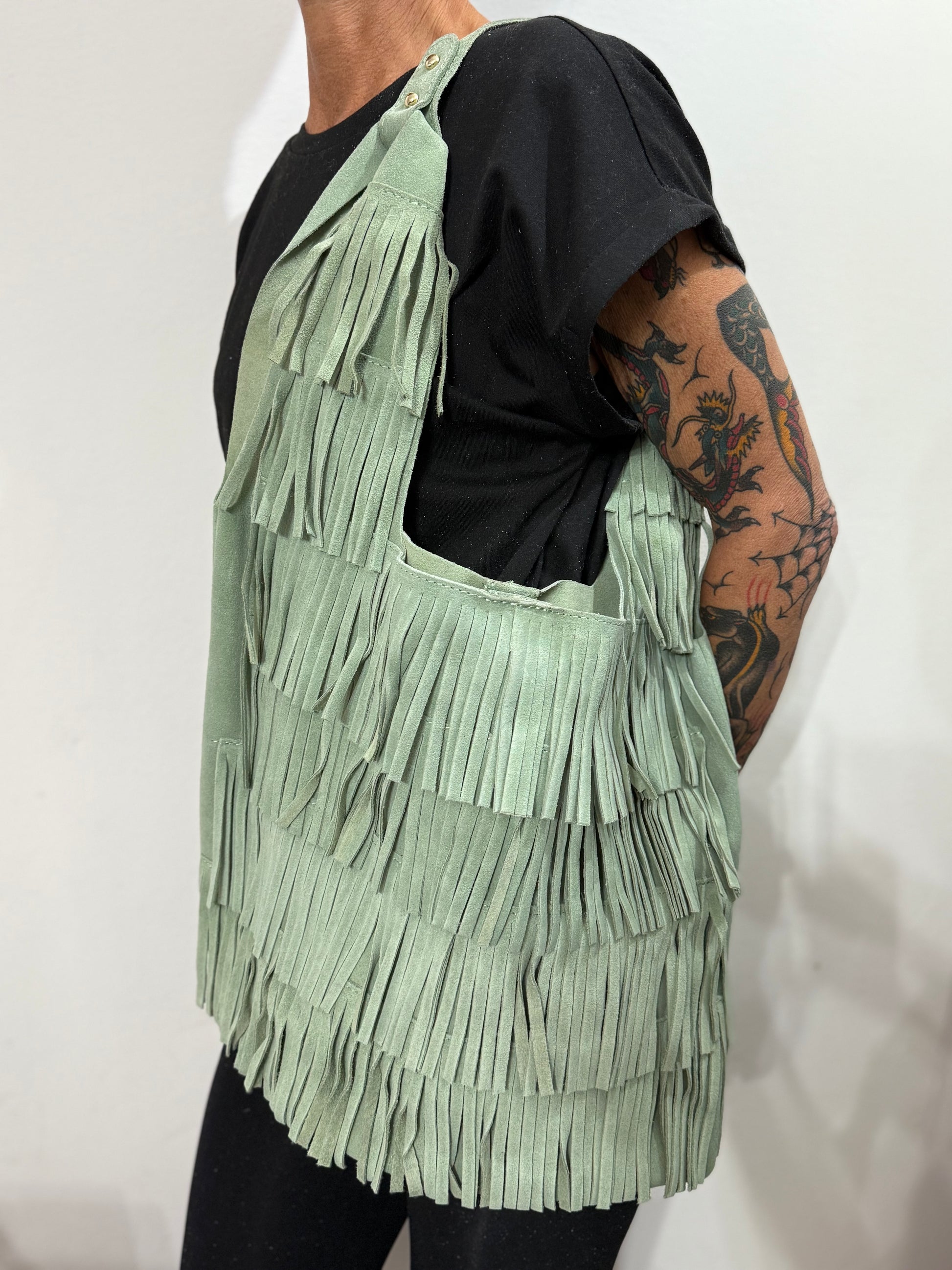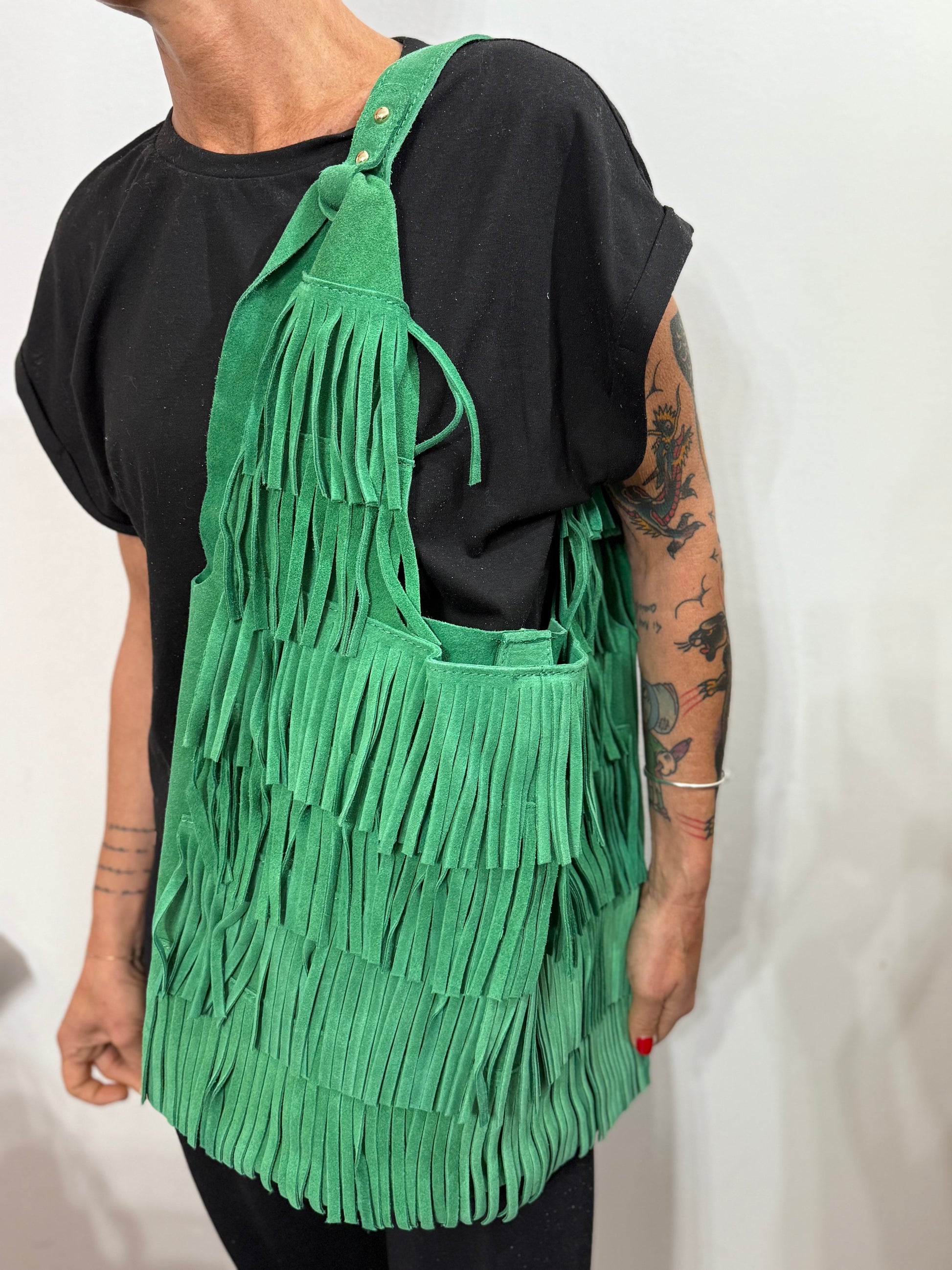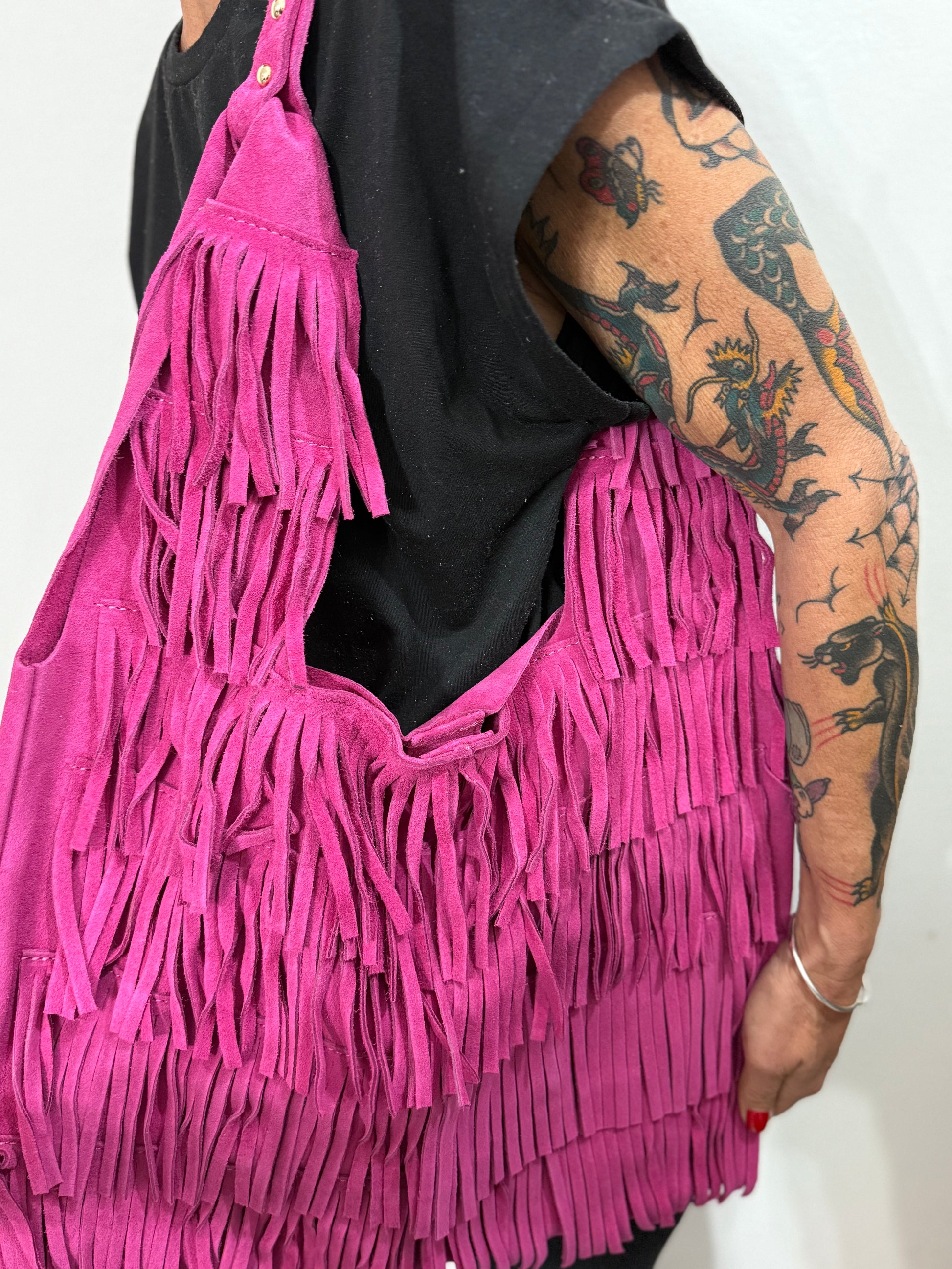 Borsa a spalla in pelle di vitello scamosciato con frange.