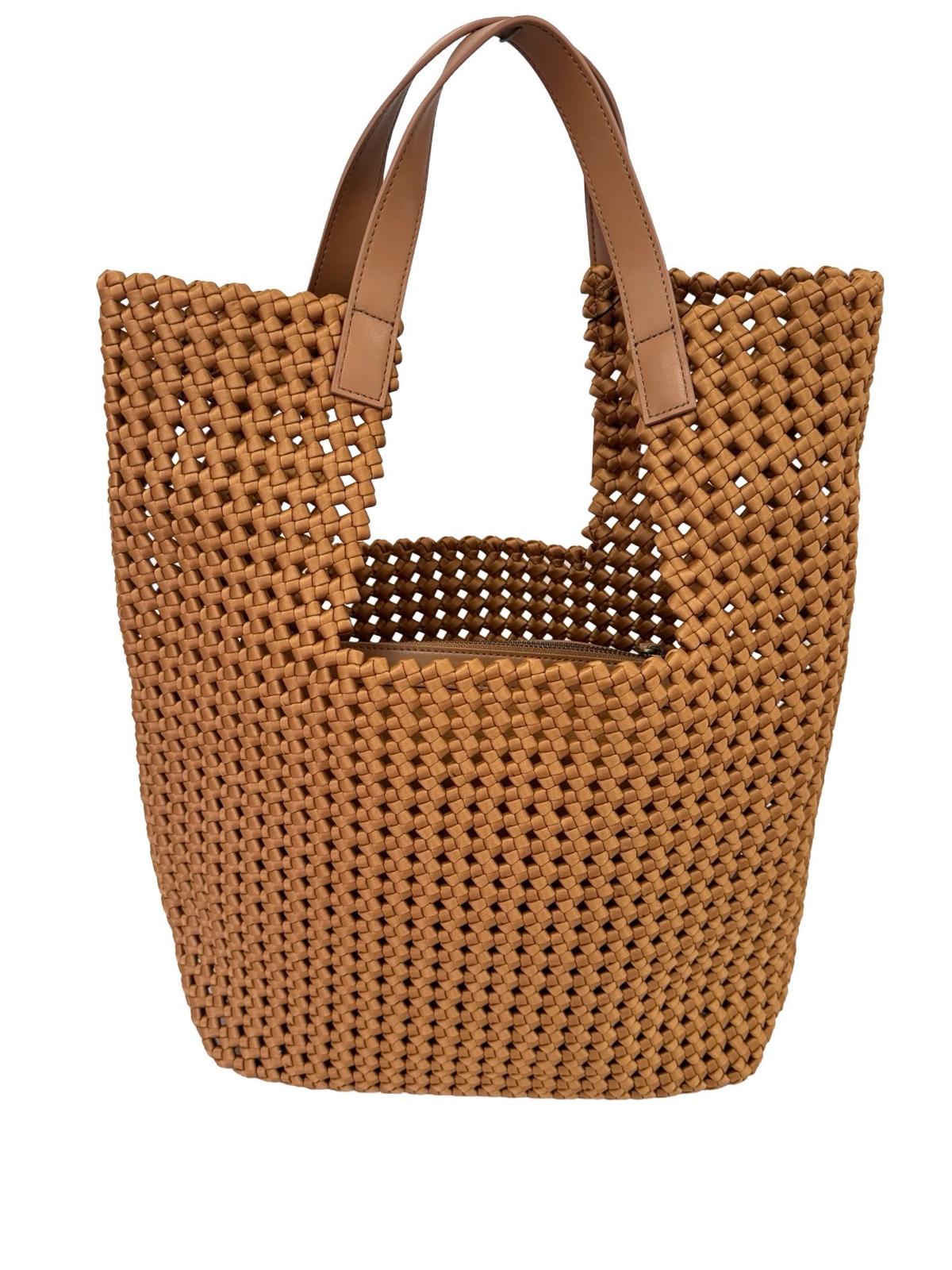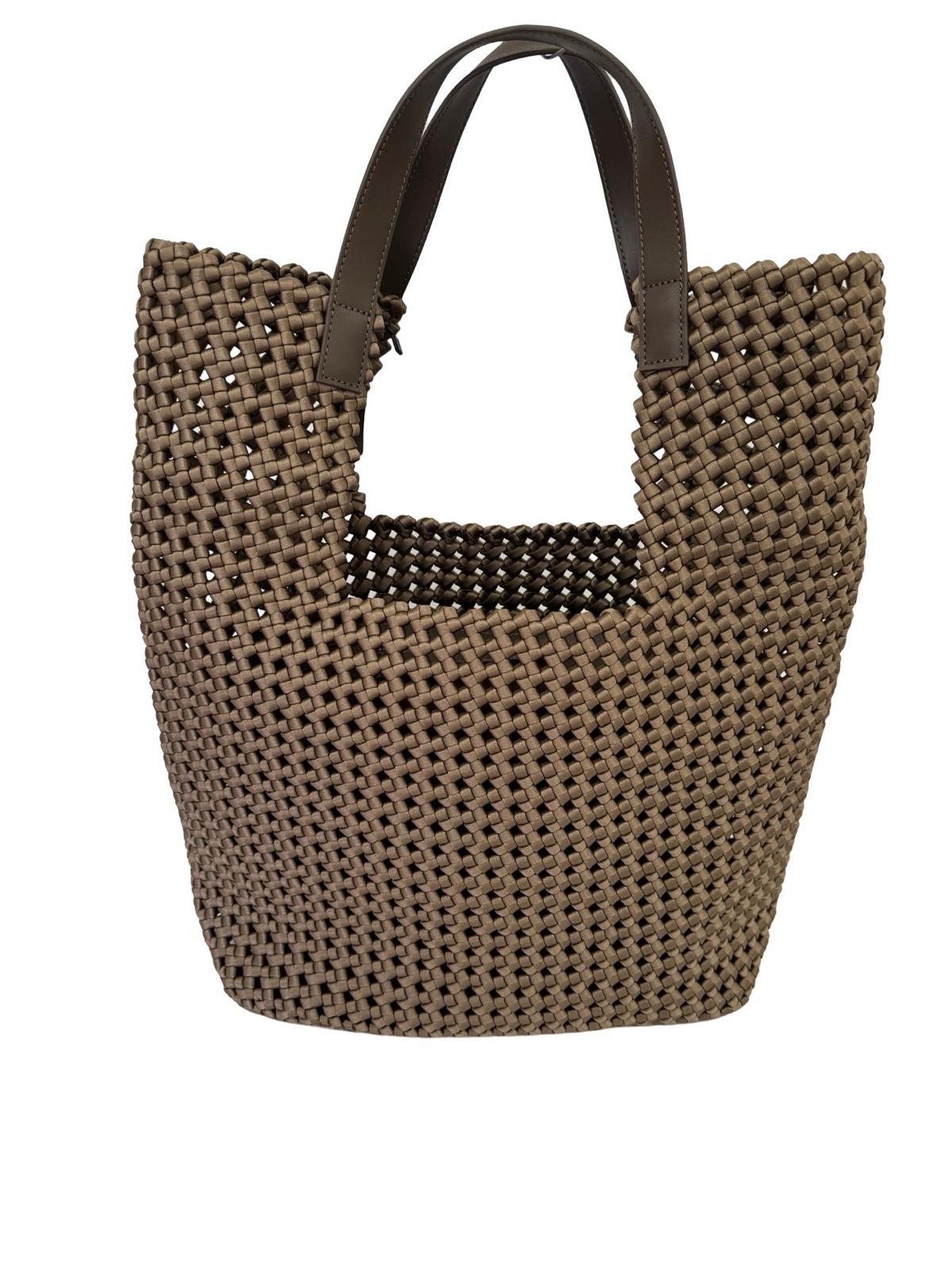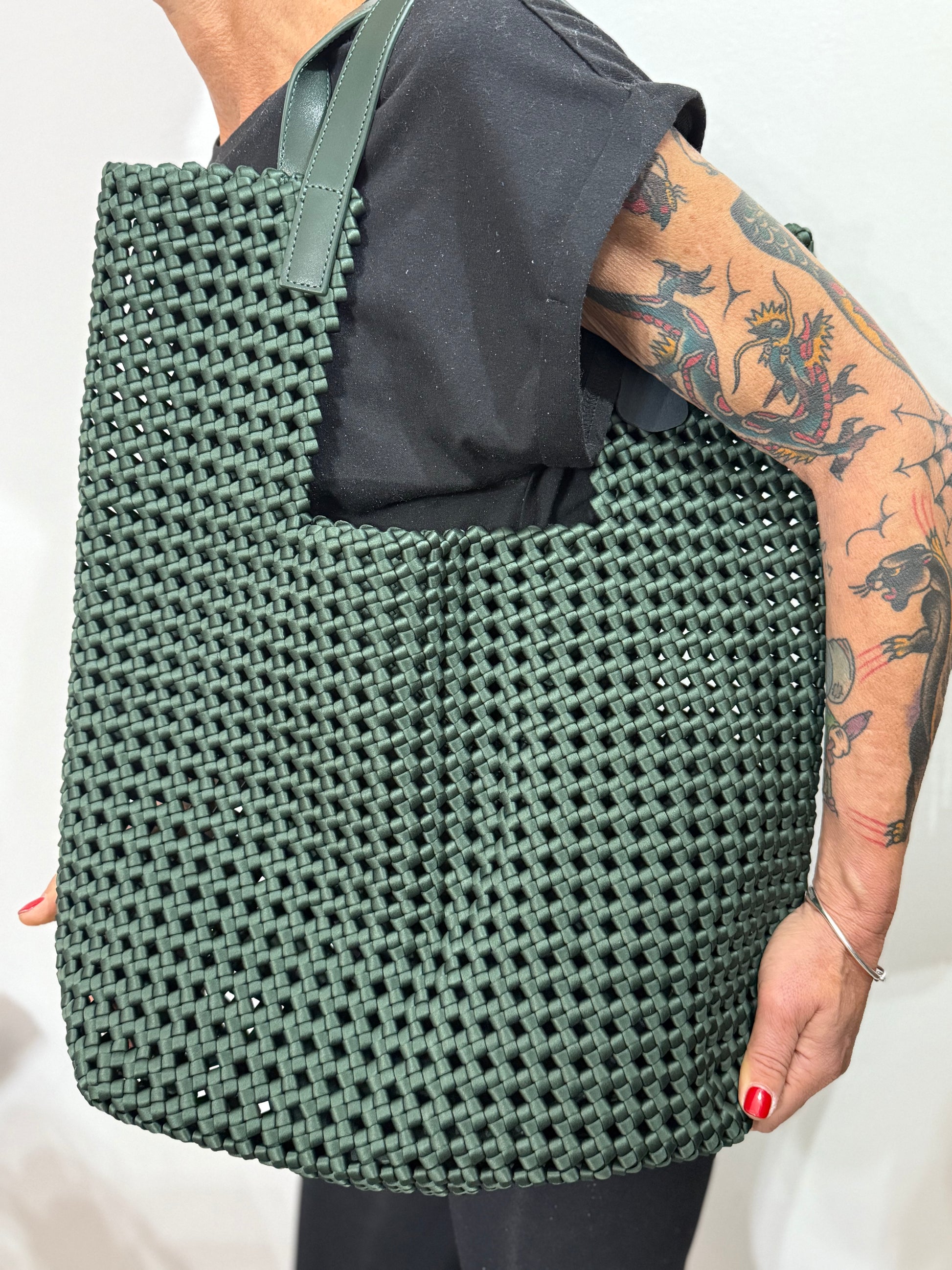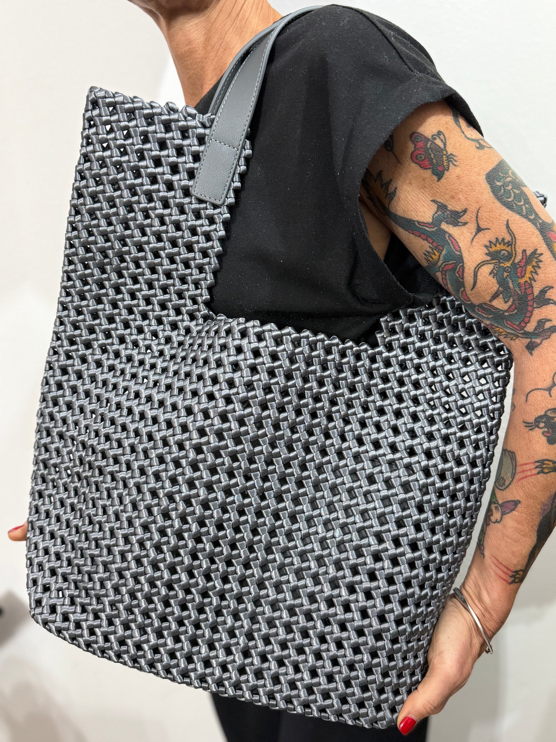 Maxi bag realizzata in tessuto intrecciato su forma, i manici sono in pelle di vitello liscia, all'interno maxi pochette in cotone rifinita in pelle.