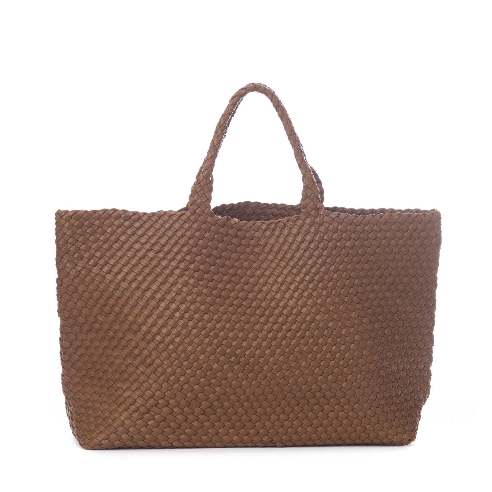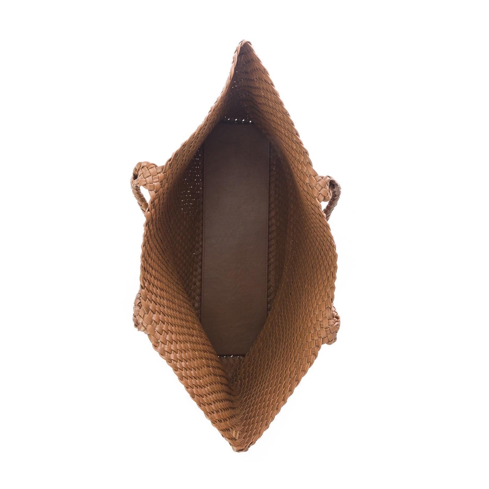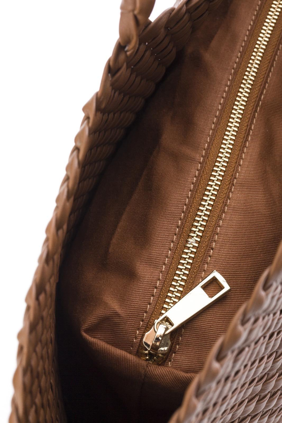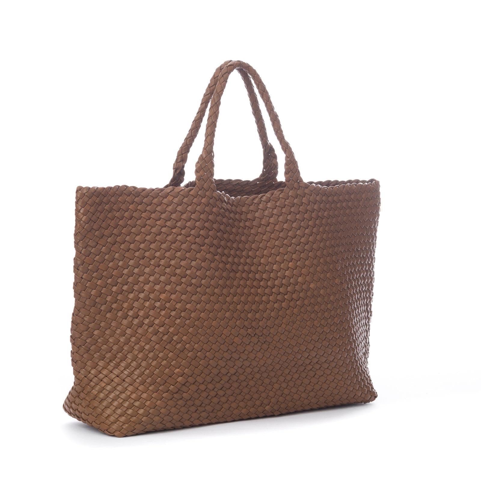 Borsa a mano realizzata in nappa di vitello intrecciata con fettuccia tubolare.