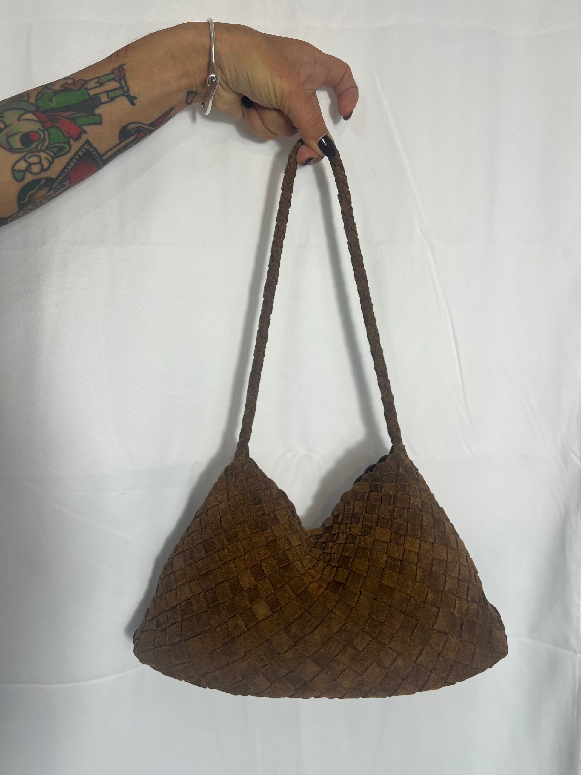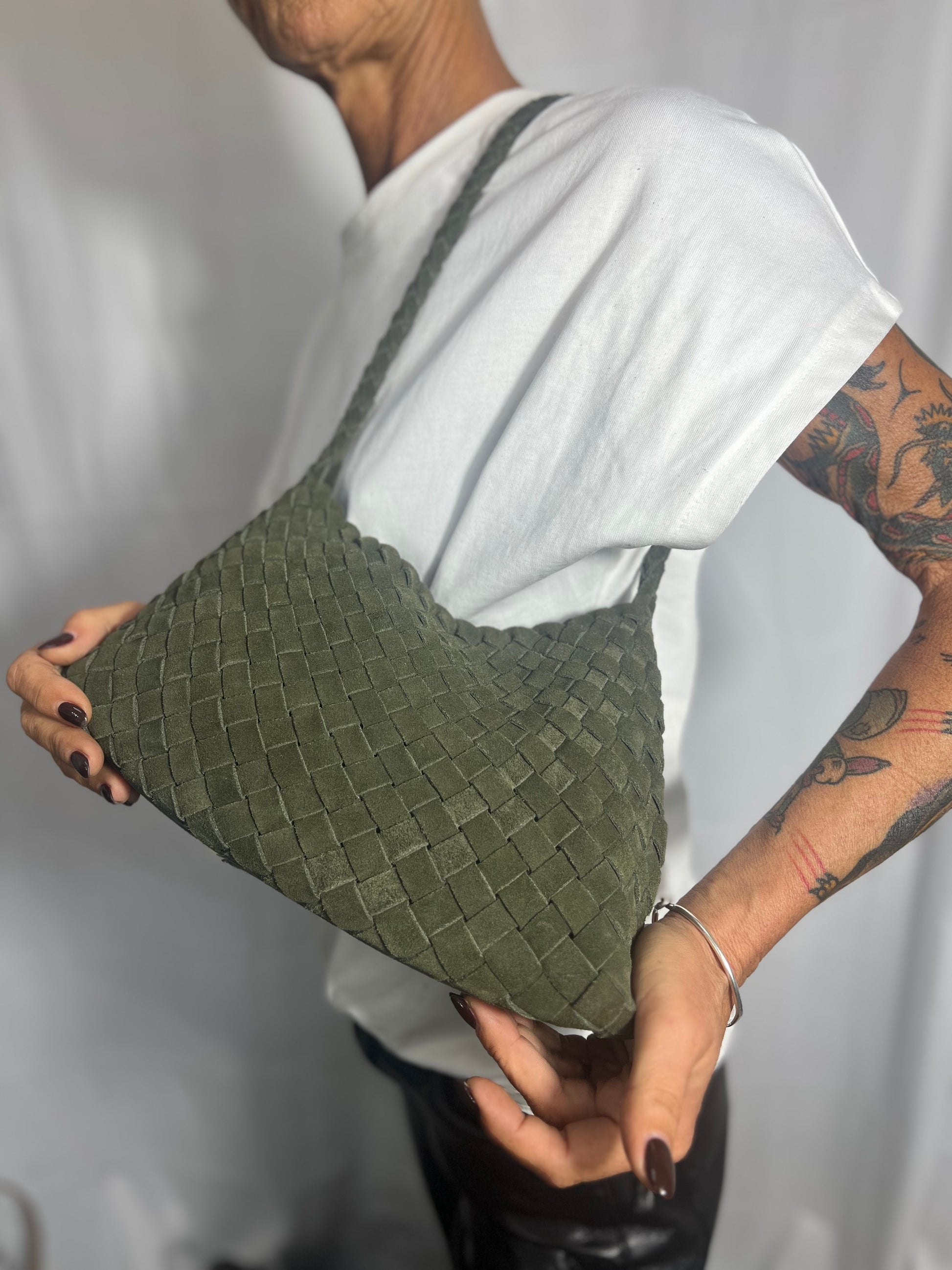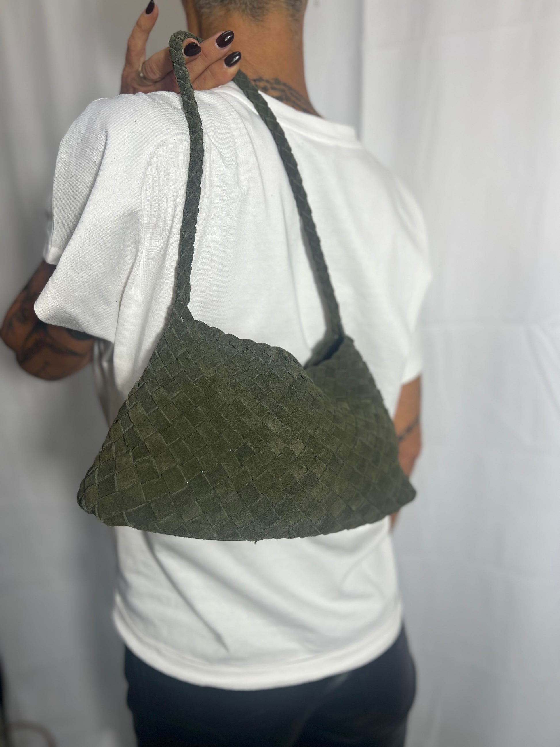 Borsa a spalla intrecciata a mano realizzata in pelle di vitello scamosciata con pochette interna