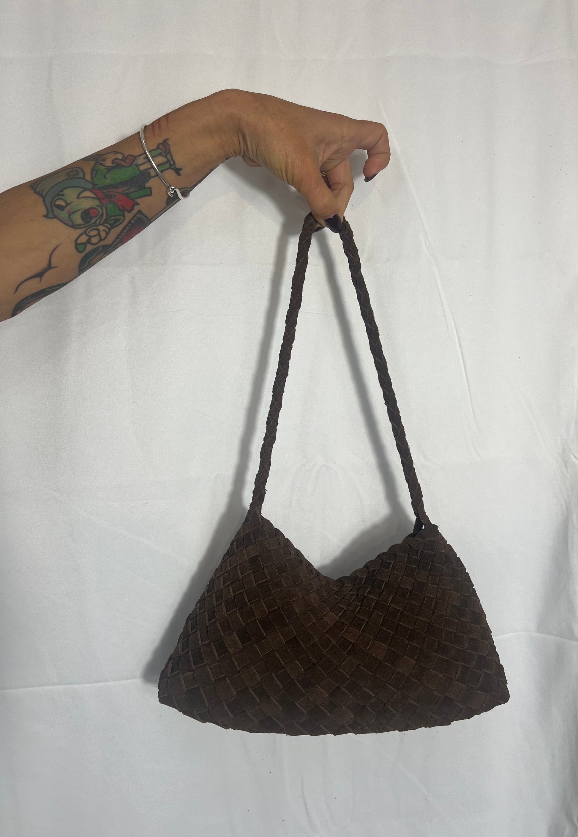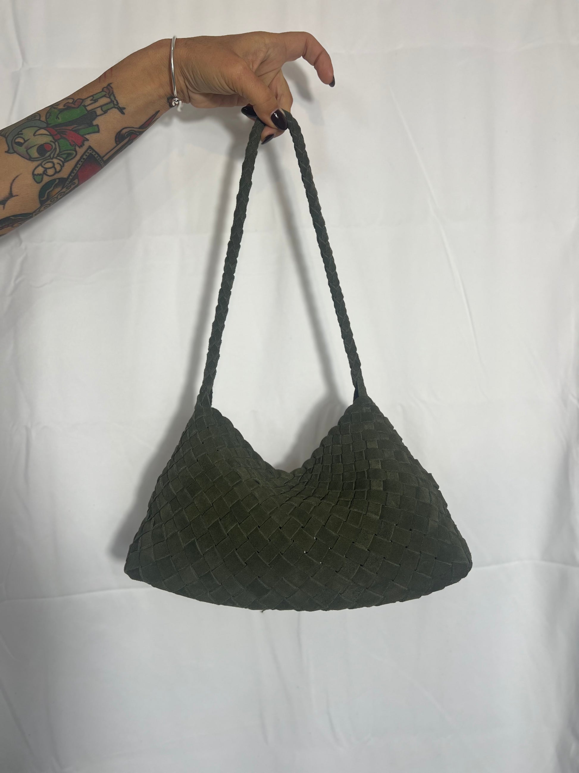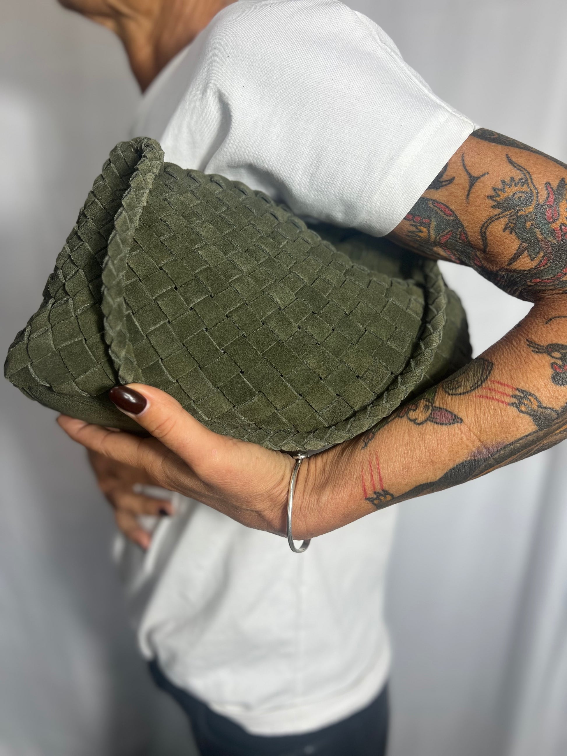Borsa a spalla intrecciata a mano realizzata in pelle di vitello scamosciata con pochette interna