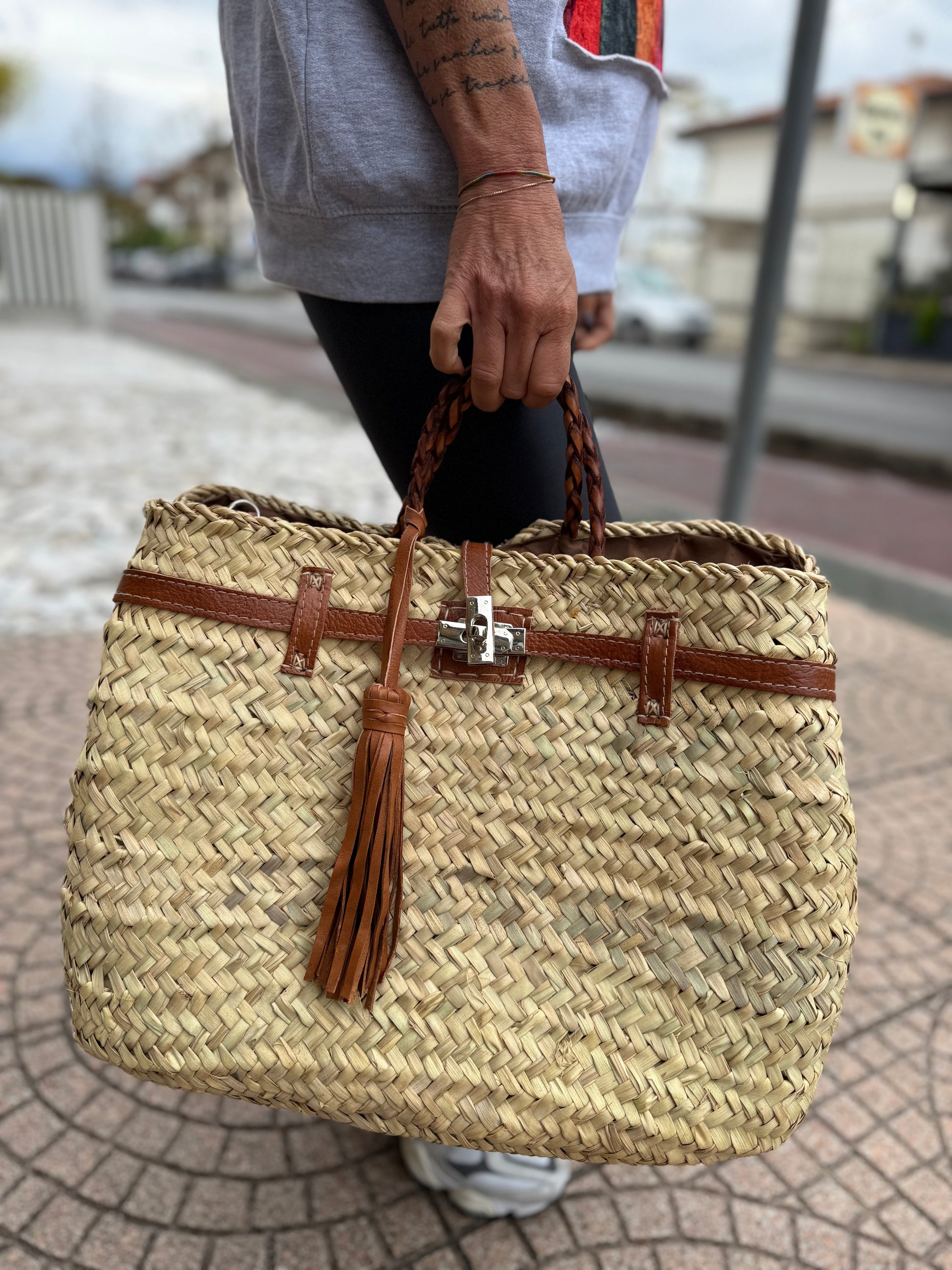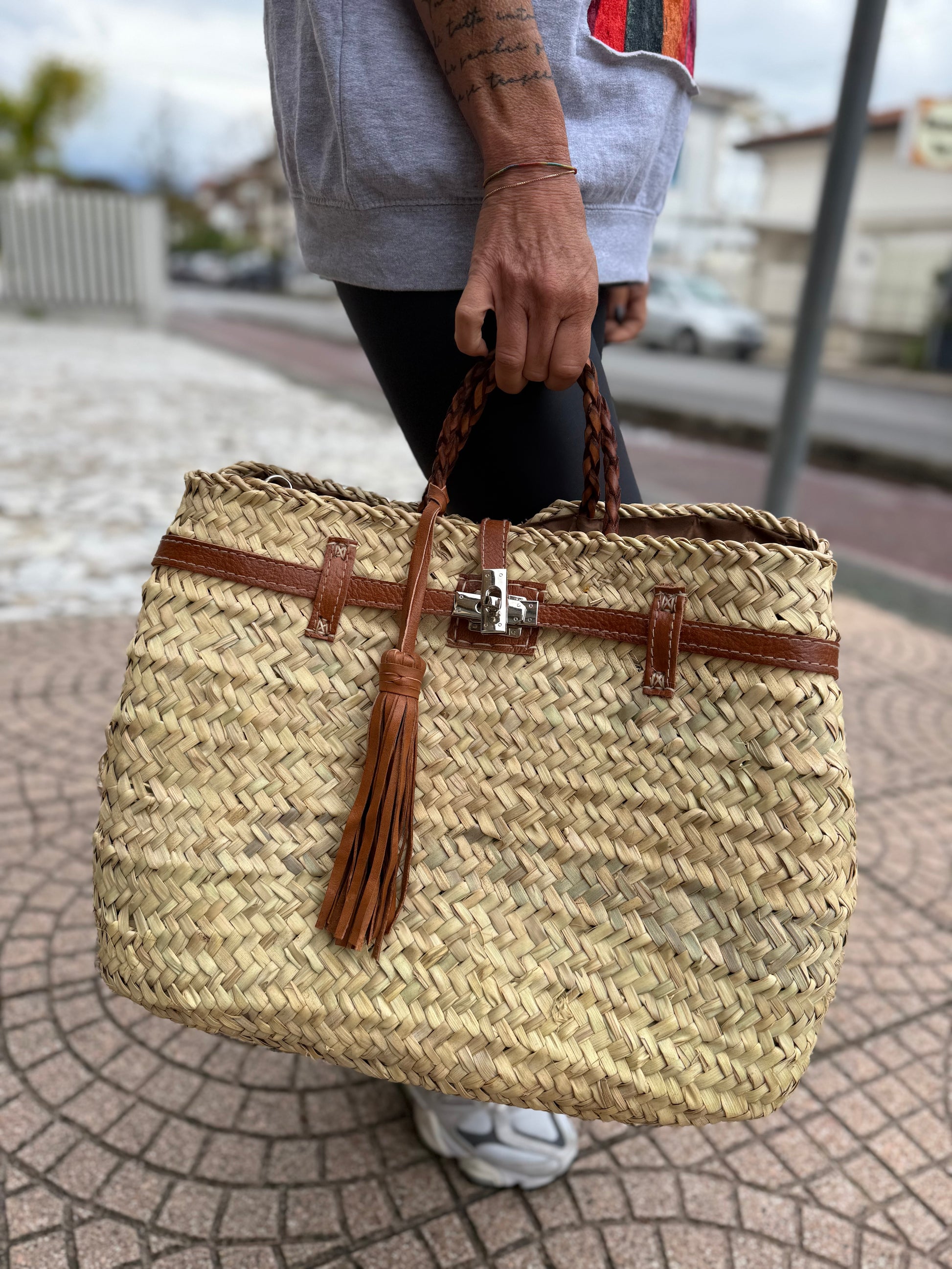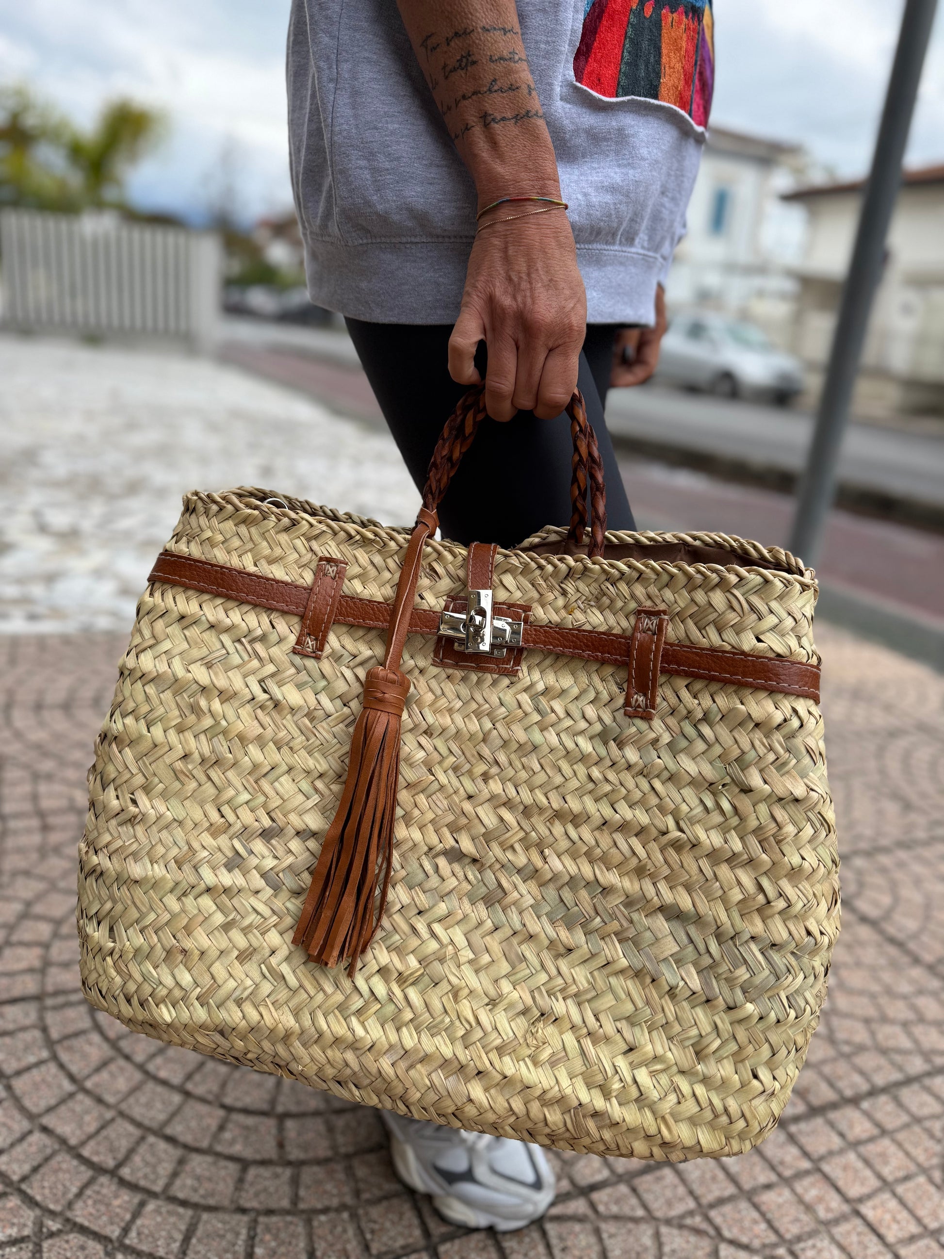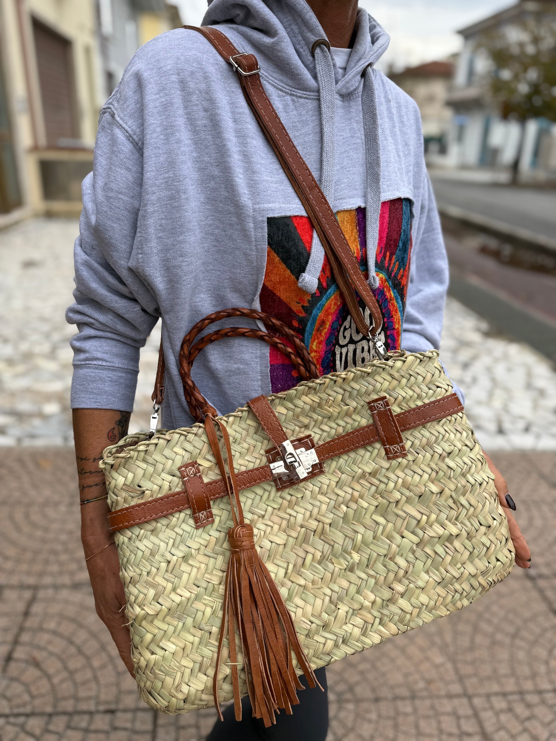 Borsa a mano realizzata in vera paglia di fieno con rifiniture in vera pelle.