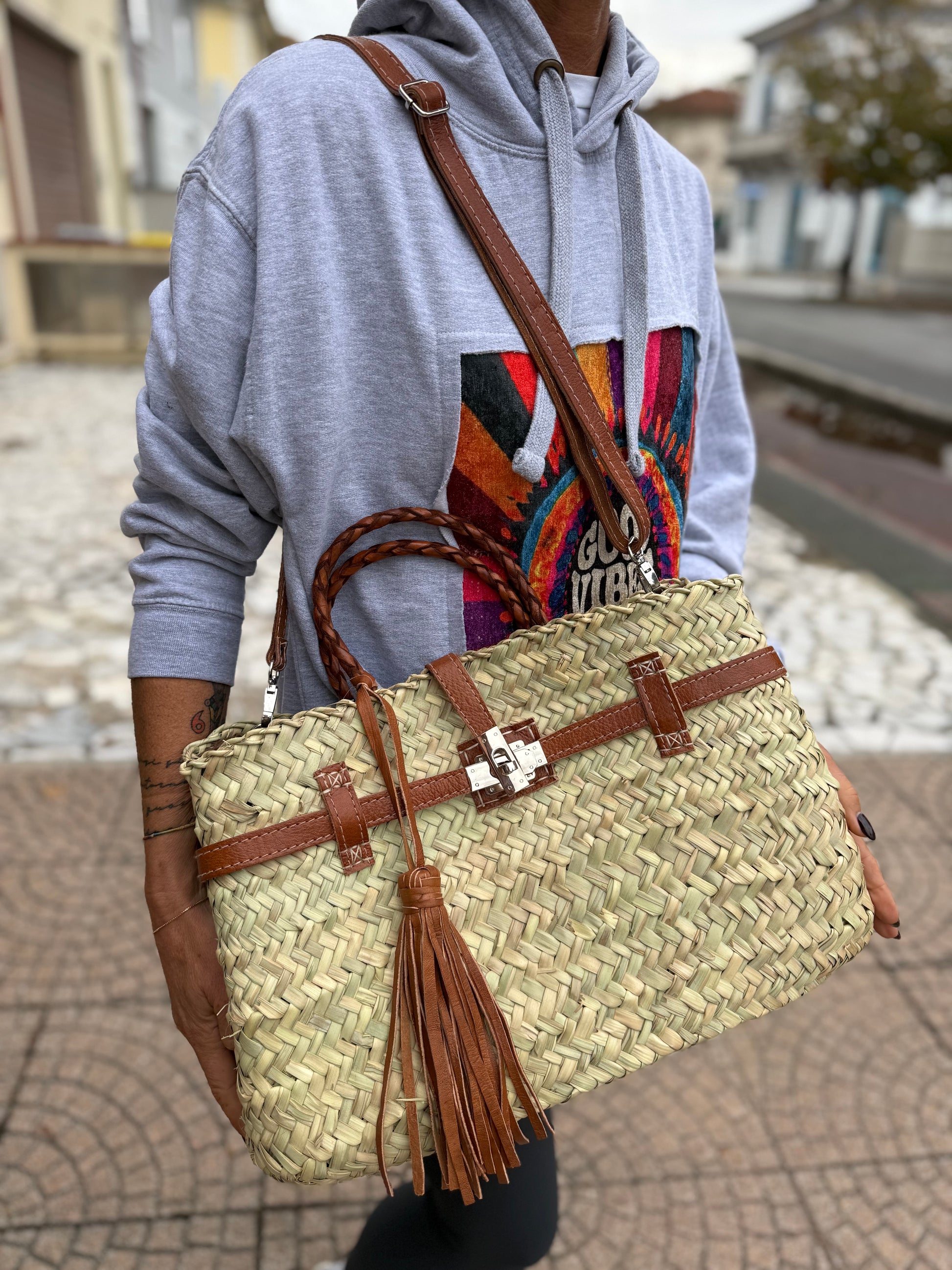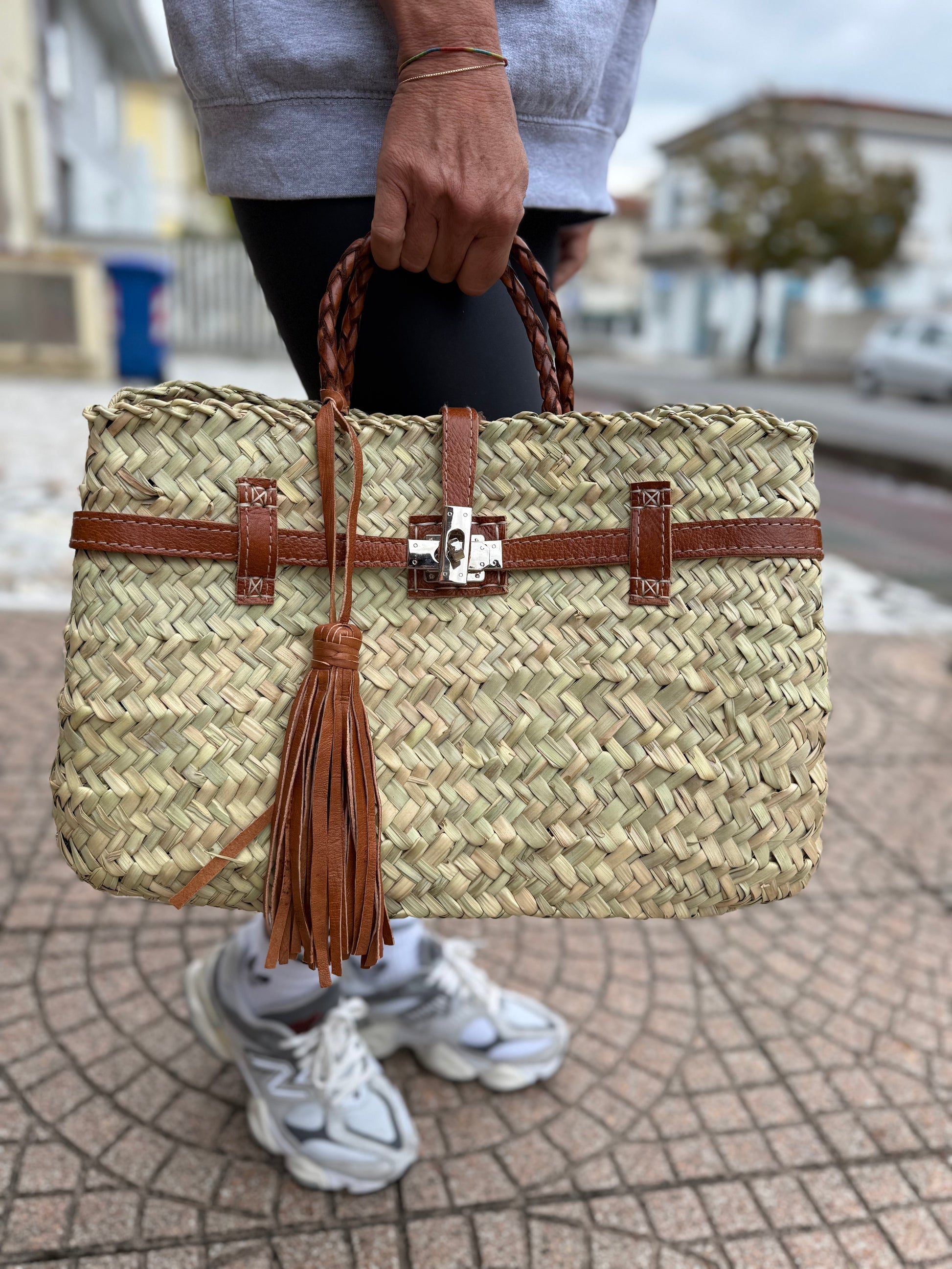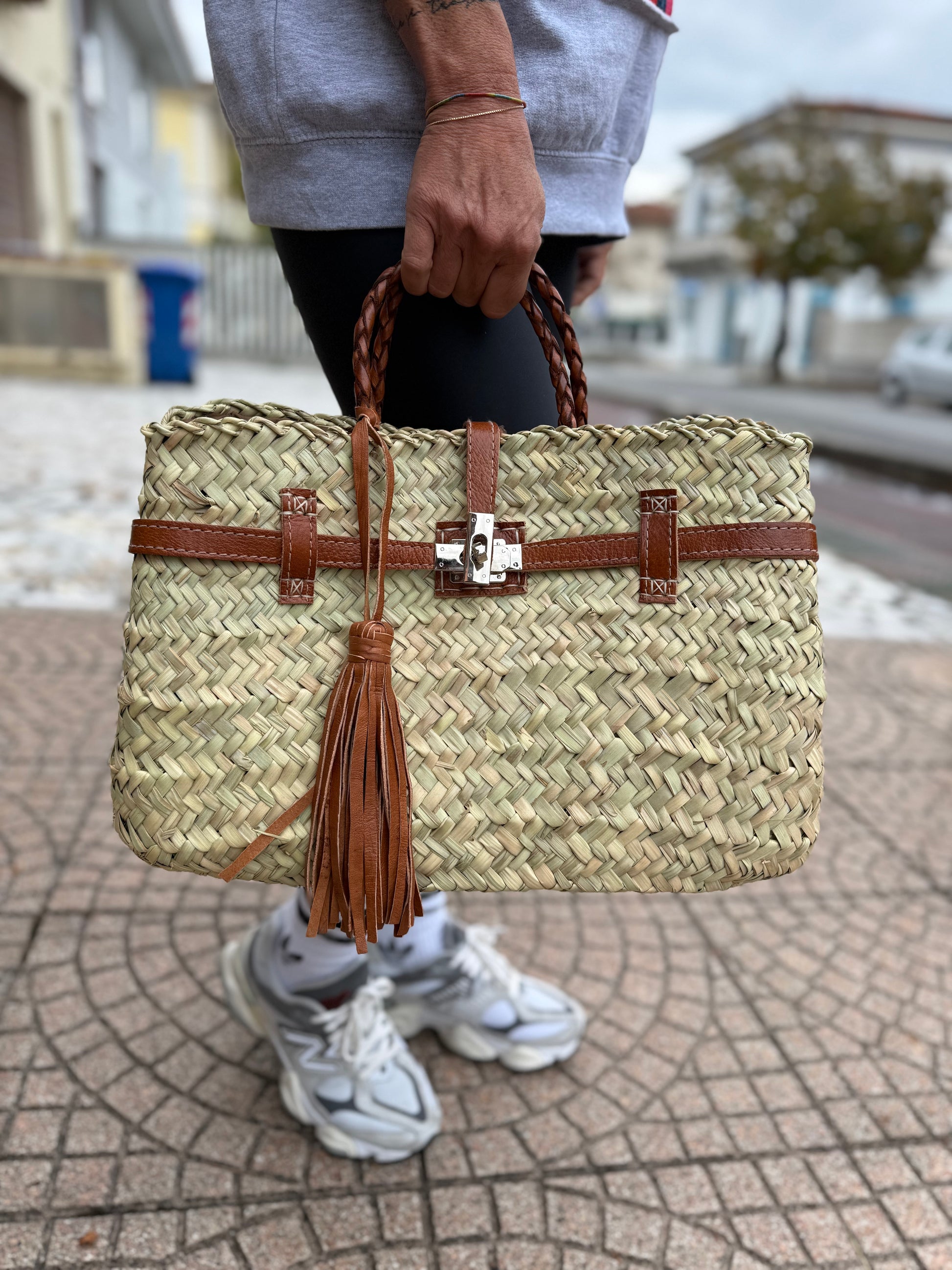 Borsa a mano realizzata in vera paglia di fieno con rifiniture in vera pelle.