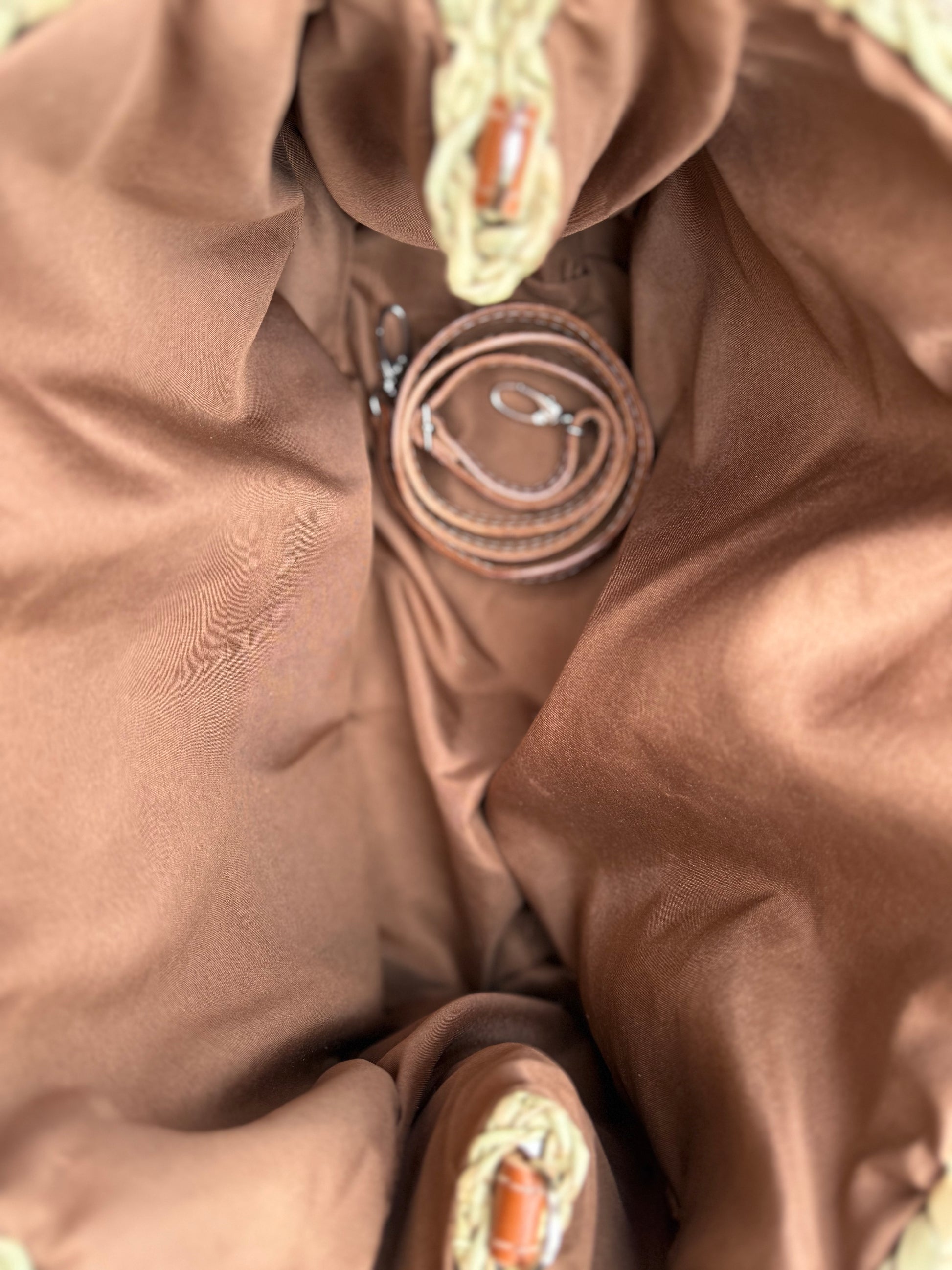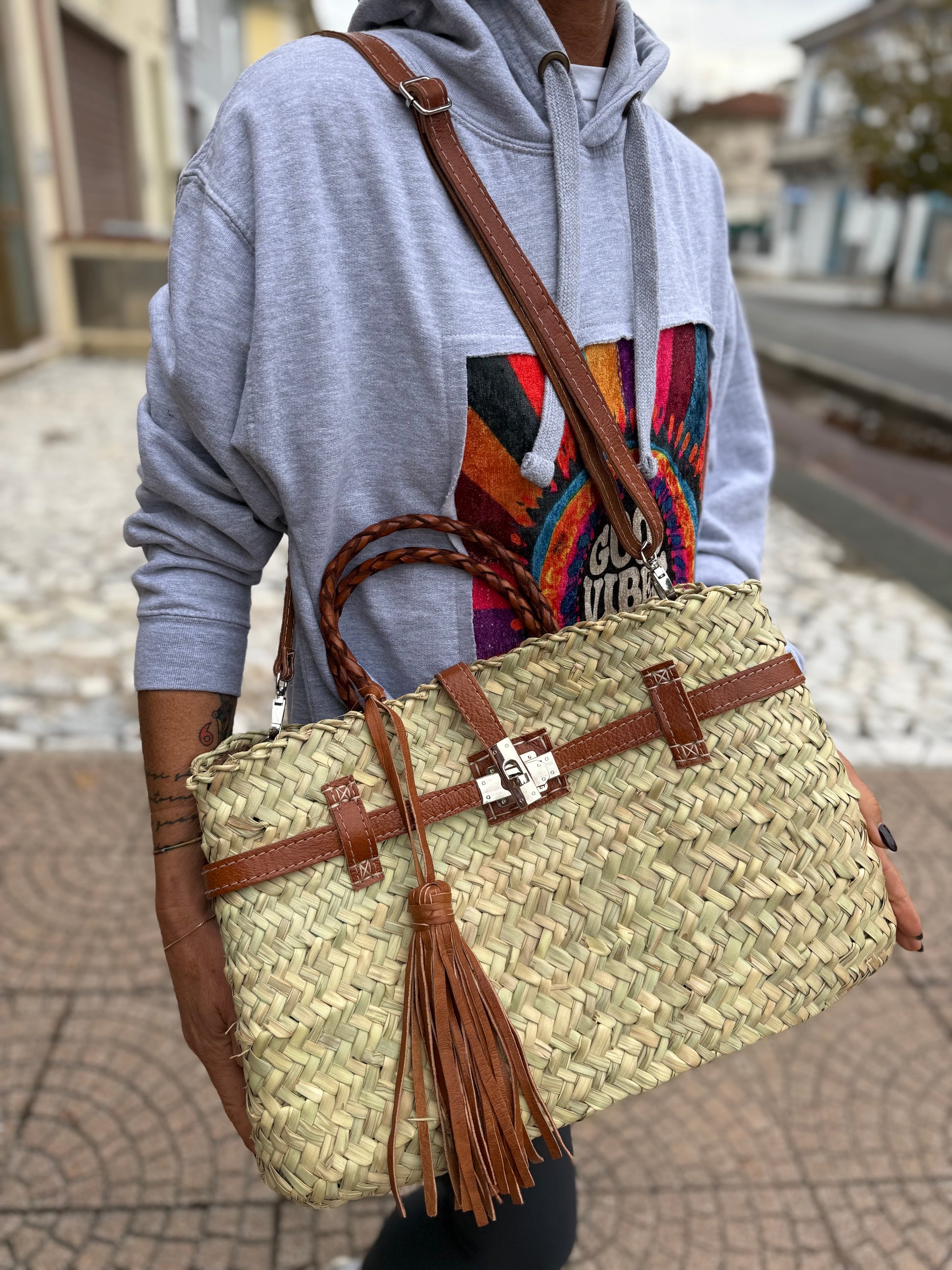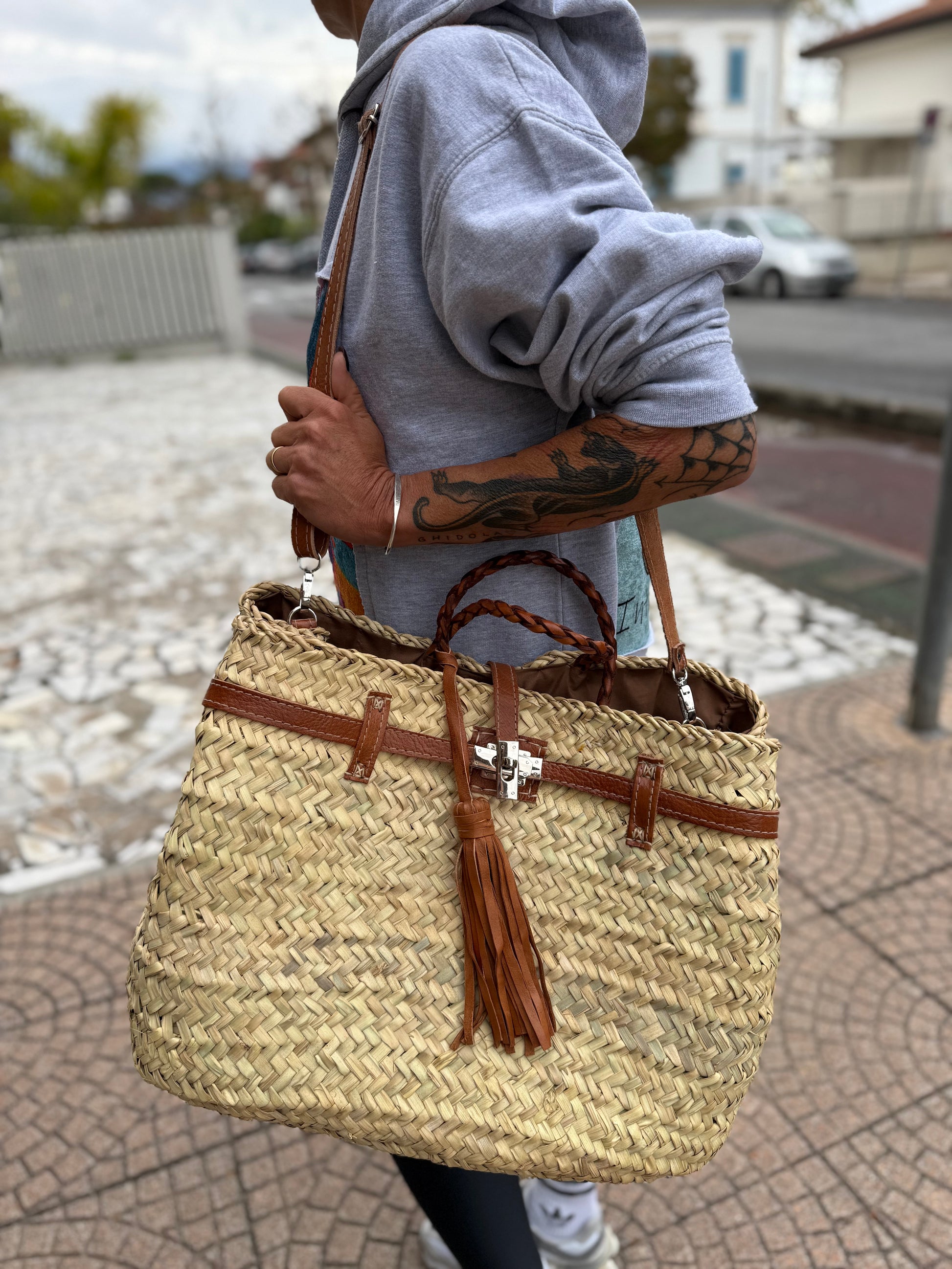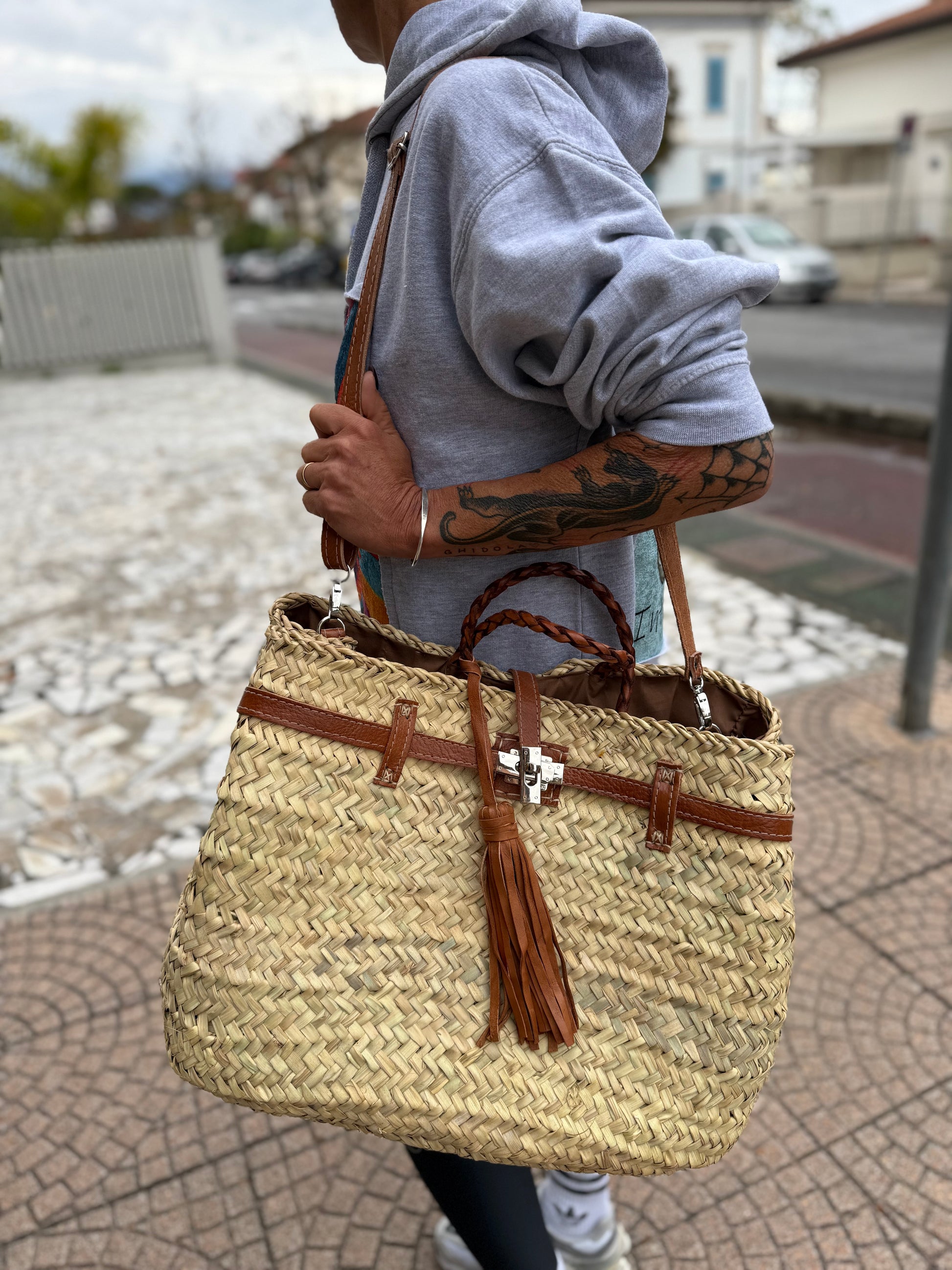 Borsa a mano realizzata in vera paglia di fieno con rifiniture in vera pelle.