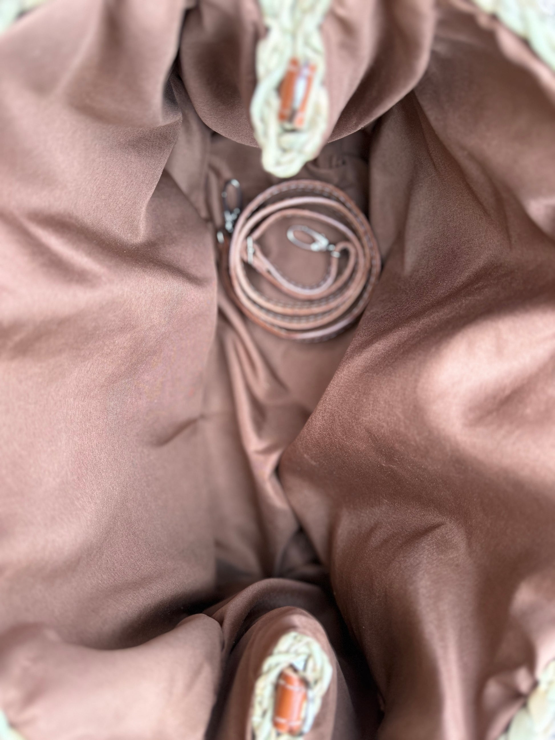 traccola removibile regolabile in pelle, manici intrecciati in pelle.