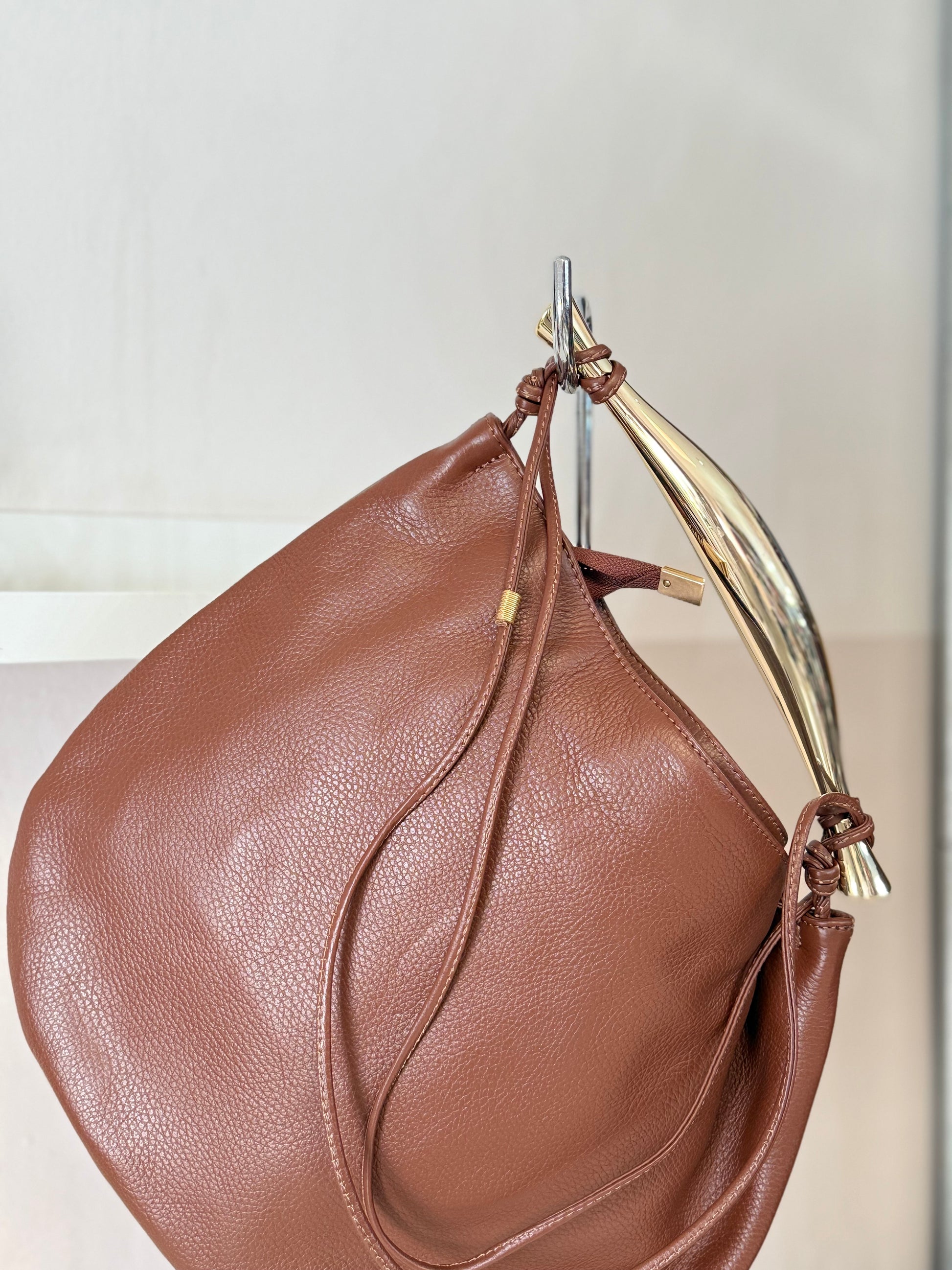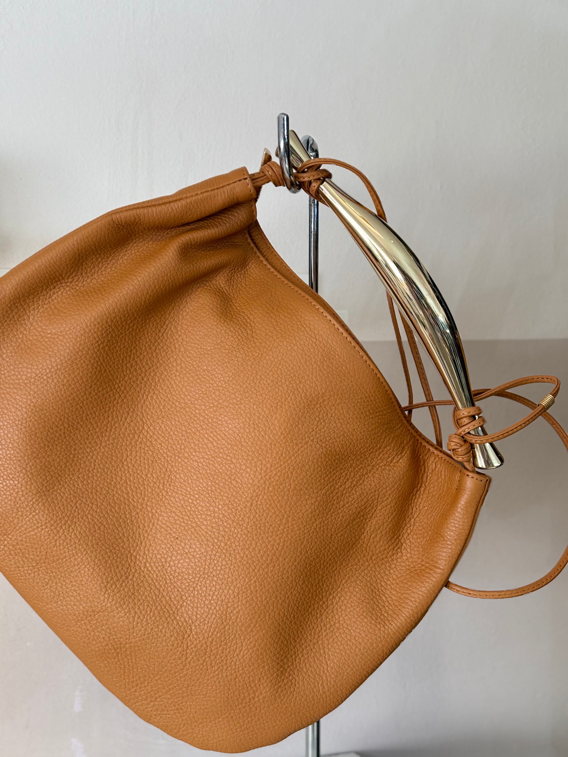 Borsa a mano in pelle di vitello botalato con manico in acciaio dorato, interno foderato in canvas con cerniera. dotata di tracolla regolabile