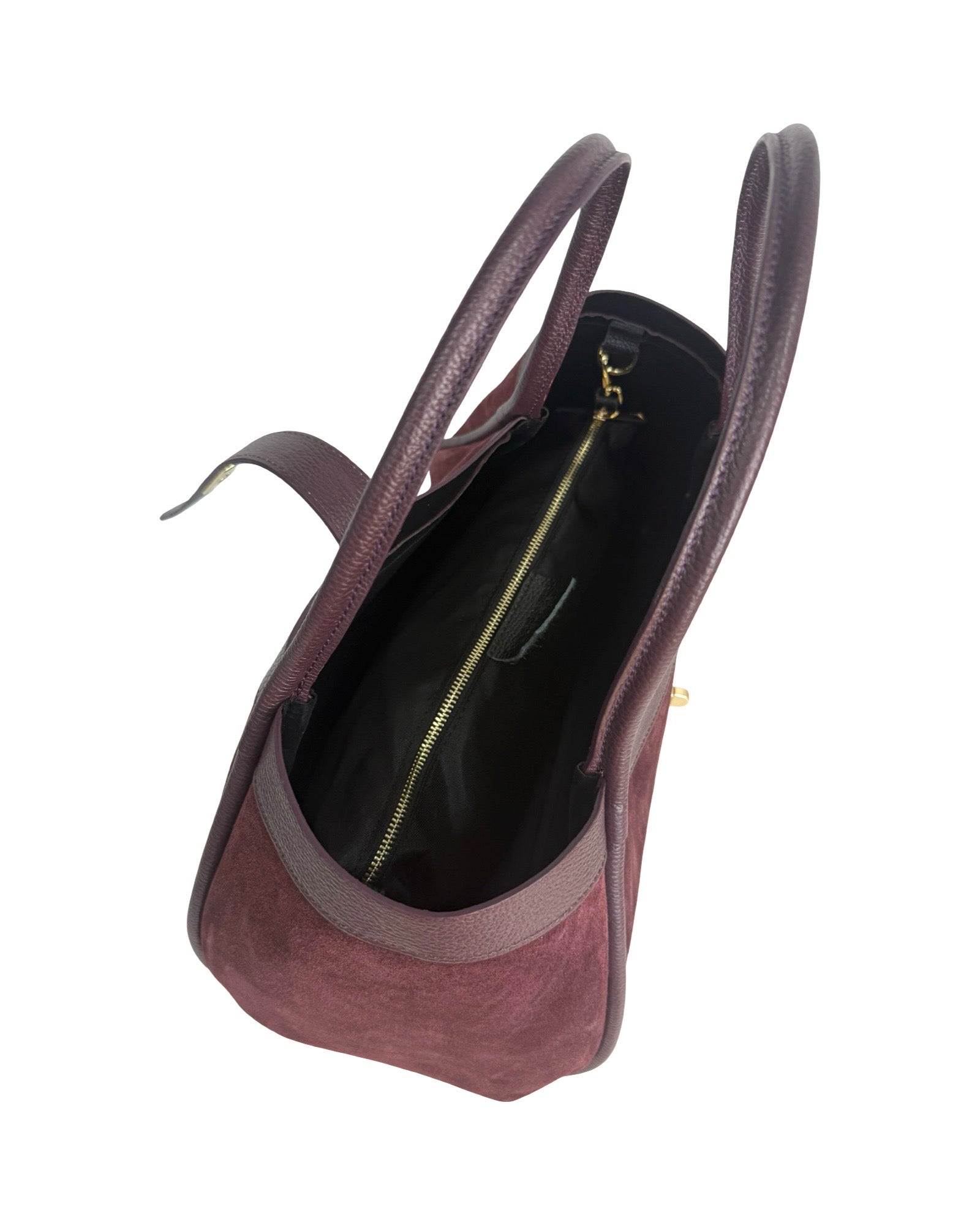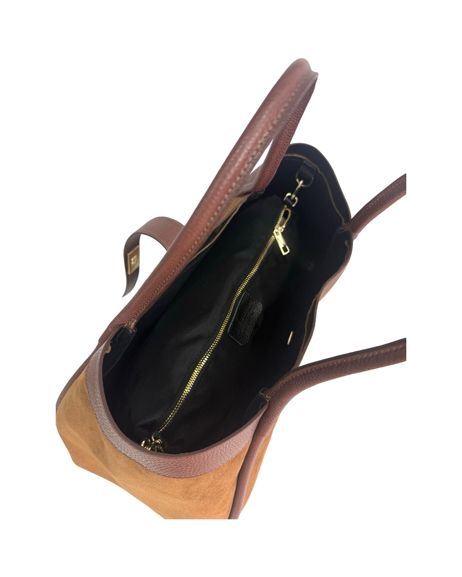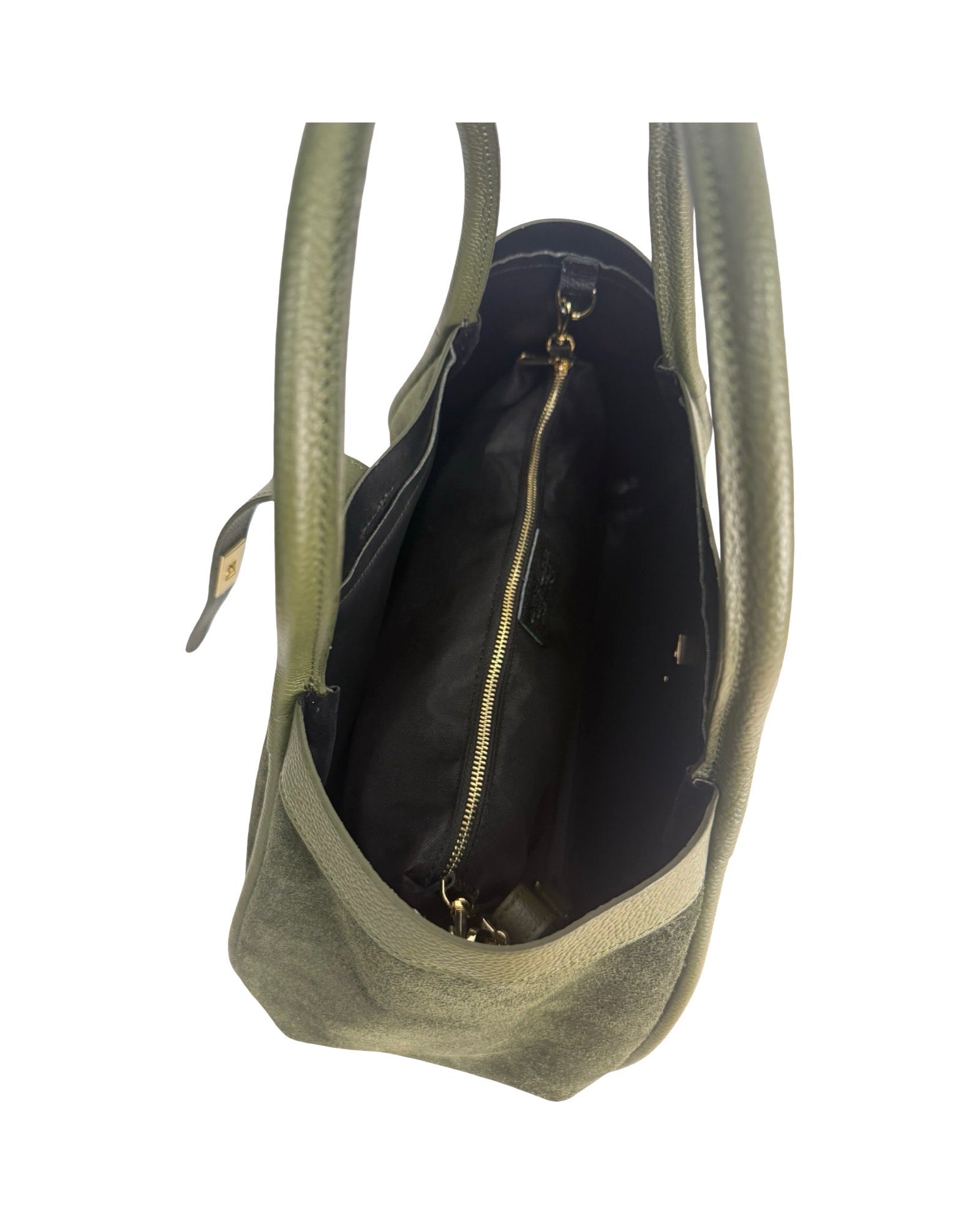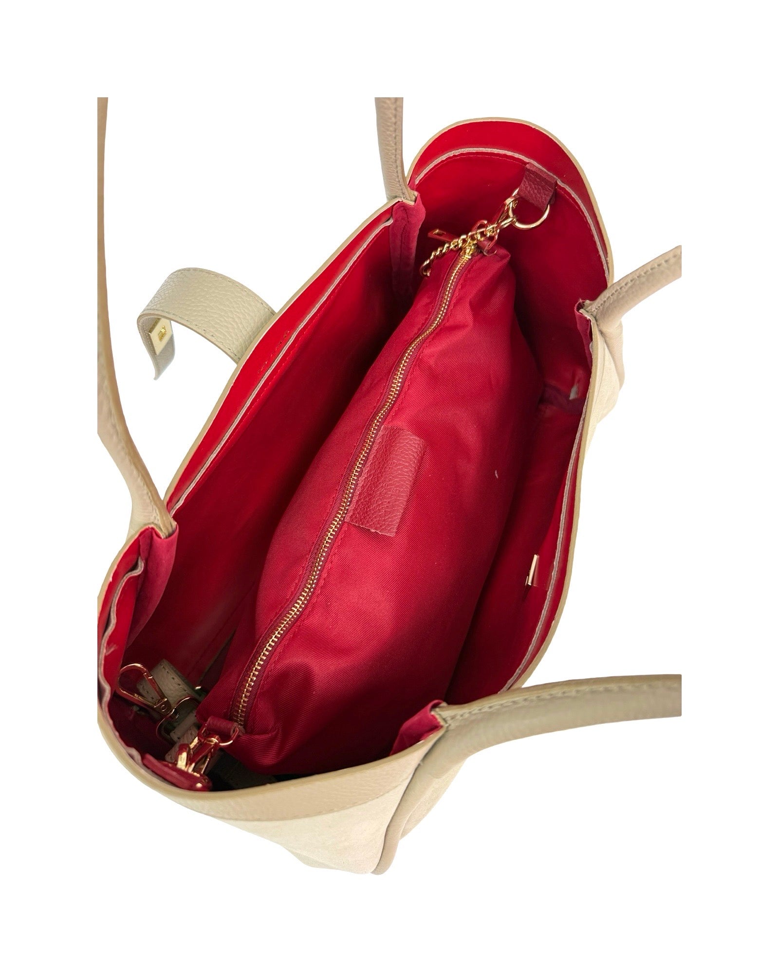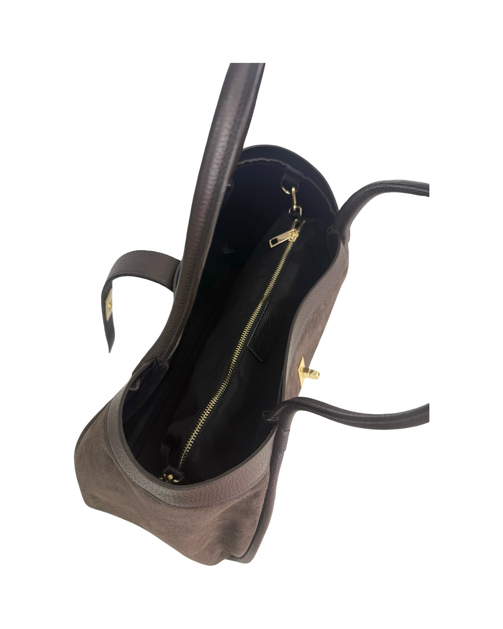 Borsa a spalla in pelle di vitello scamosciata, rifinita in pelle di vitello botalato, poschette interna e tracolla removibile e regolabile.
