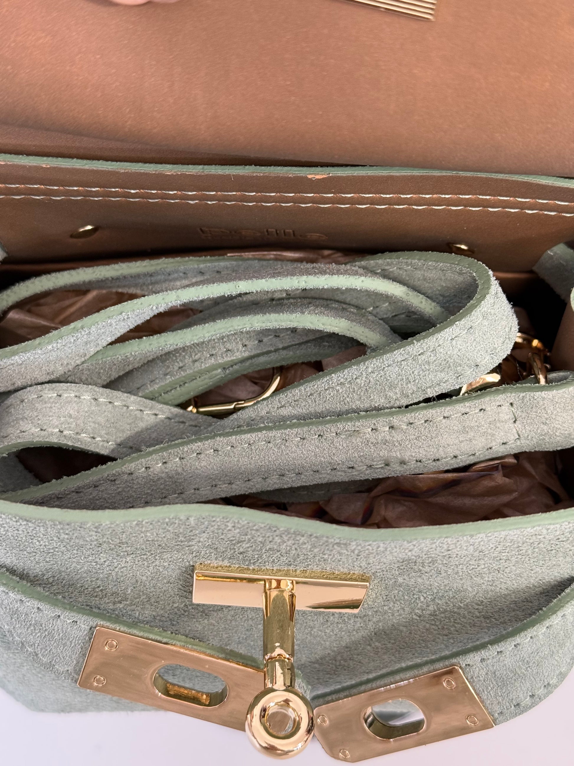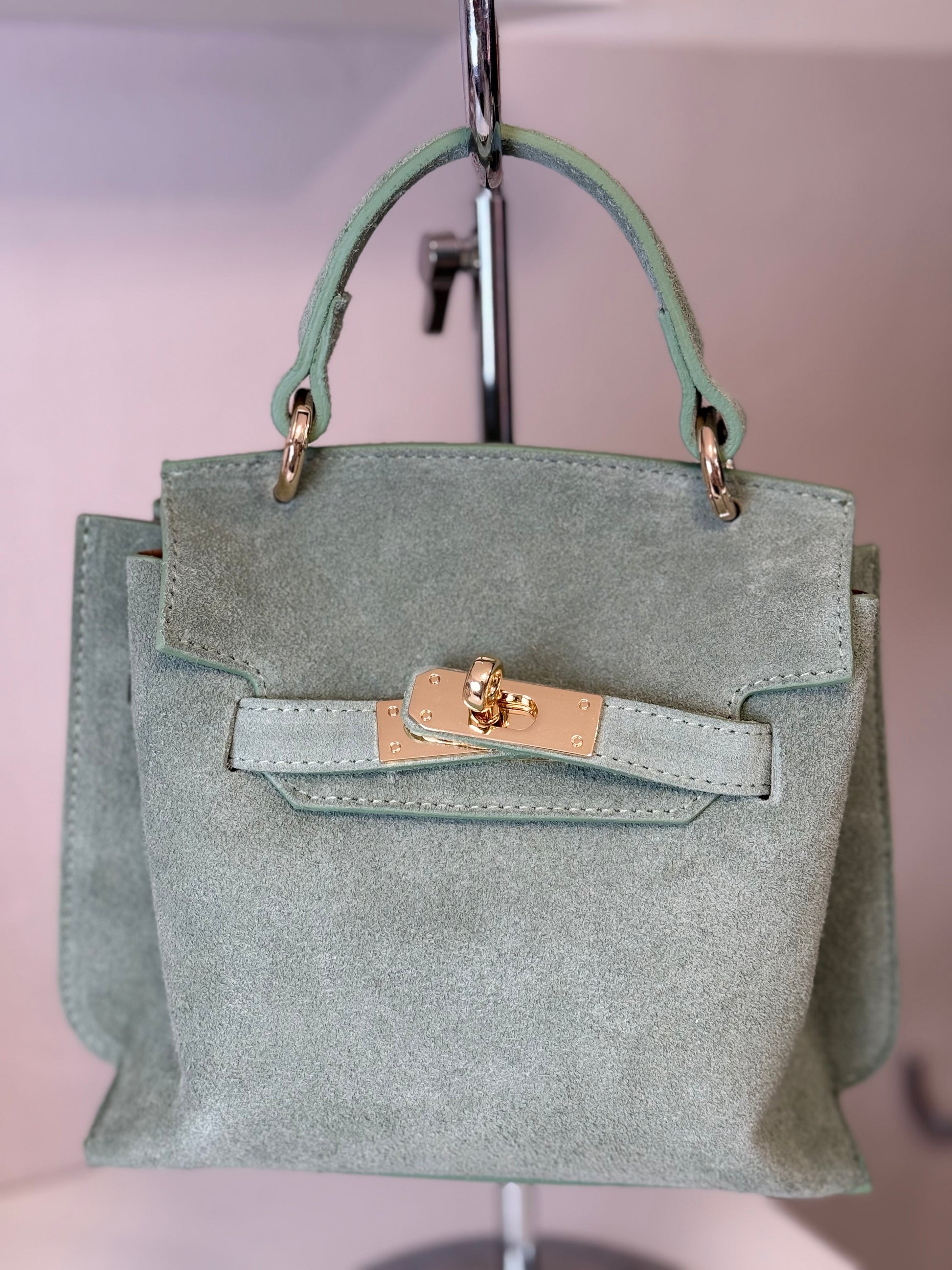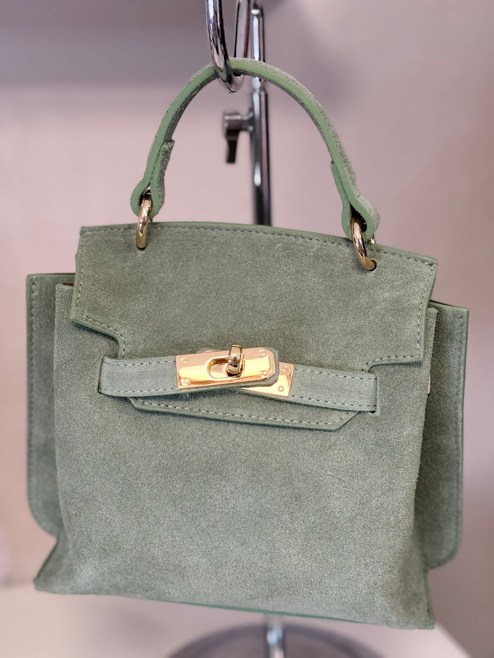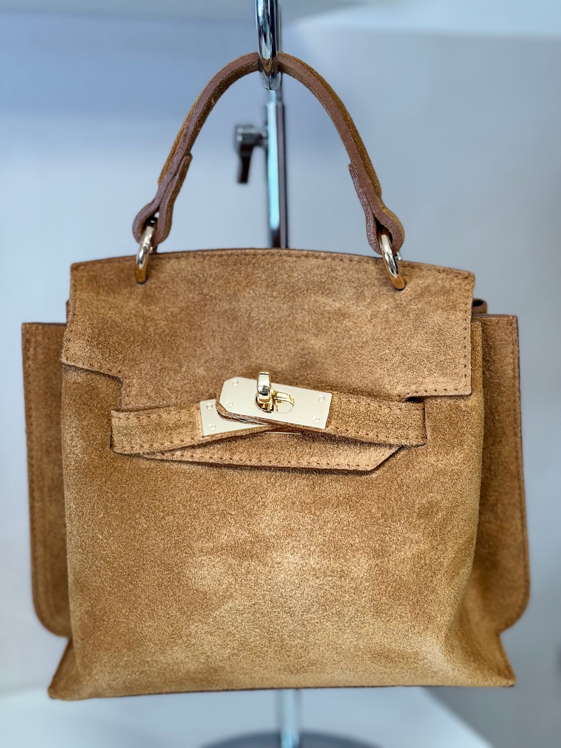 Borsa a mano realizzata in pelle di vitello scamosciato, con tracolla removibile e regolabile.