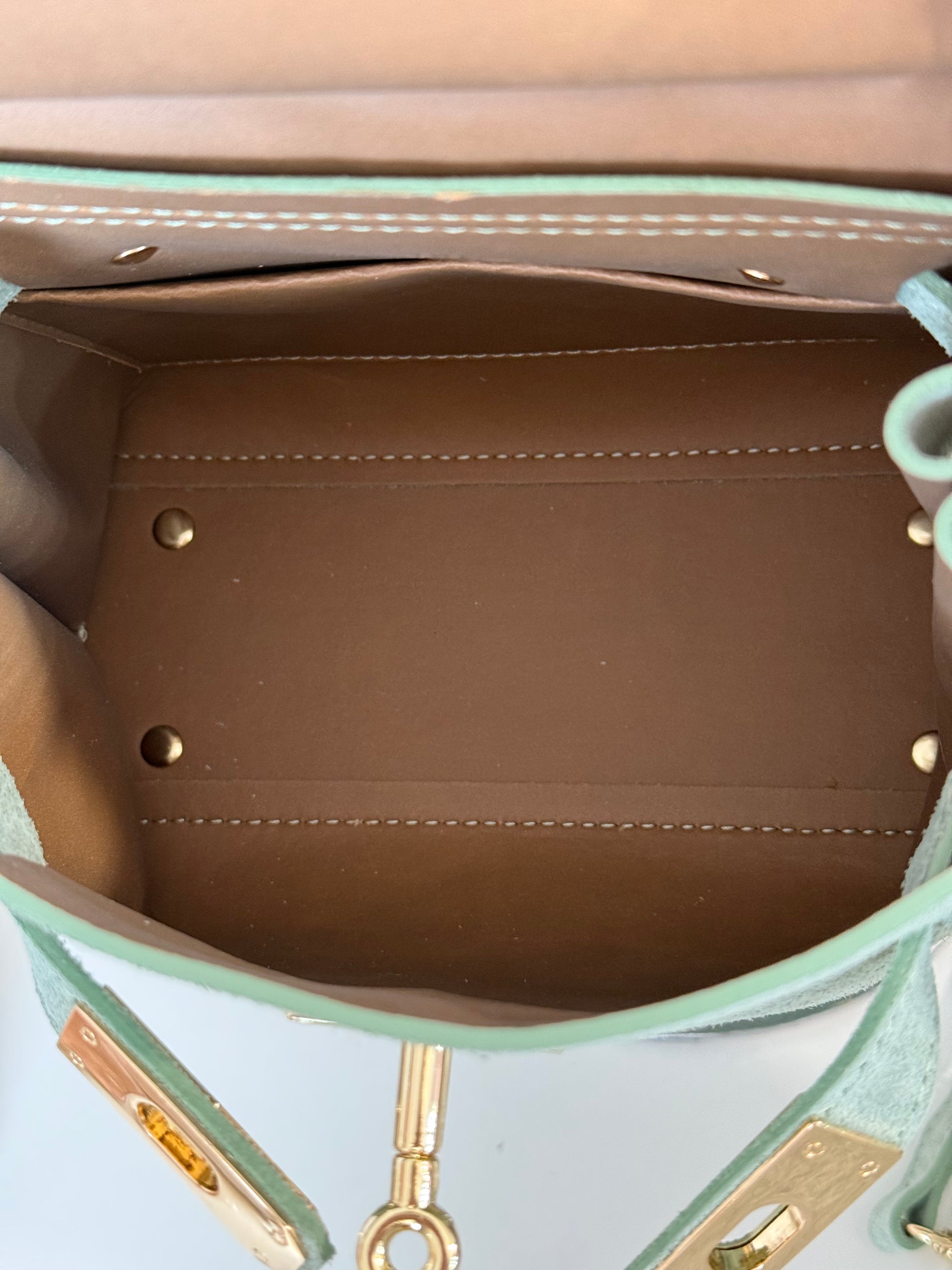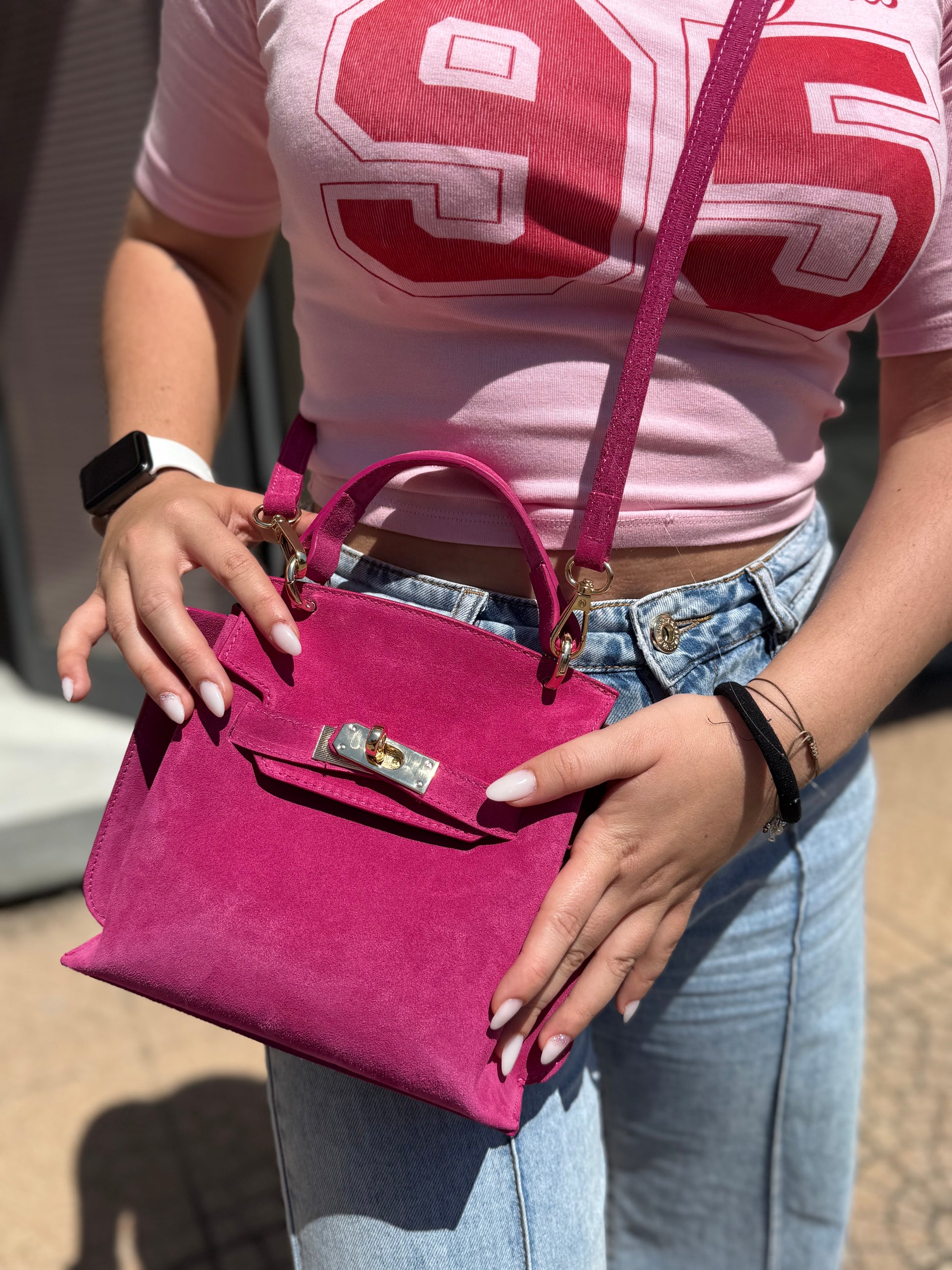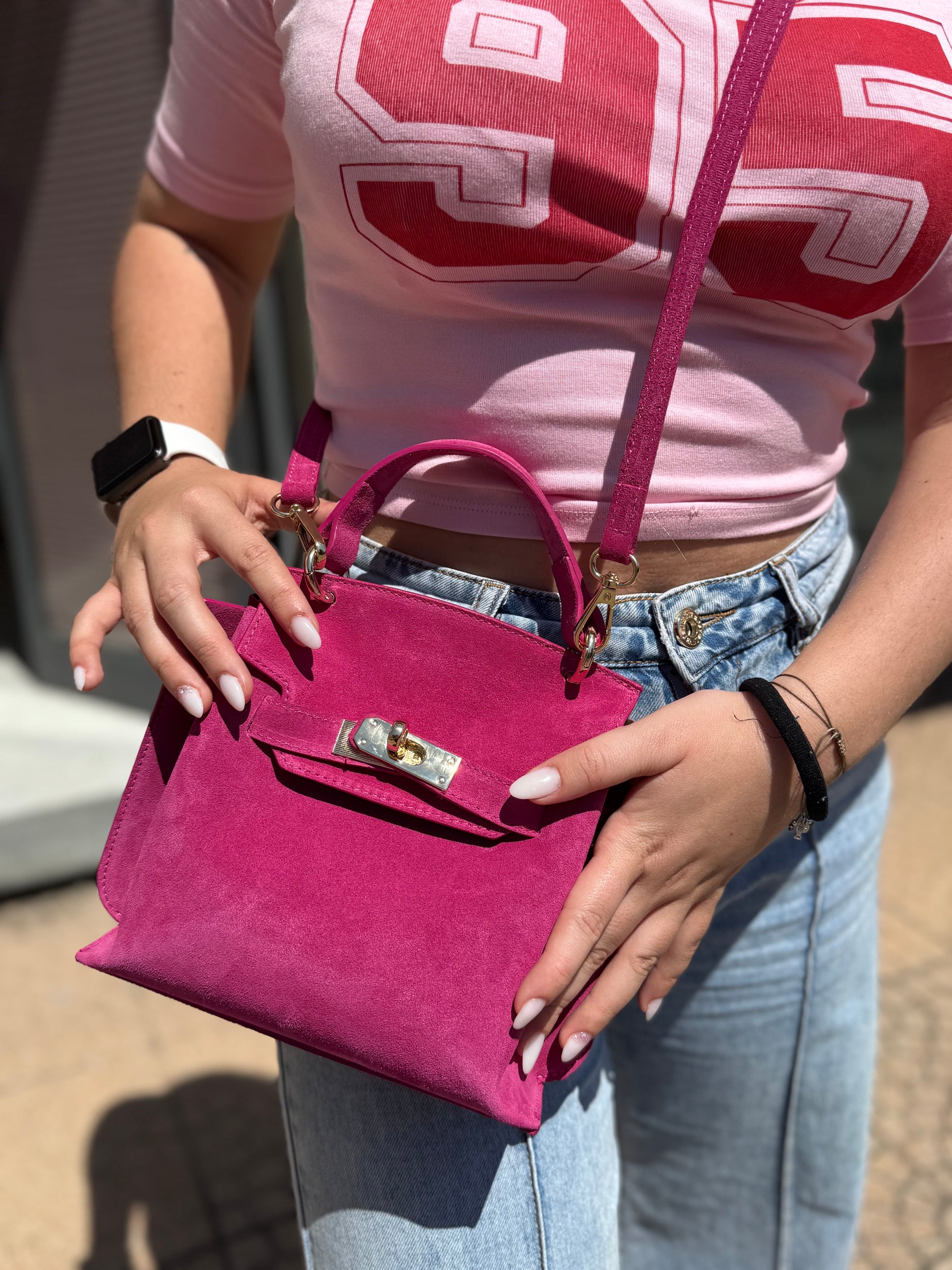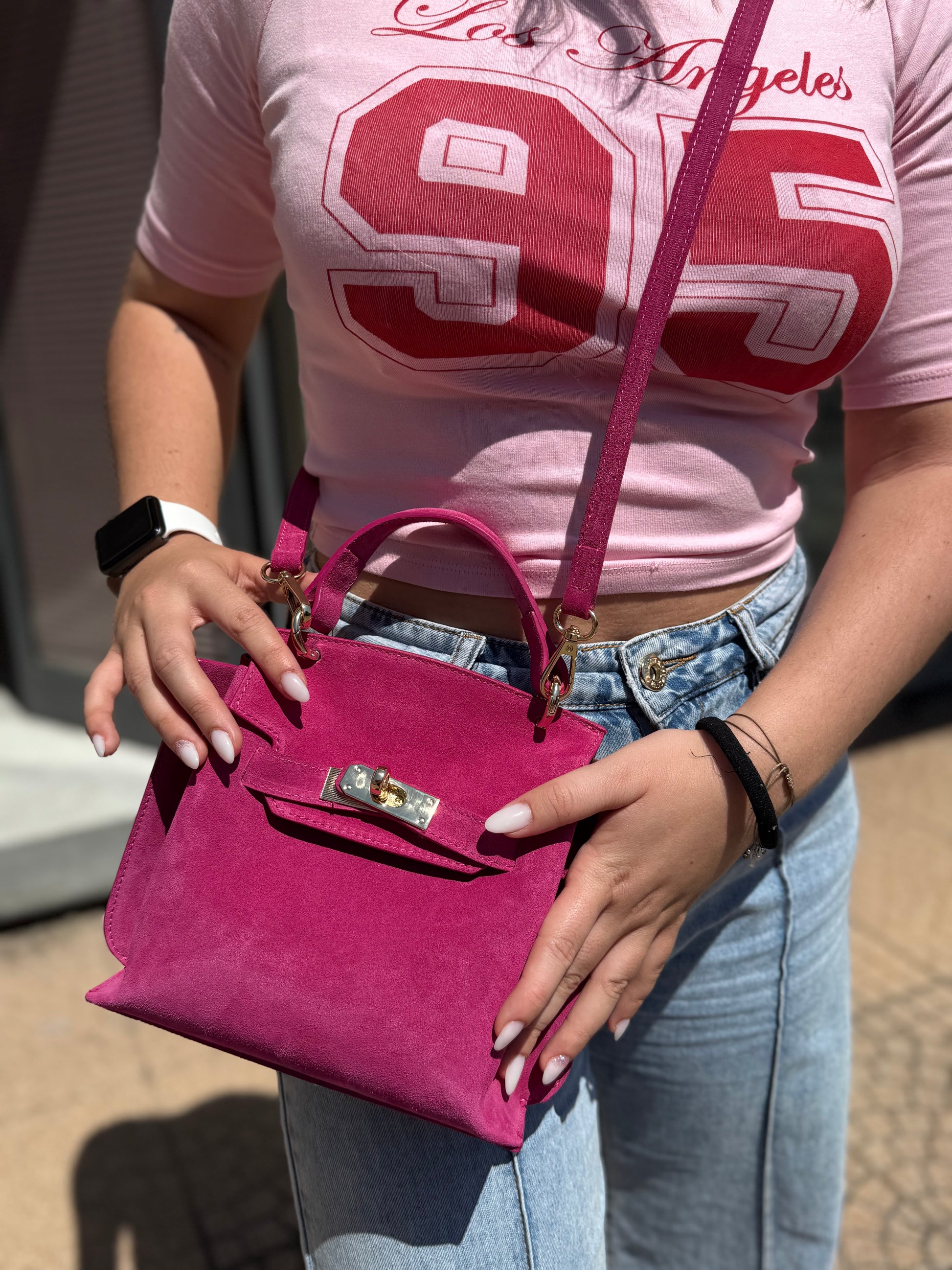 Borsa a mano realizzata in pelle di vitello scamosciato, con tracolla removibile e regolabile.