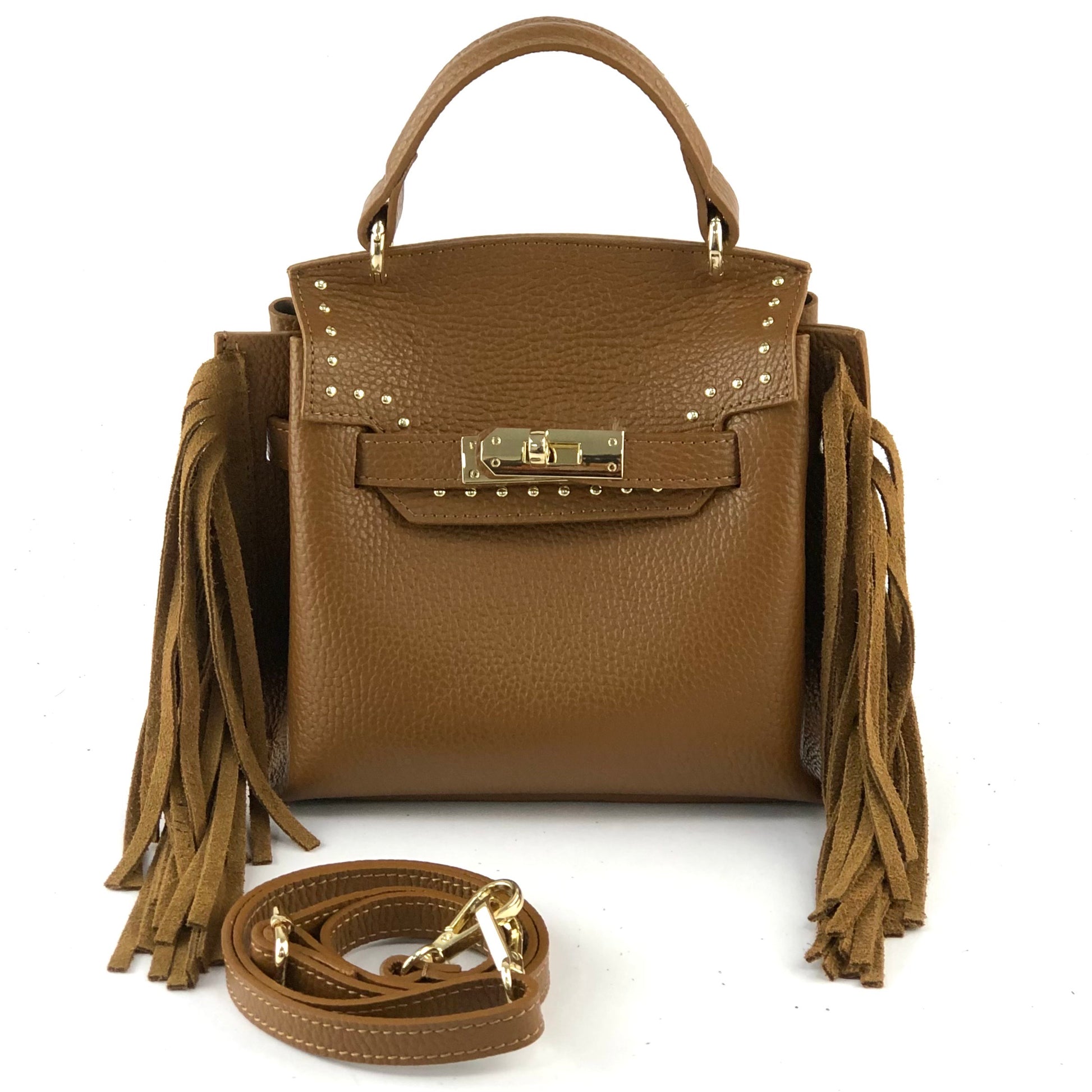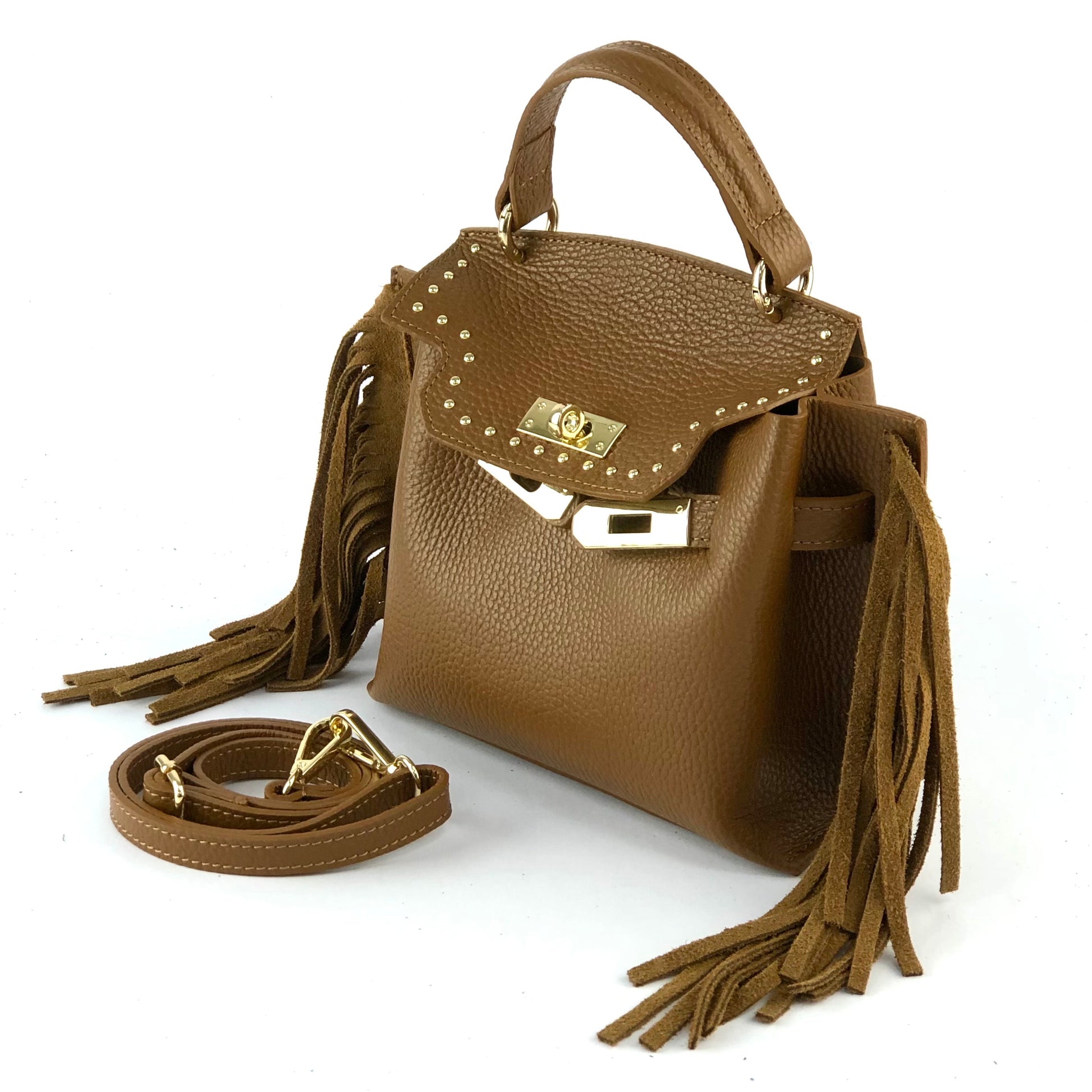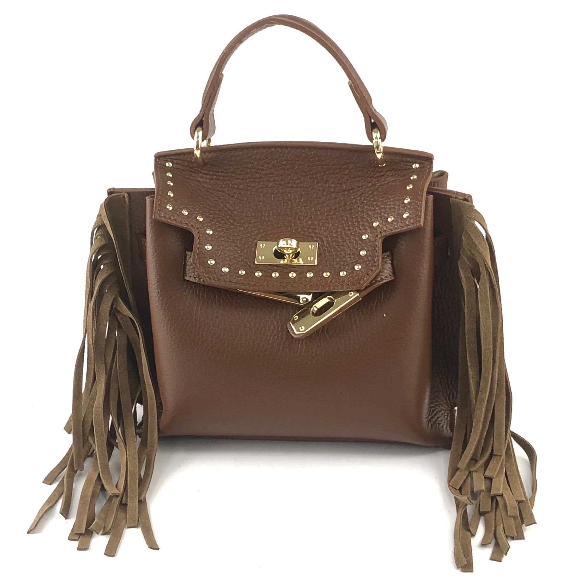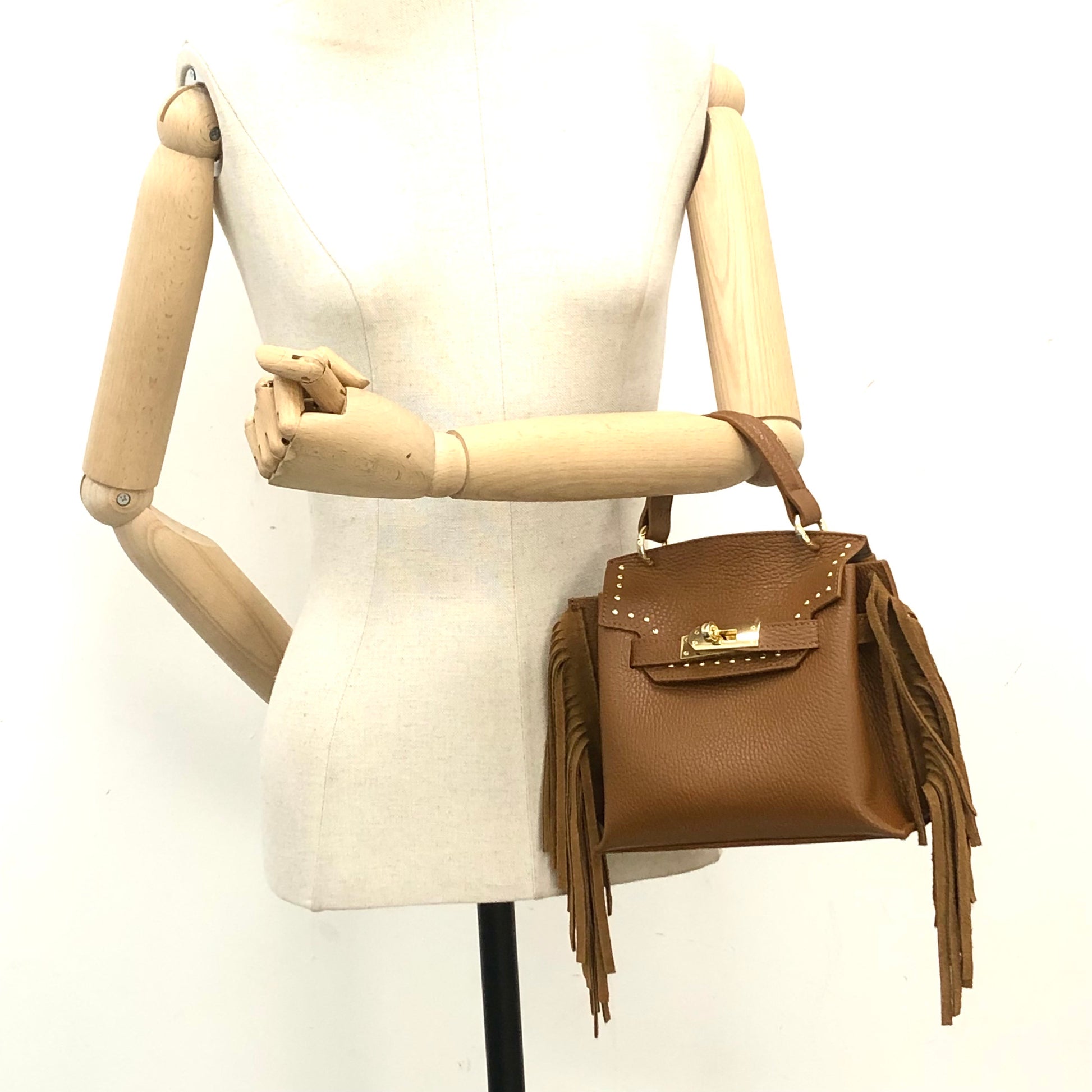 Borsa a mano in pelle di vitello botalato con frange, tracolla removibile e regolabile.