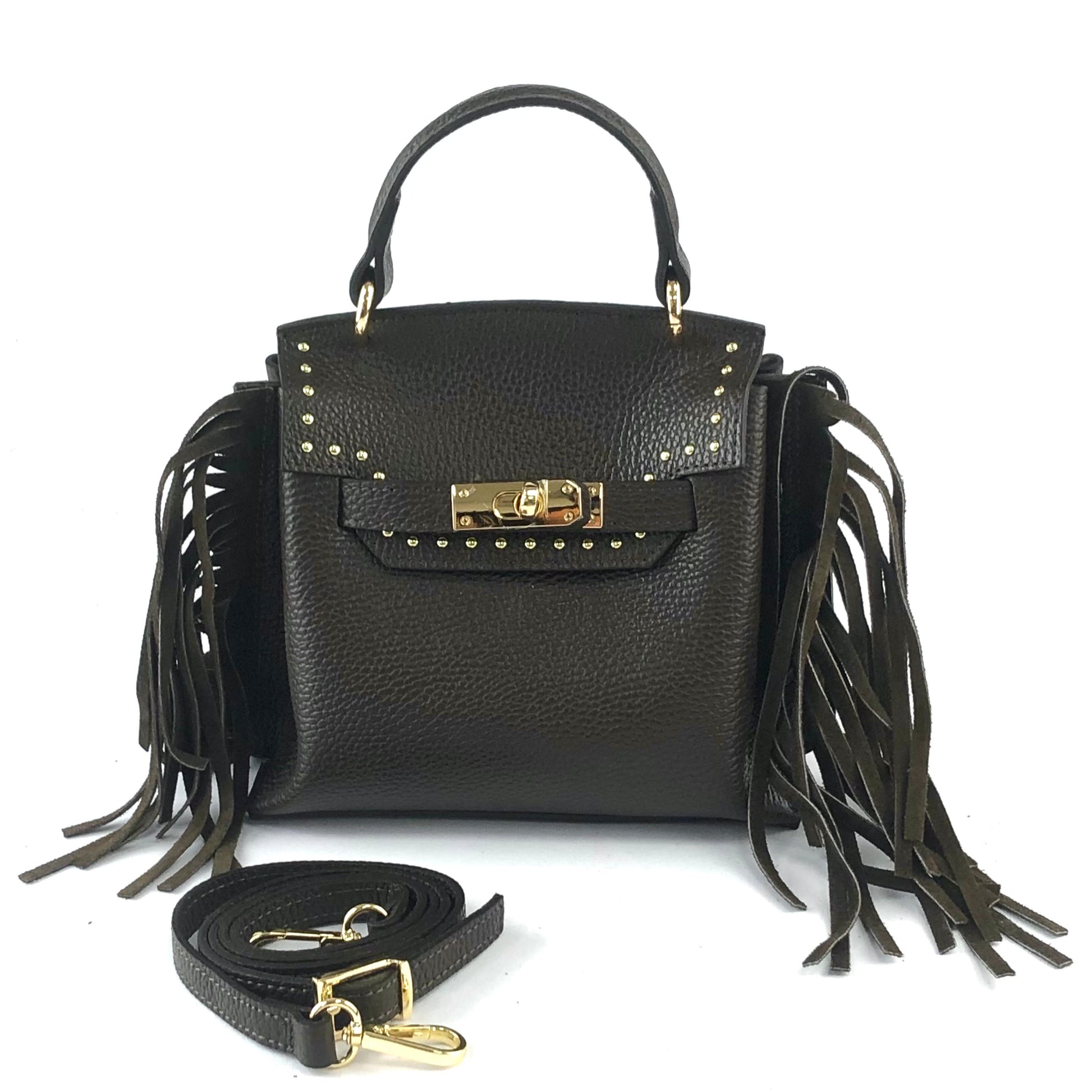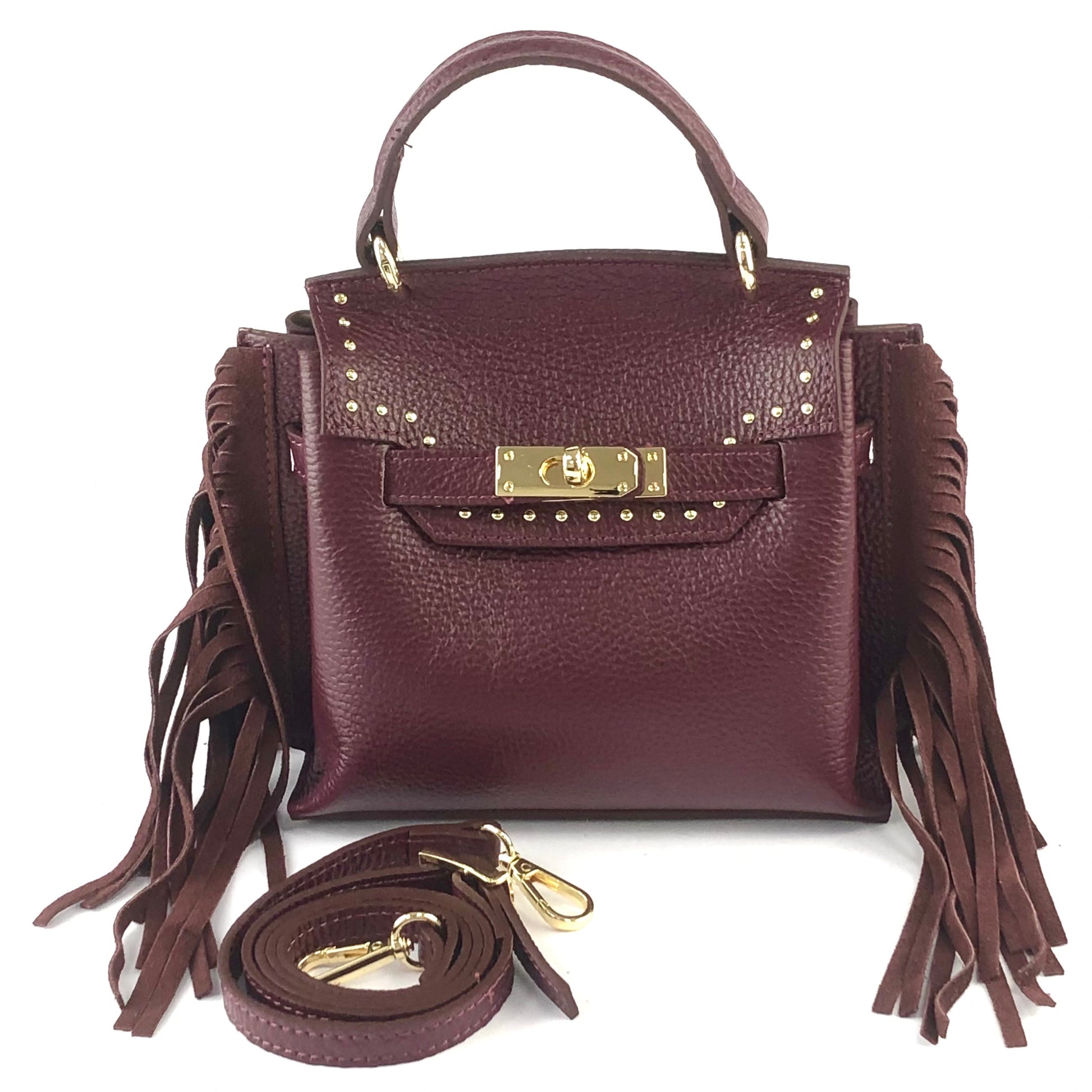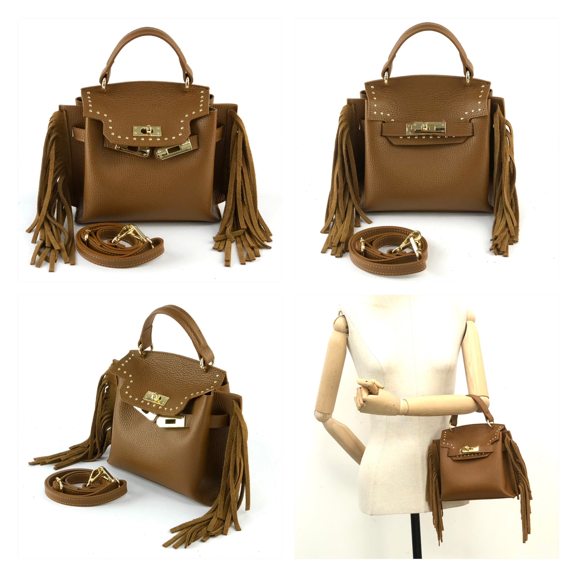 Borsa a mano in pelle di vitello botalato con frange, tracolla removibile e regolabile.