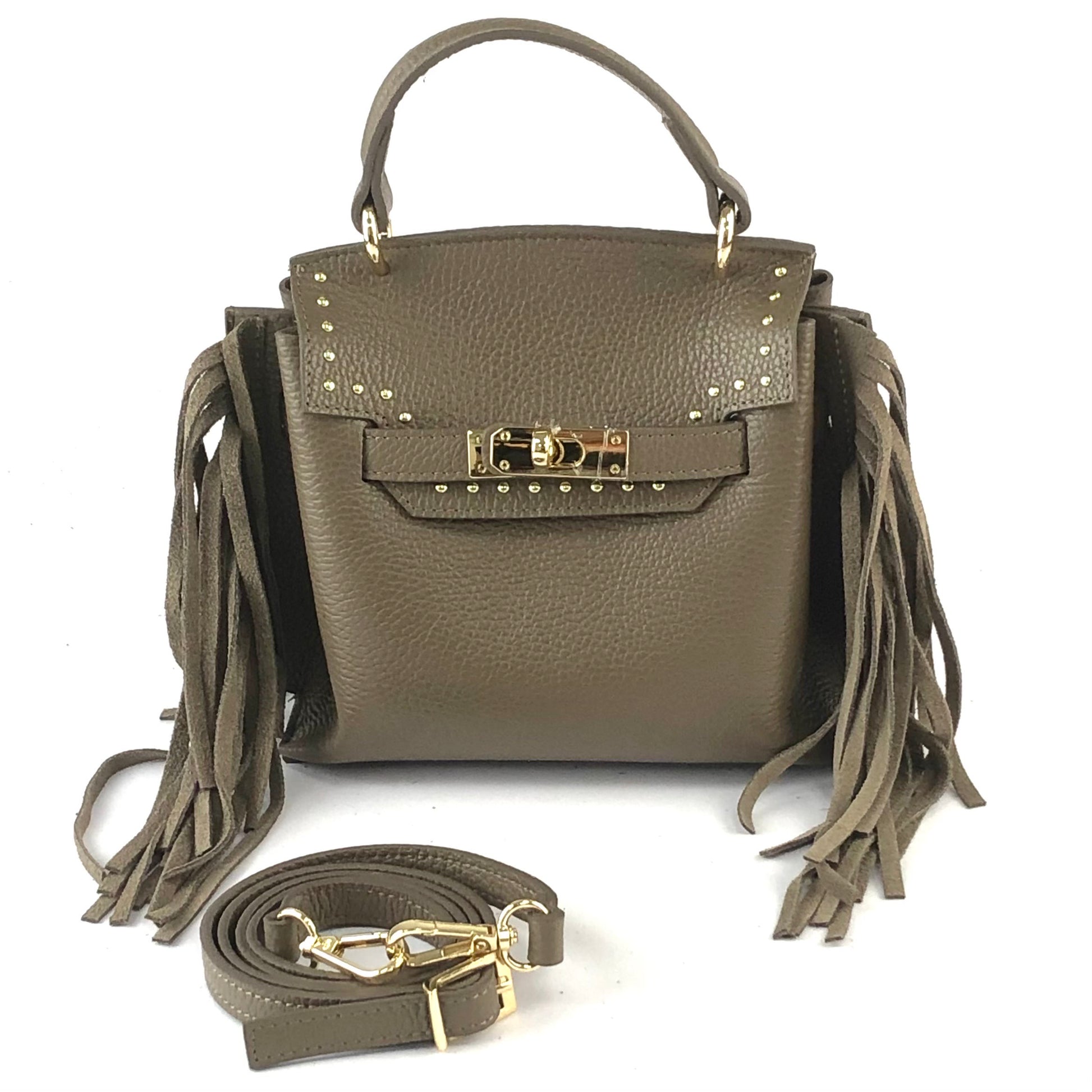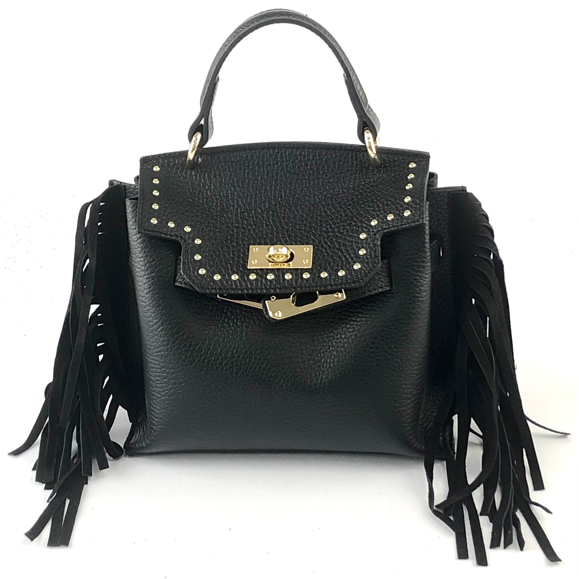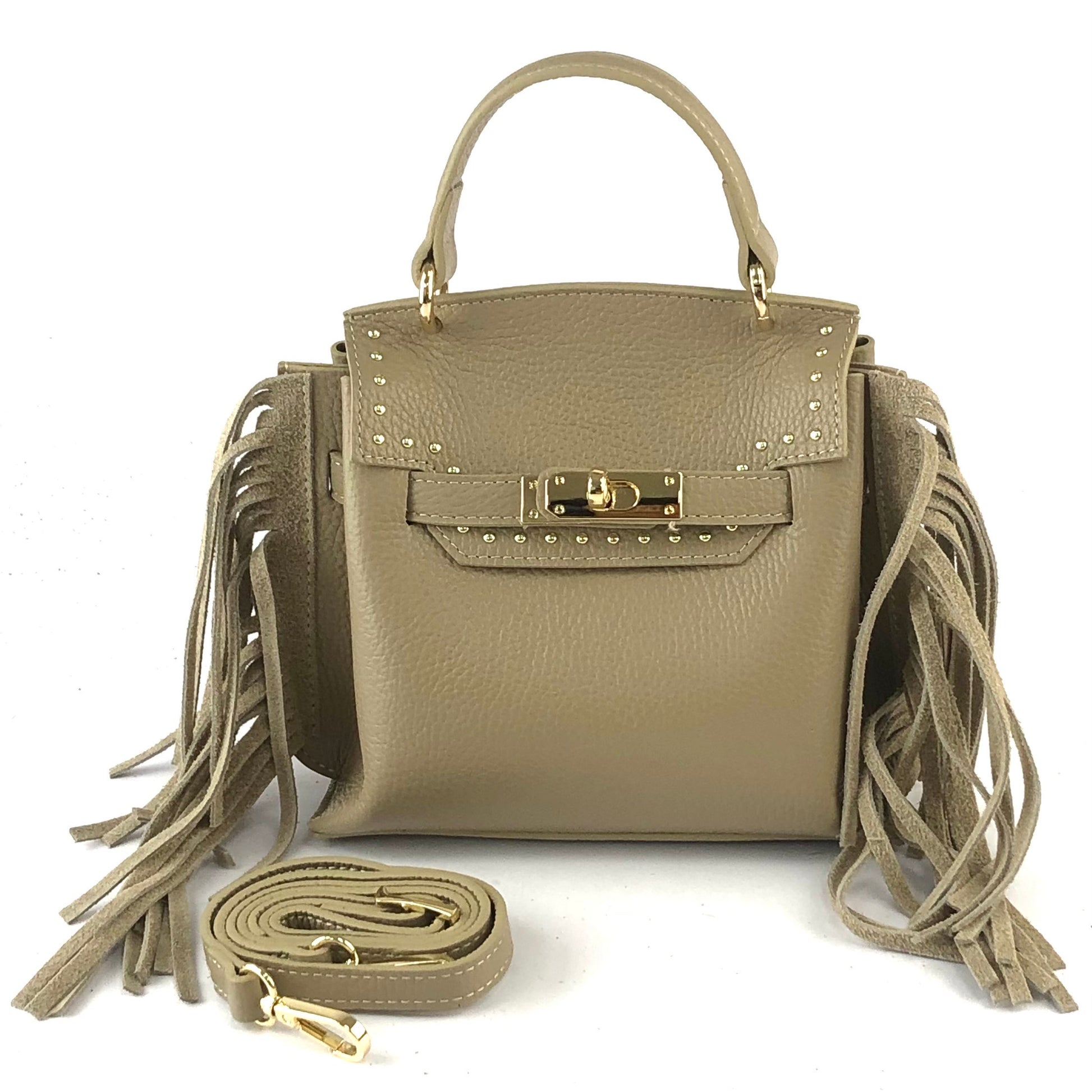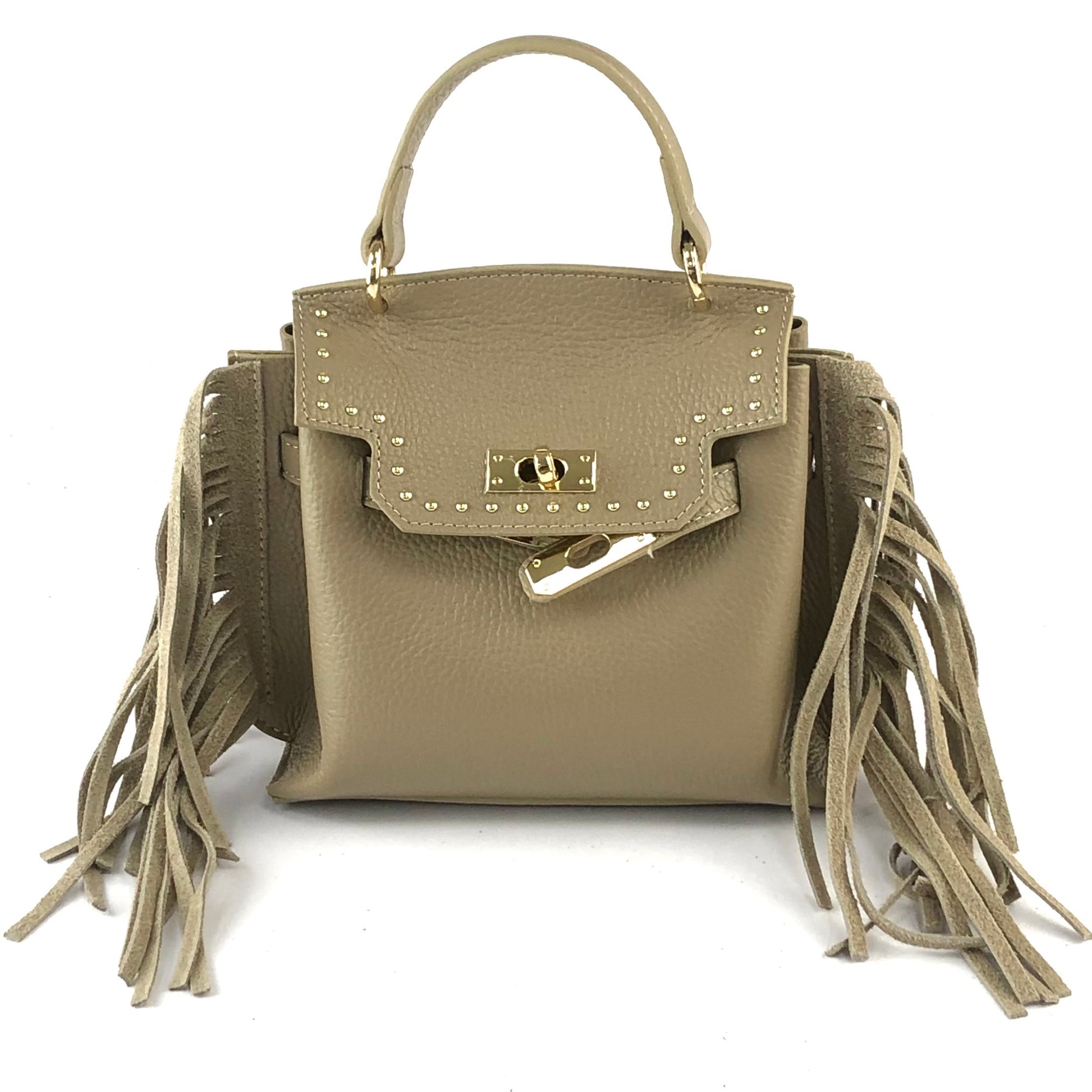 Borsa a mano in pelle di vitello botalato con frange, tracolla removibile e regolabile.