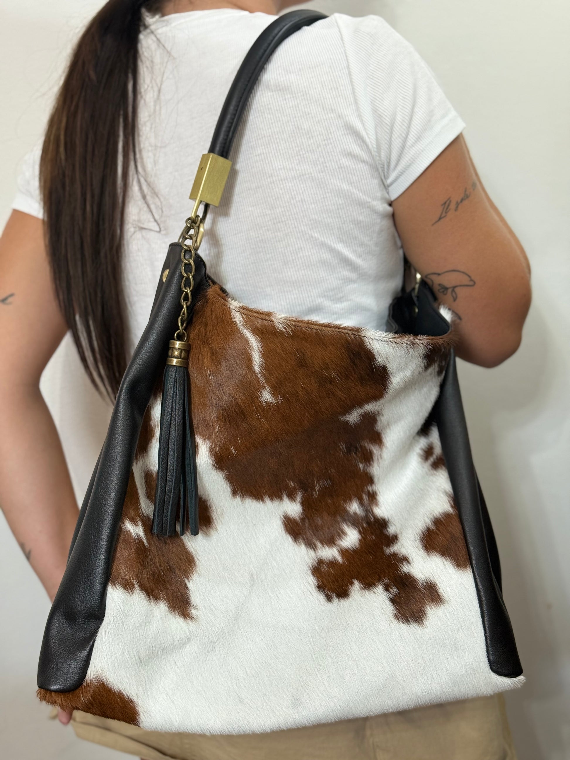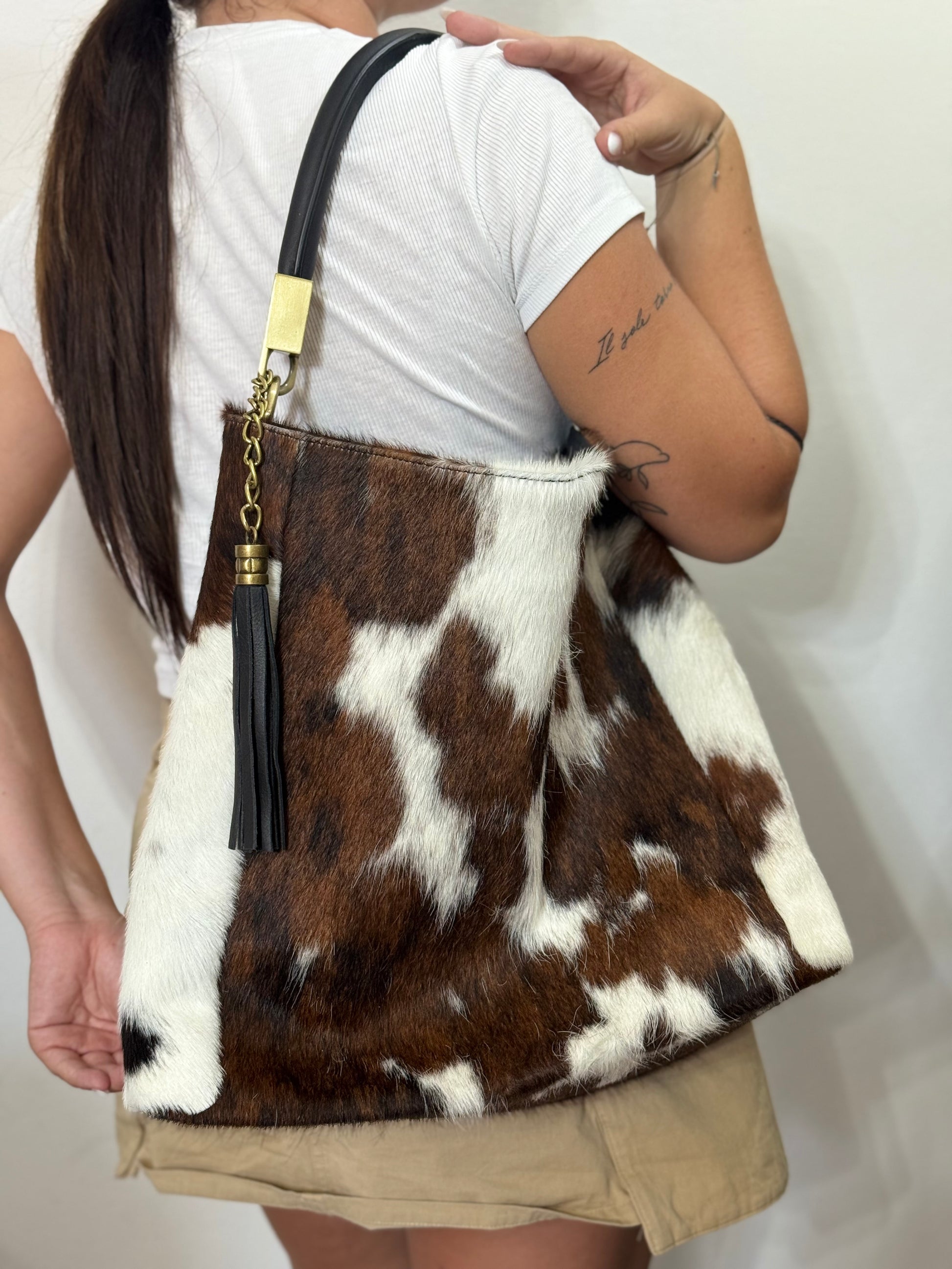 Borsa a spalla realizzata in vero cavallino con rifiniture in pelle di vitello liscio.