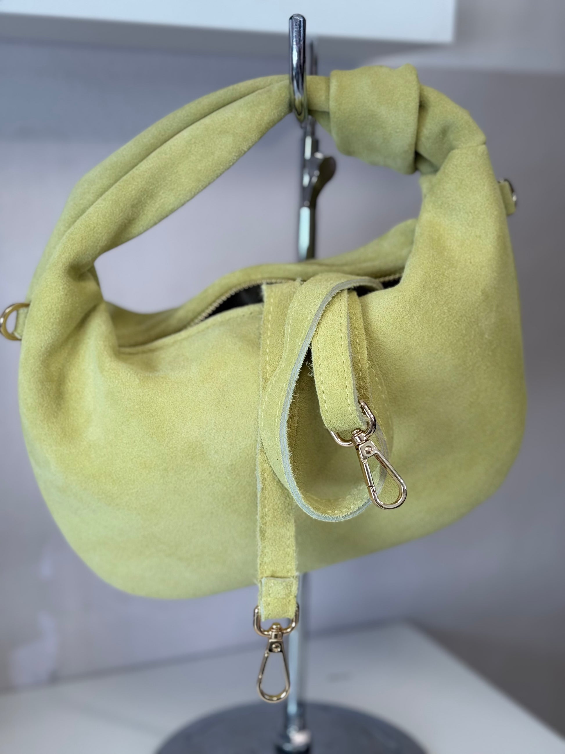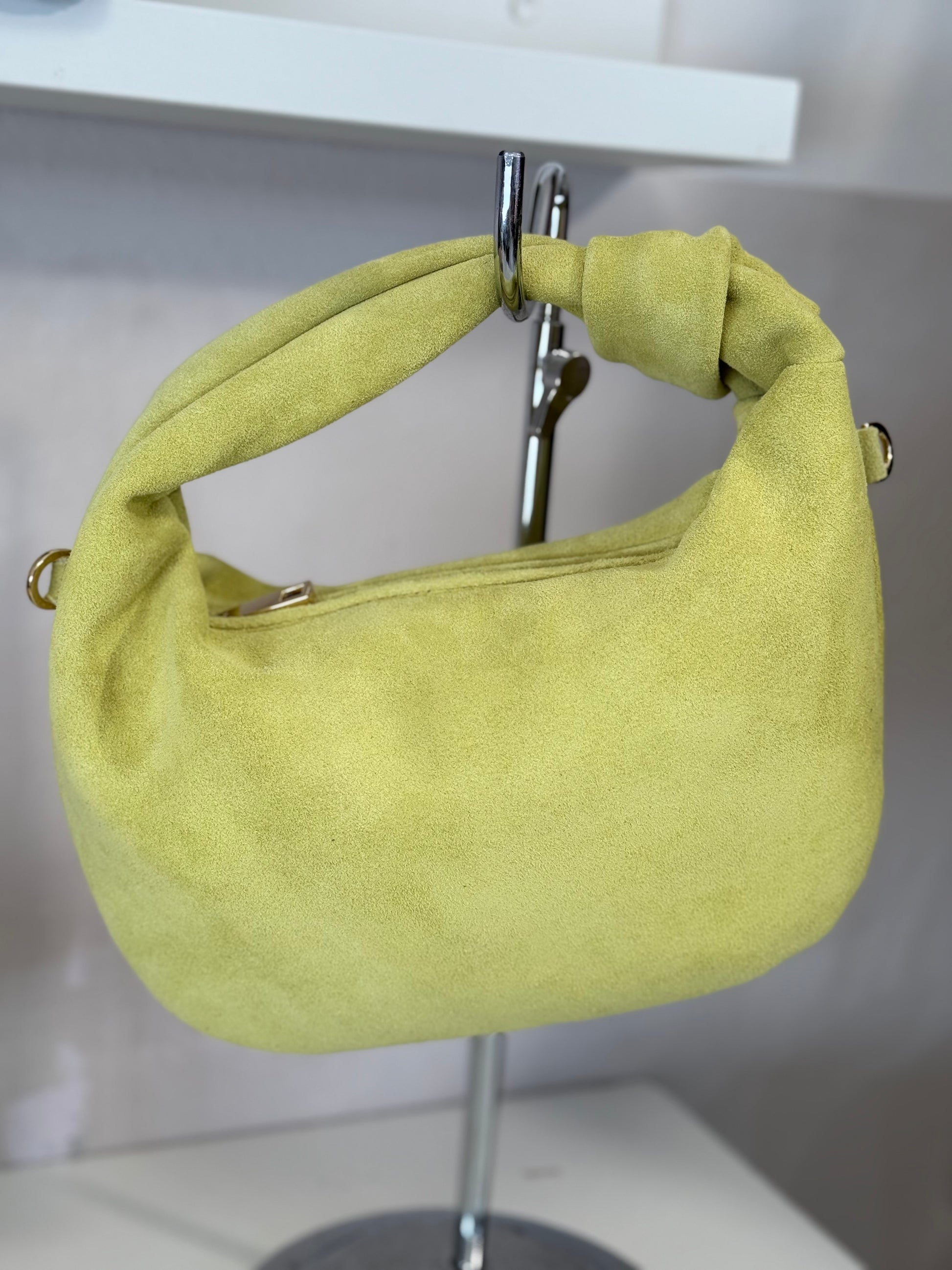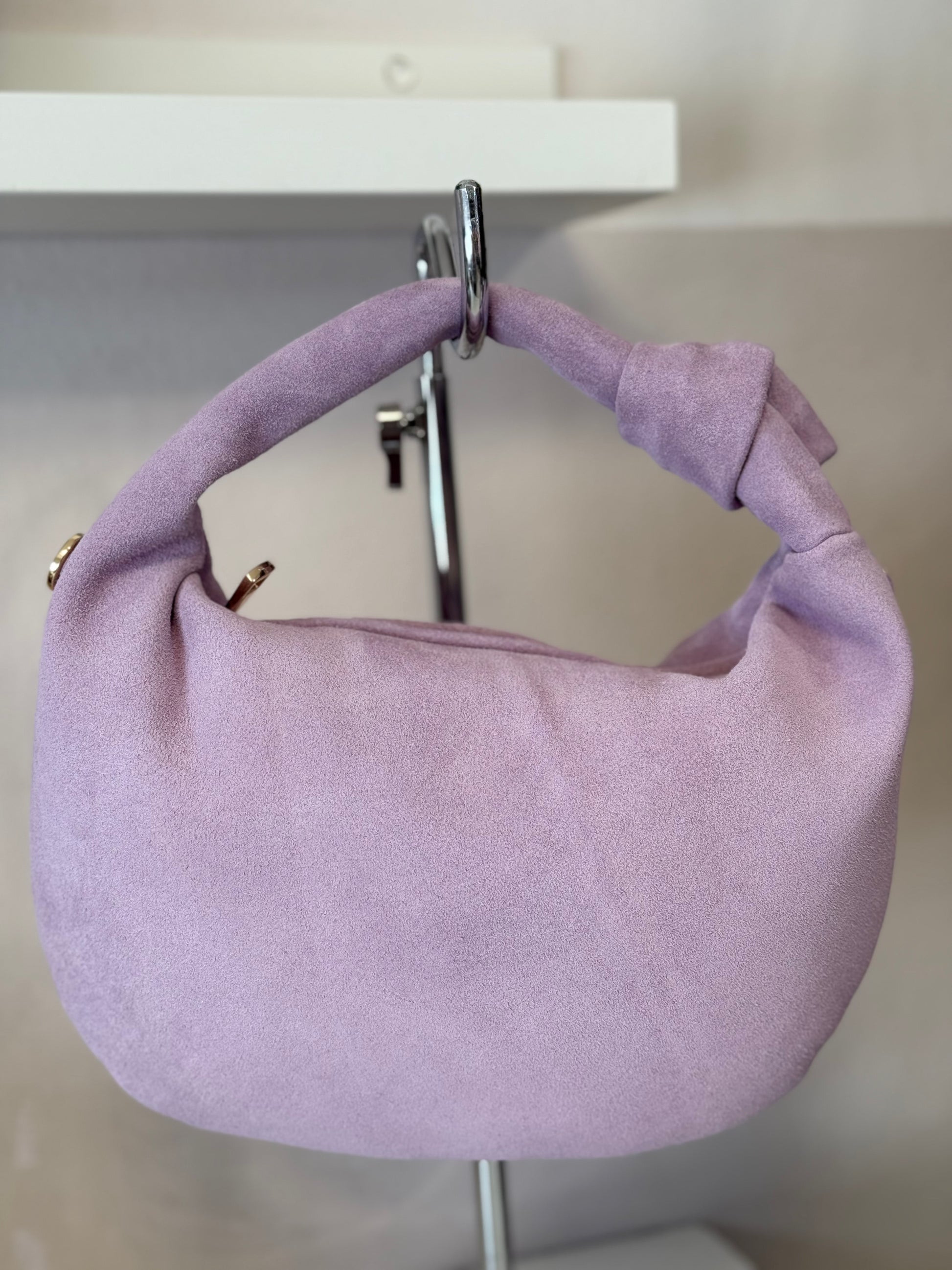 Borsa a mano realizzata in pelle di vitello scamosciato, con tracolla removibile e regolabile.