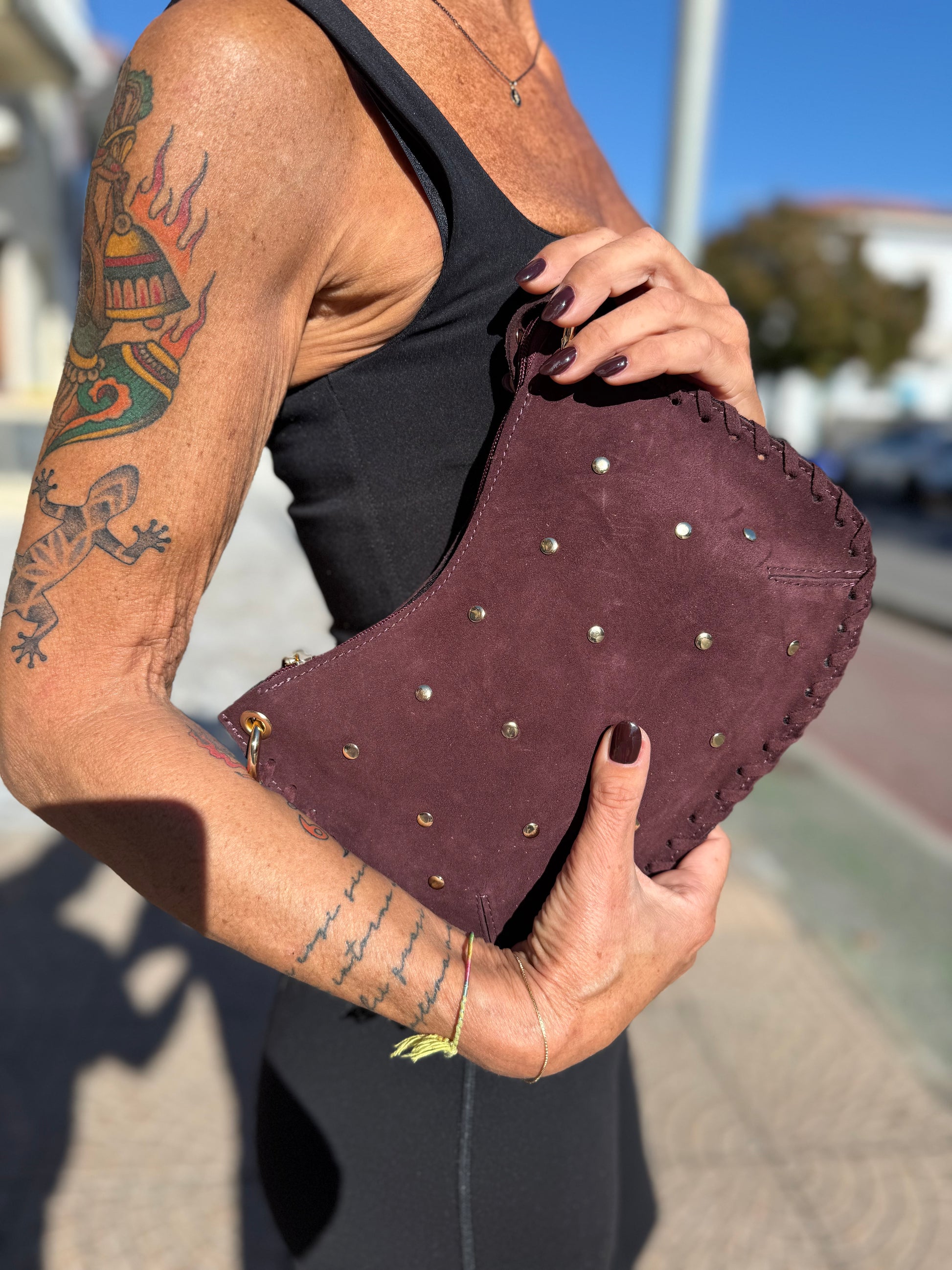 Borsa a spalla in pelle di vitello scamosciato, impunturata a mano in fettuccia di camoscio con chiusura a cerniera