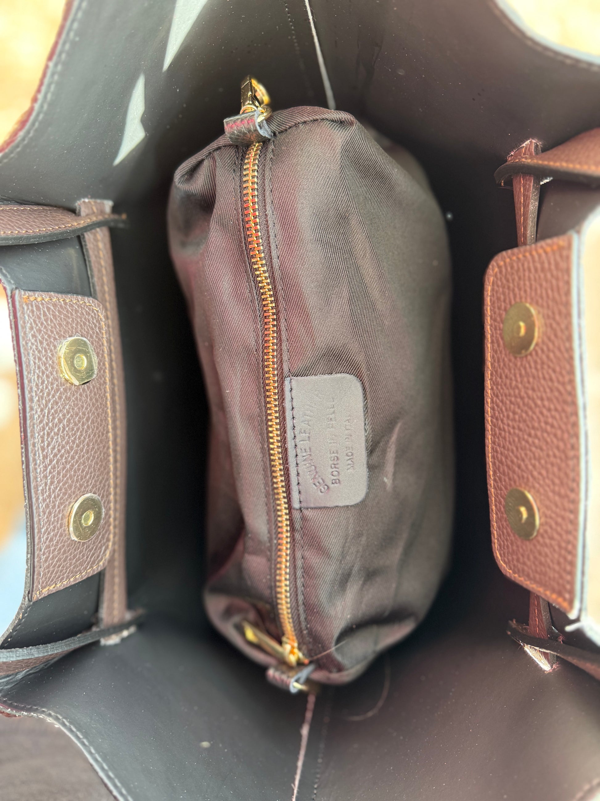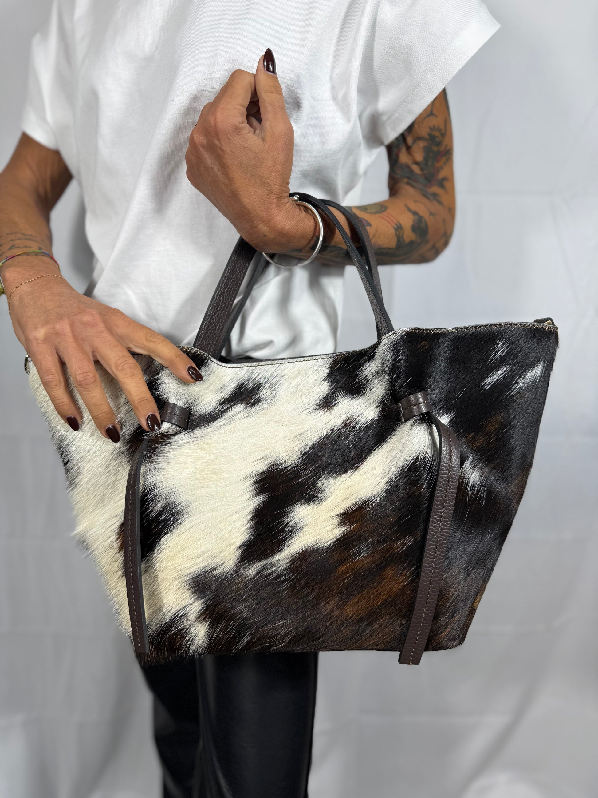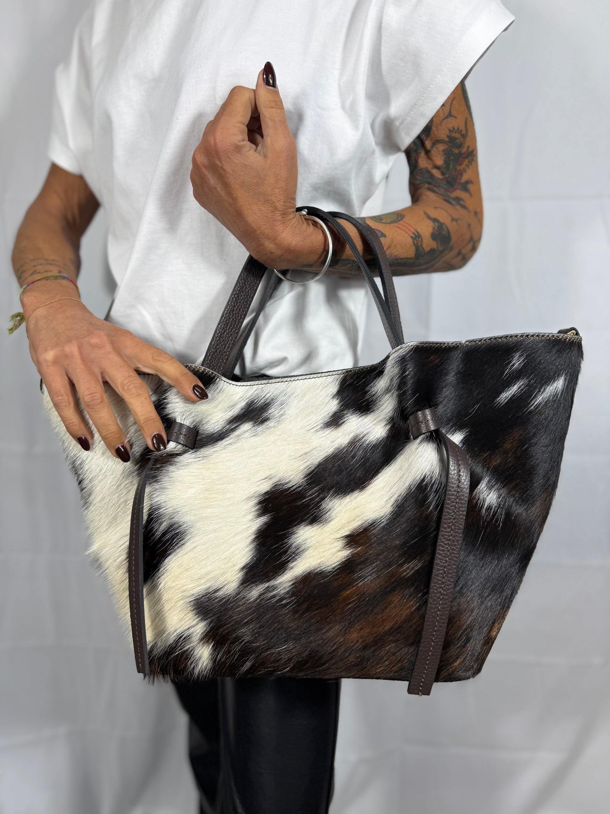 Borsa a spalla realizzata in vero cavallino con rifiniture in pelle di vitello botalato.
