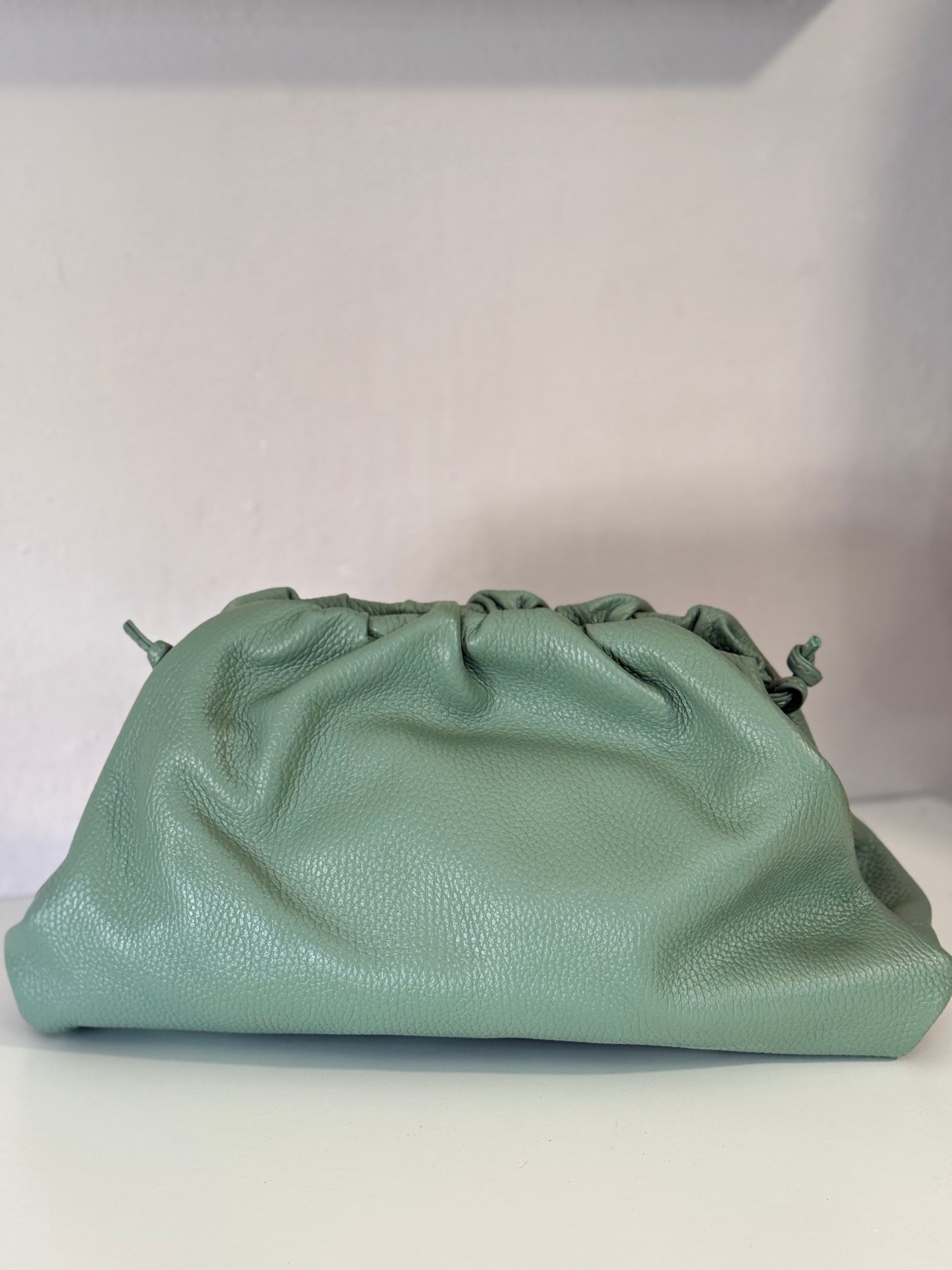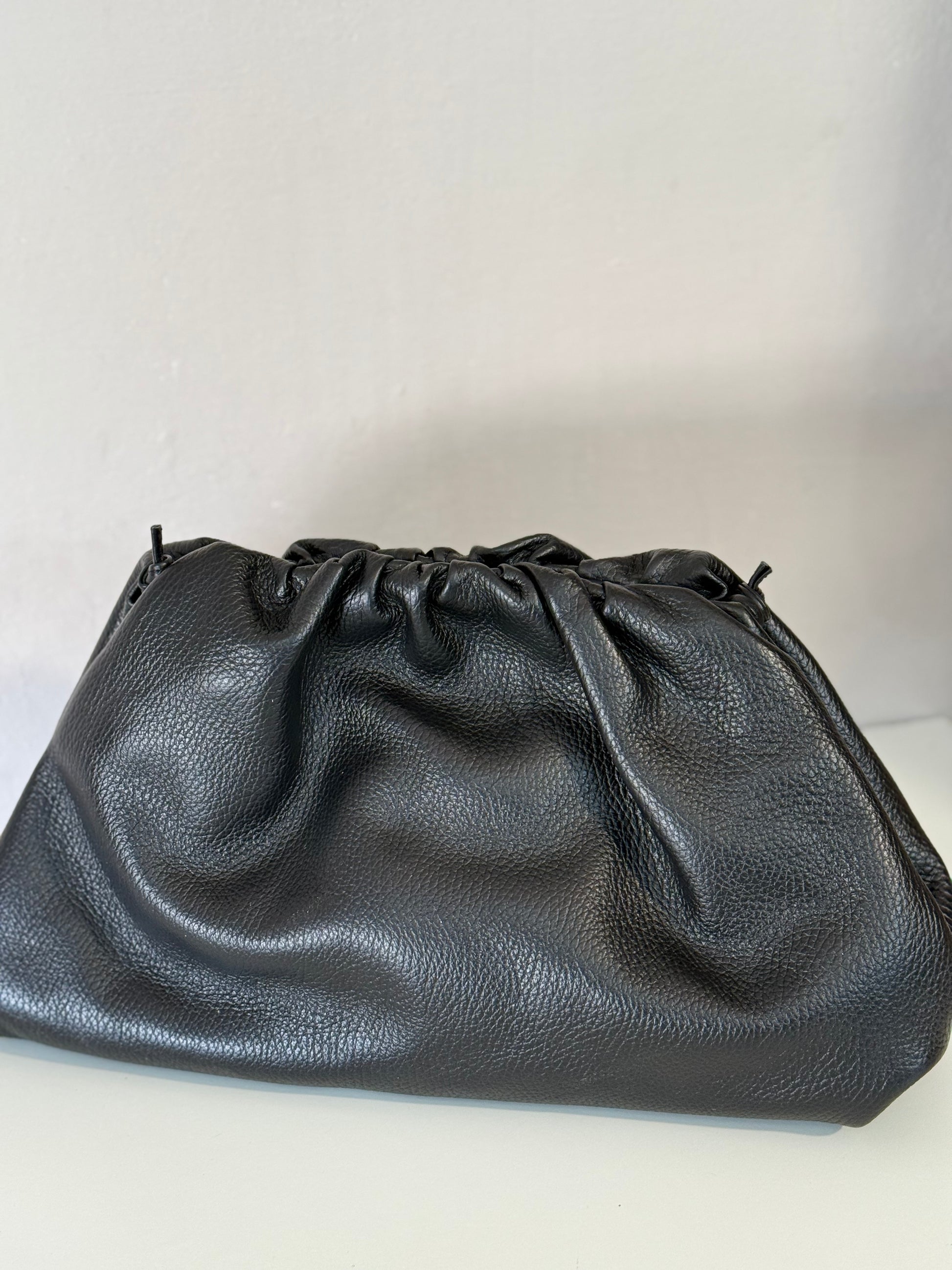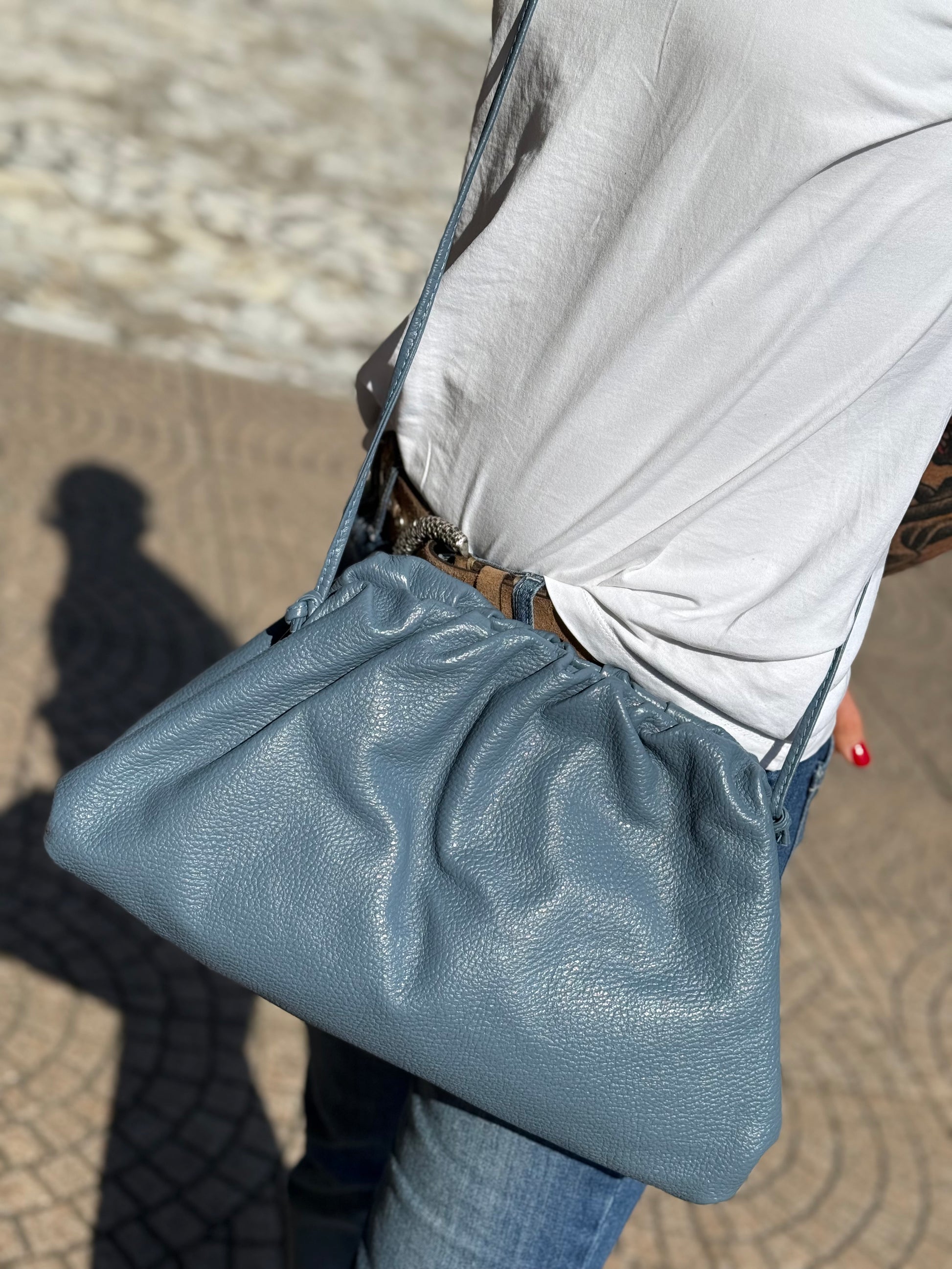 Borsa a tracolla morbida, realizzata in pelle di vitello botalato, foderato in tessuto, nessuna tasca interna, tracolla estraibile.