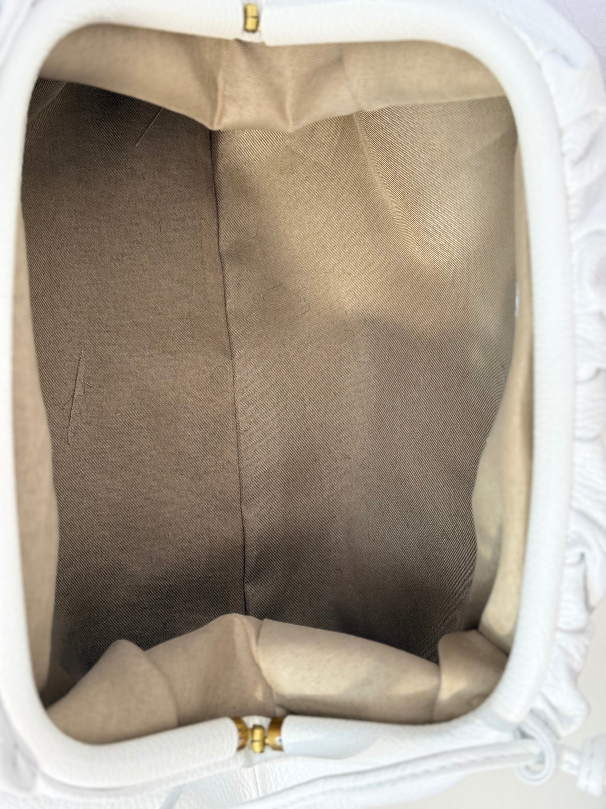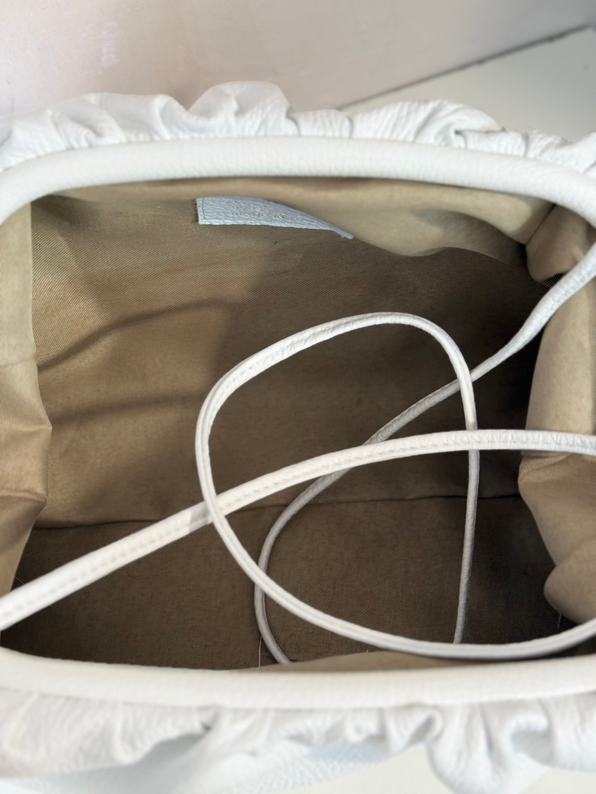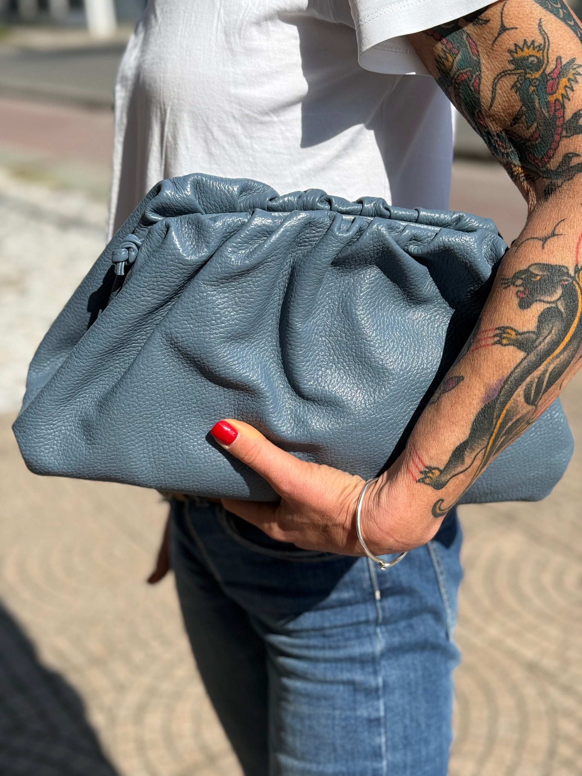 Borsa a tracolla morbida, realizzata in pelle di vitello botalato, foderato in tessuto, nessuna tasca interna, tracolla estraibile.