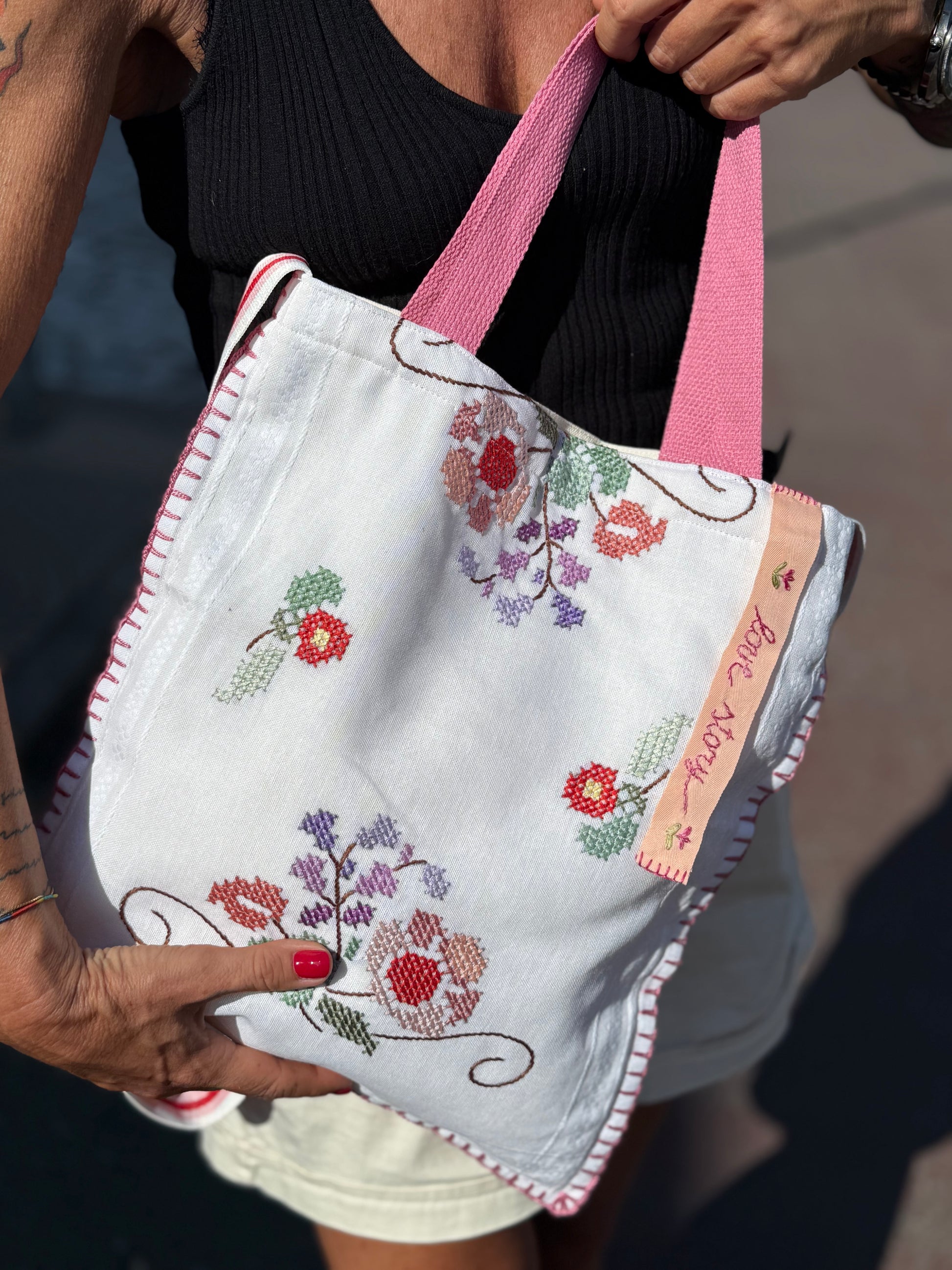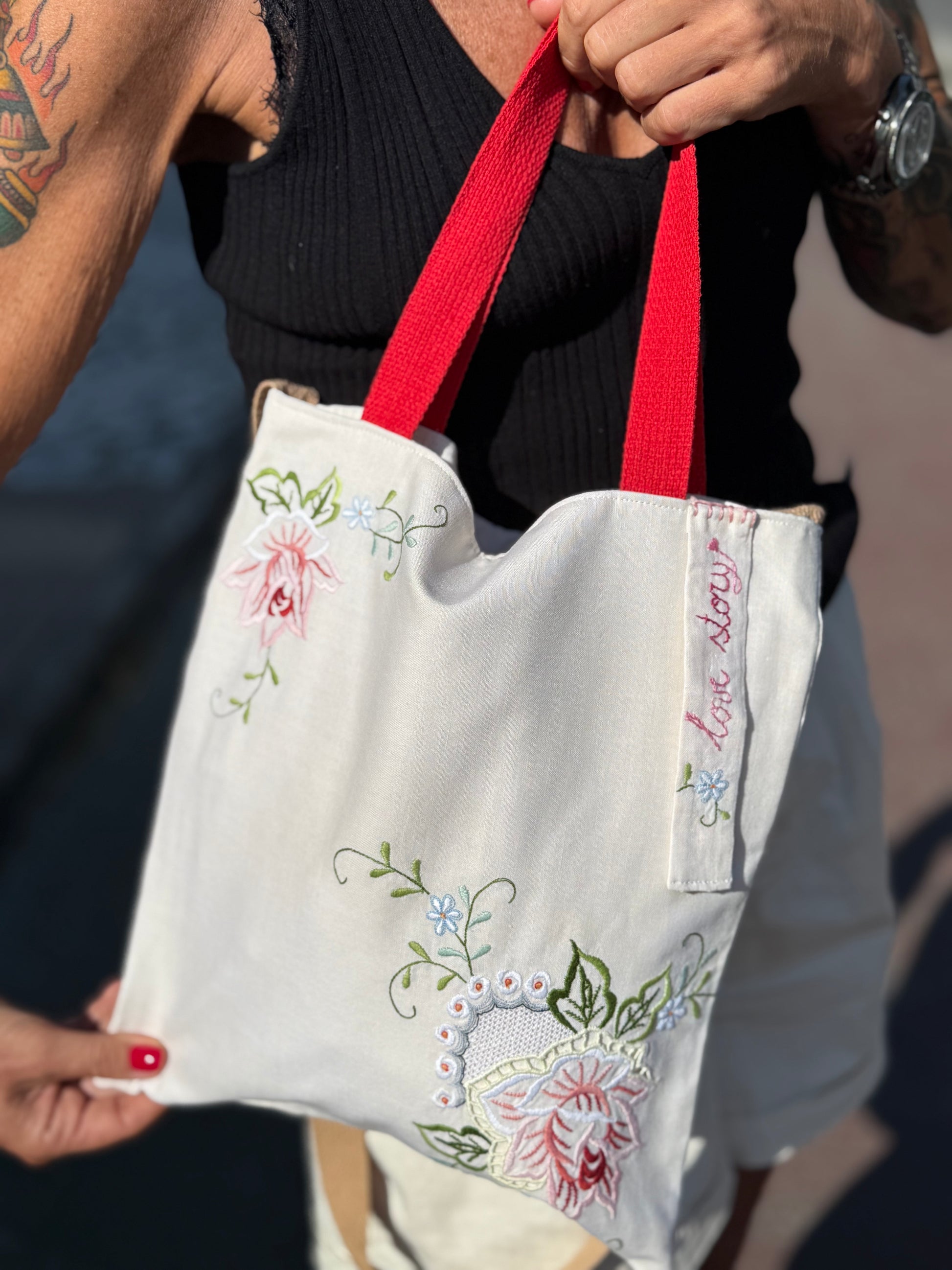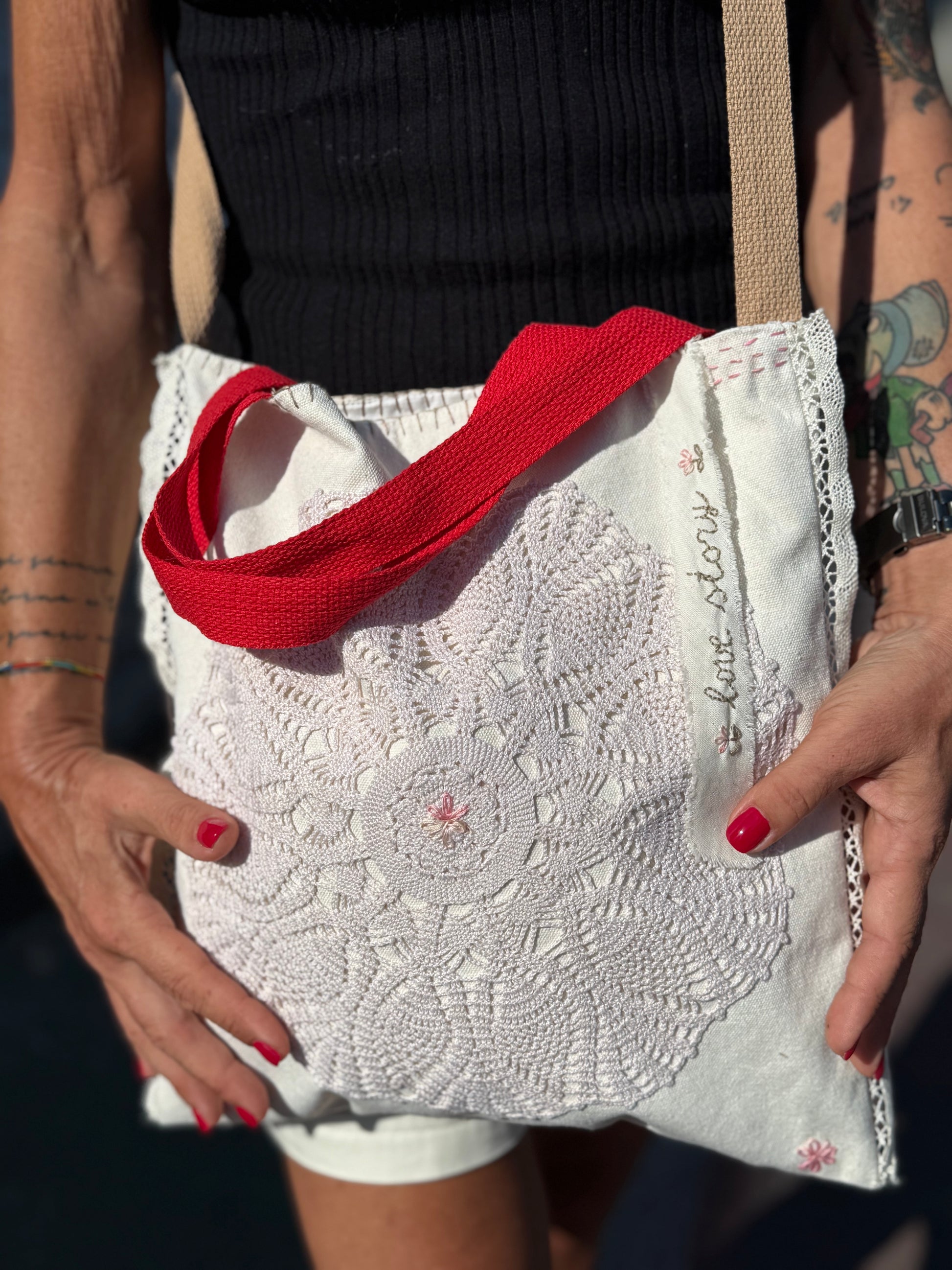 Borsa realizzata a mano cok dettagli in pizzo recuperati da vecchi corredi.