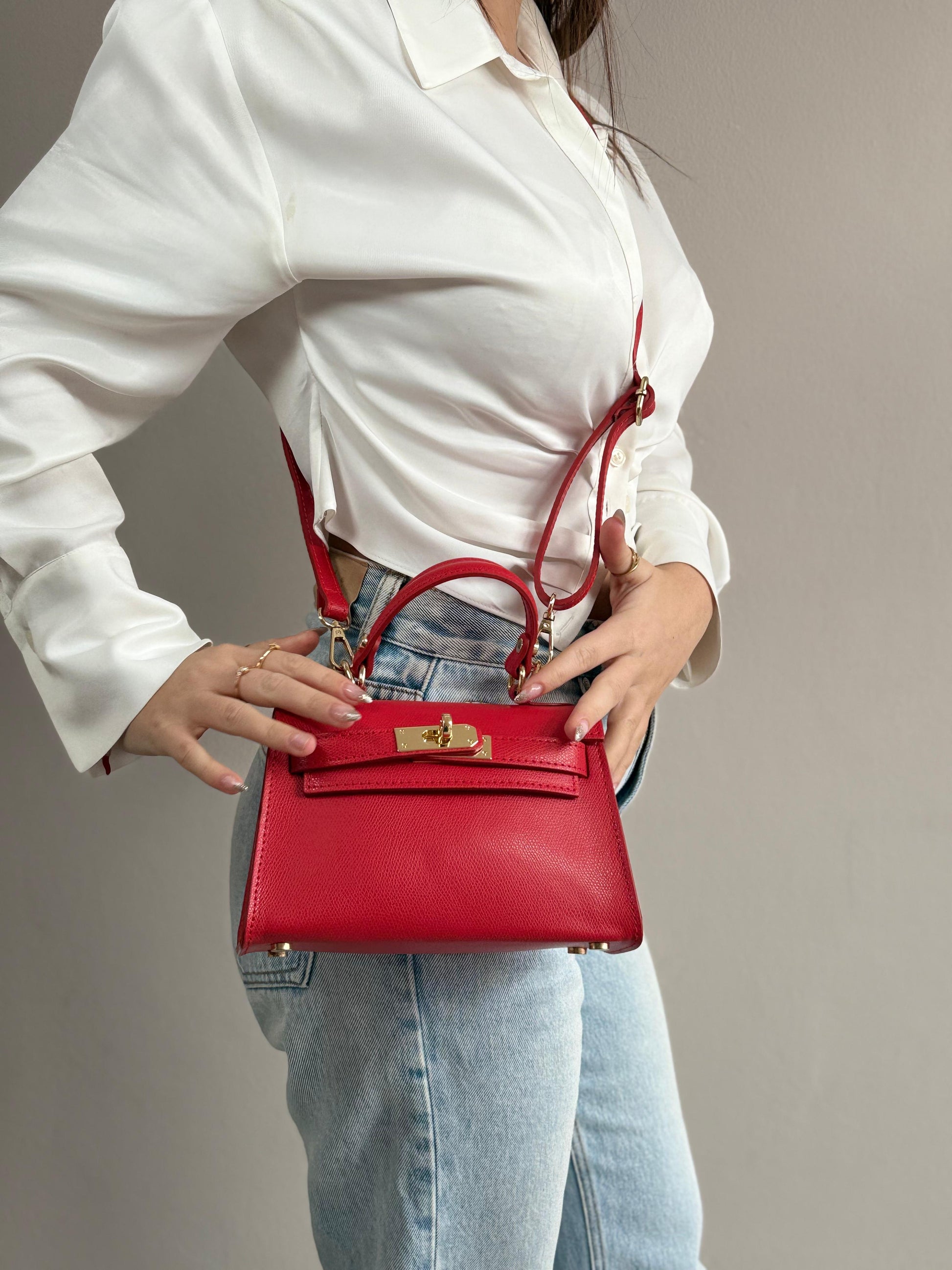 Piccola borsa a mano realizzata in pelle di vitello "Togo", tasca interna con cerniera, metallerie dorate , tracolla removibile e regolabile.