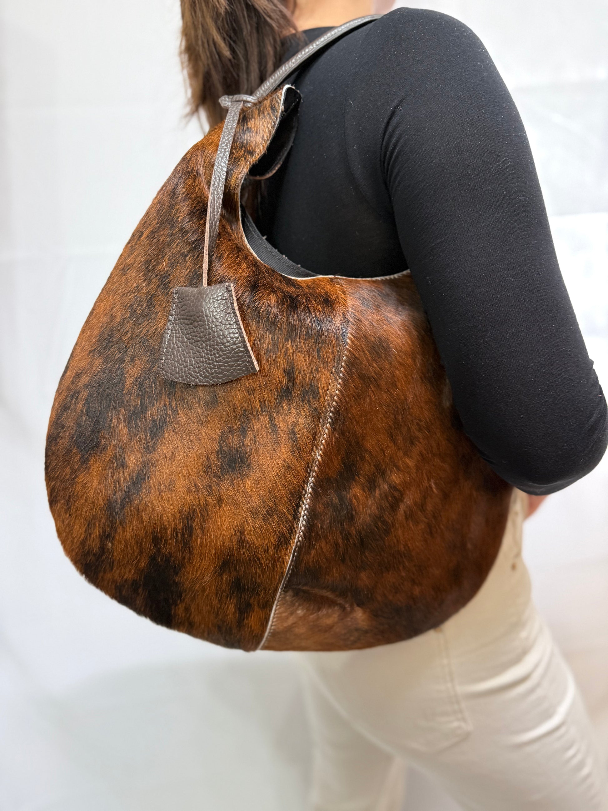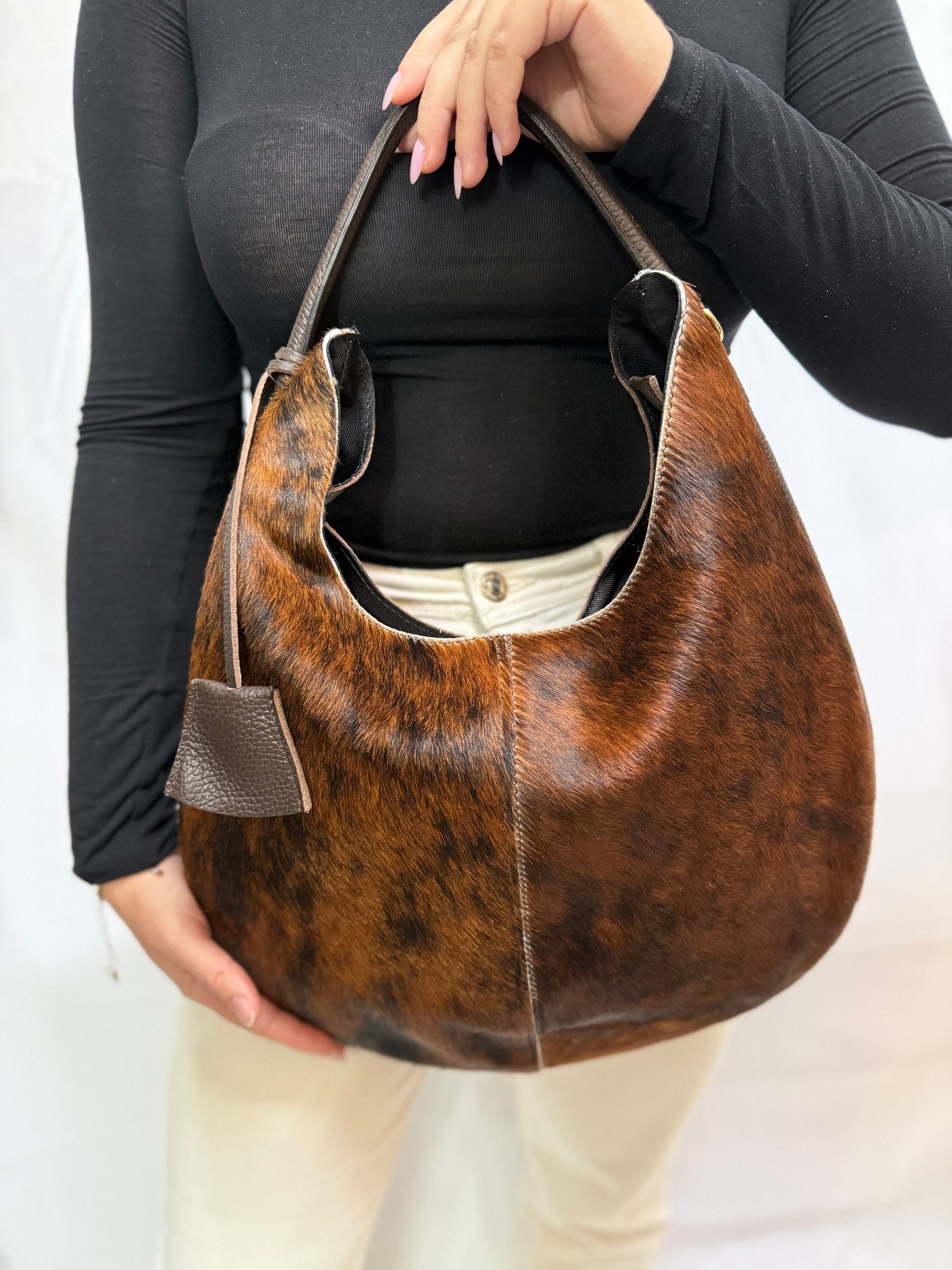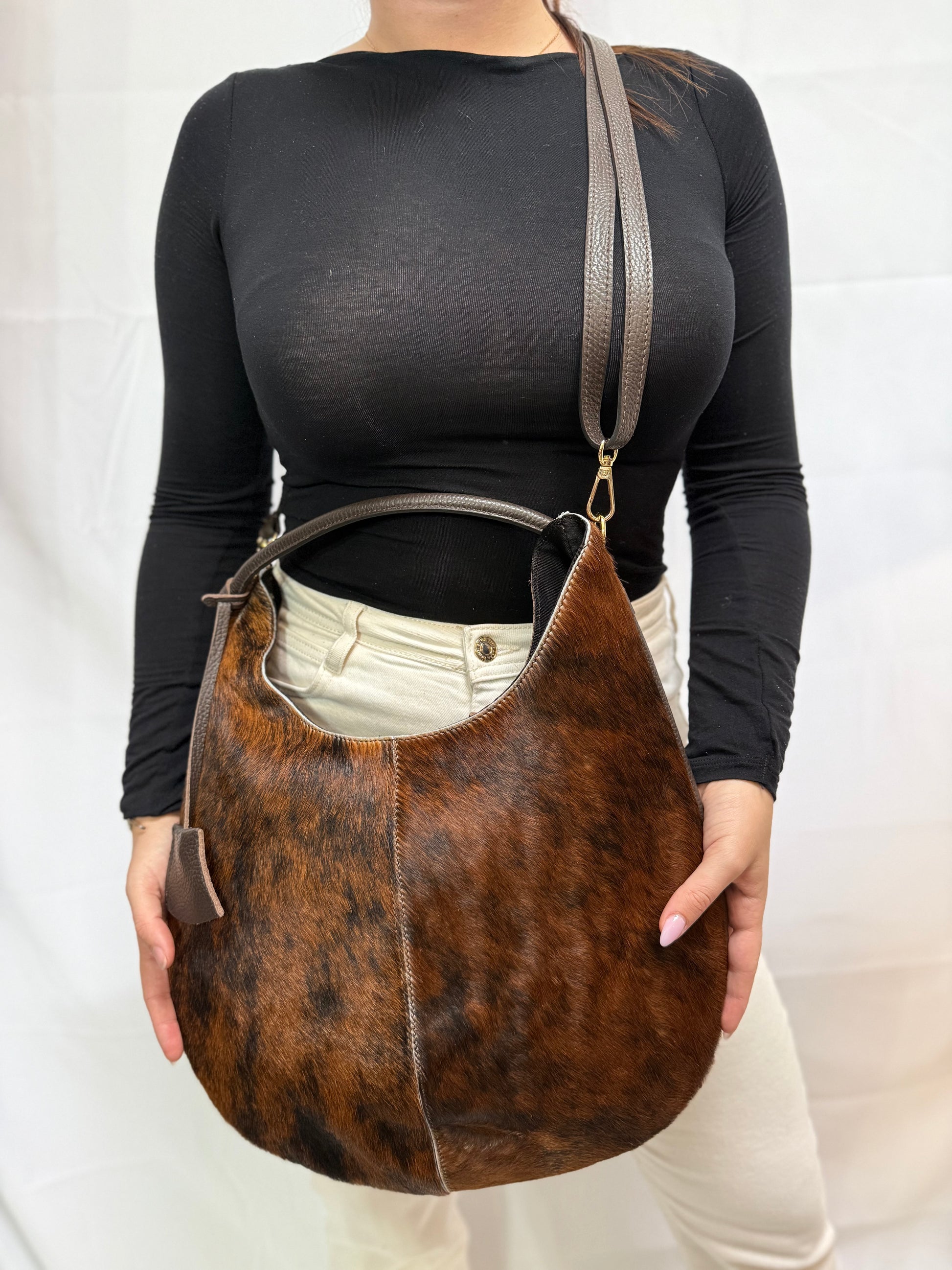 Borsa a spalla realizzata in vero cavallino con rifiniture in pelle di vitello botalato.