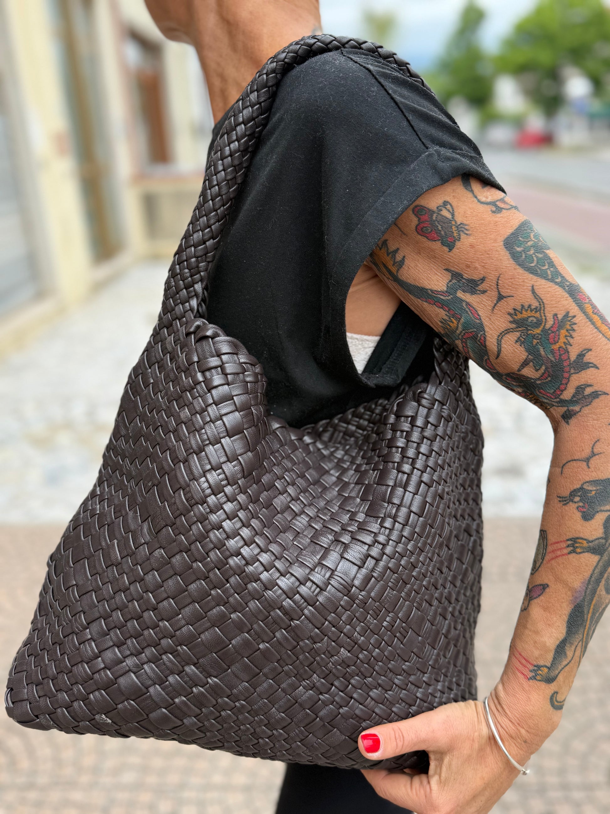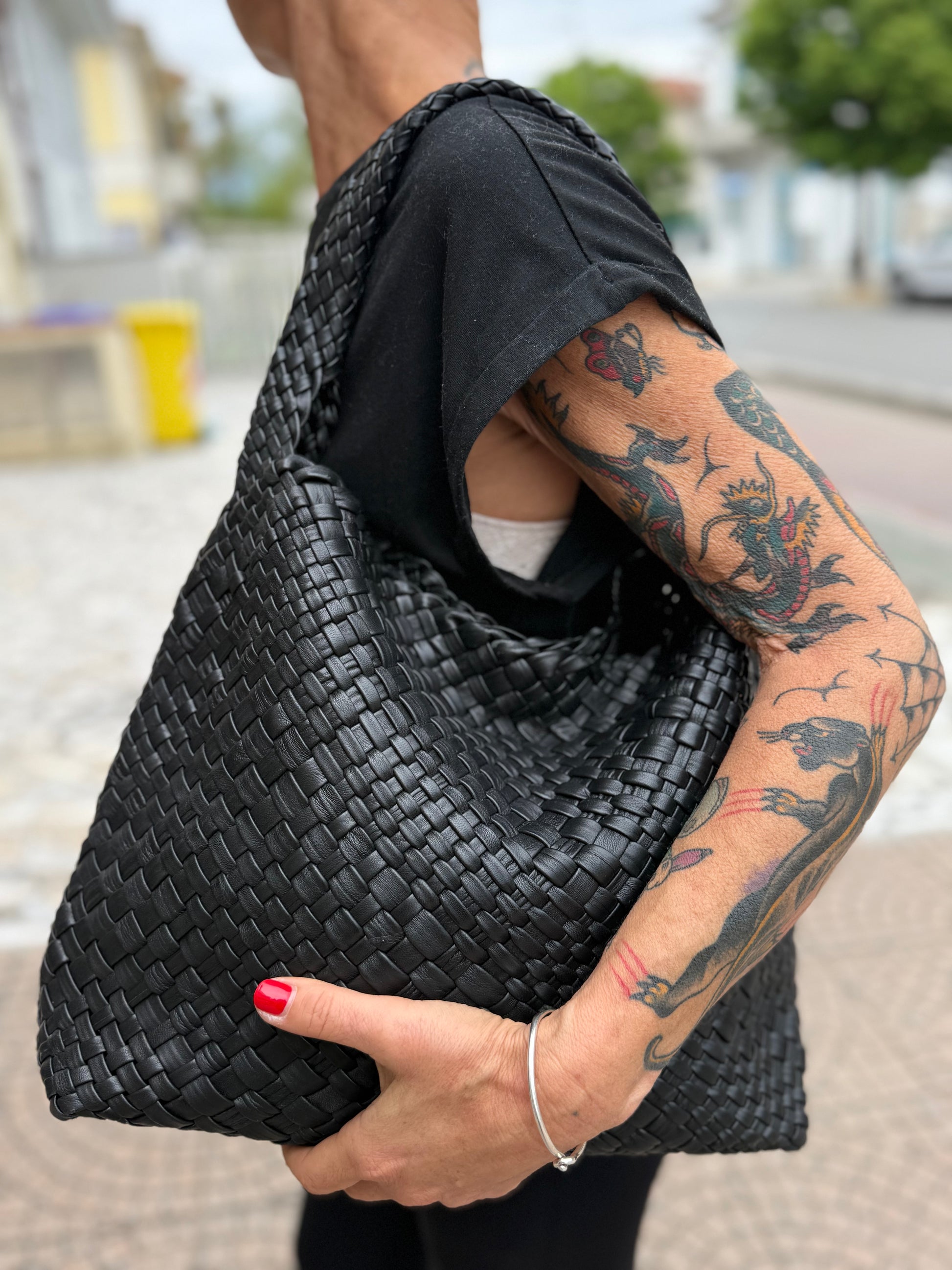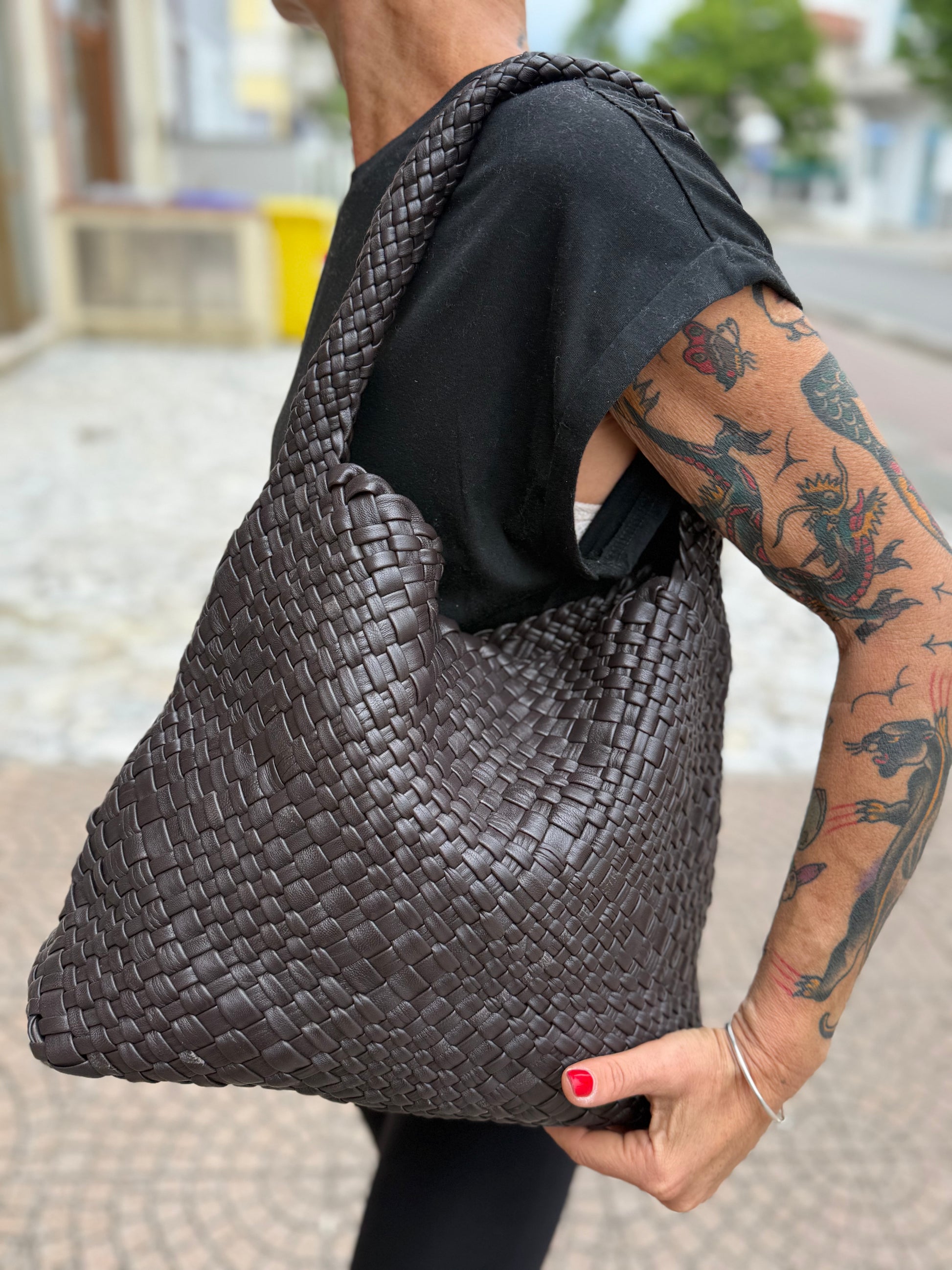 Sacca a spalla realizzata in pelle di vitello morbida intrecciata a mano.