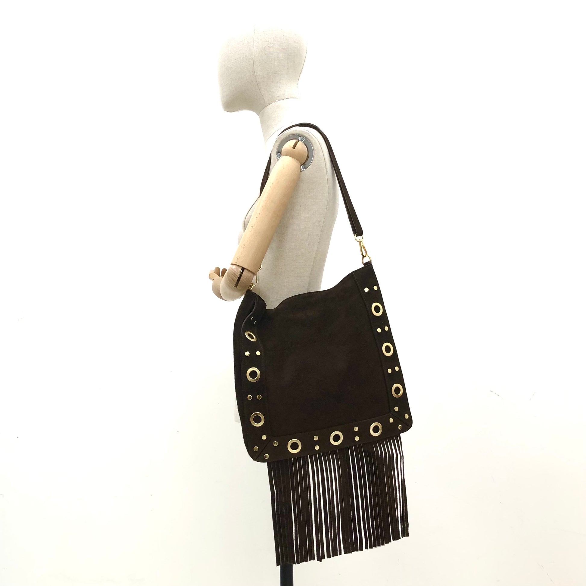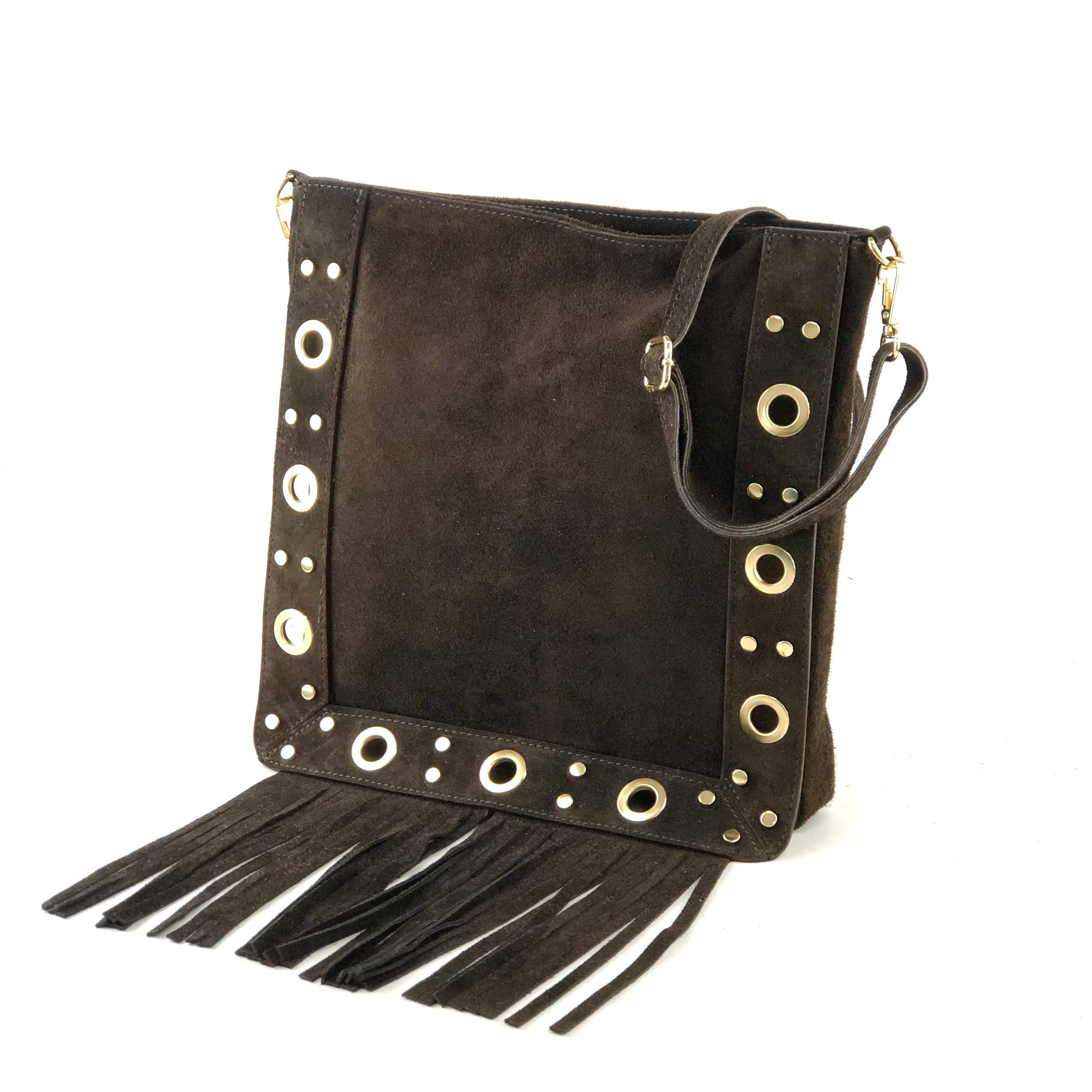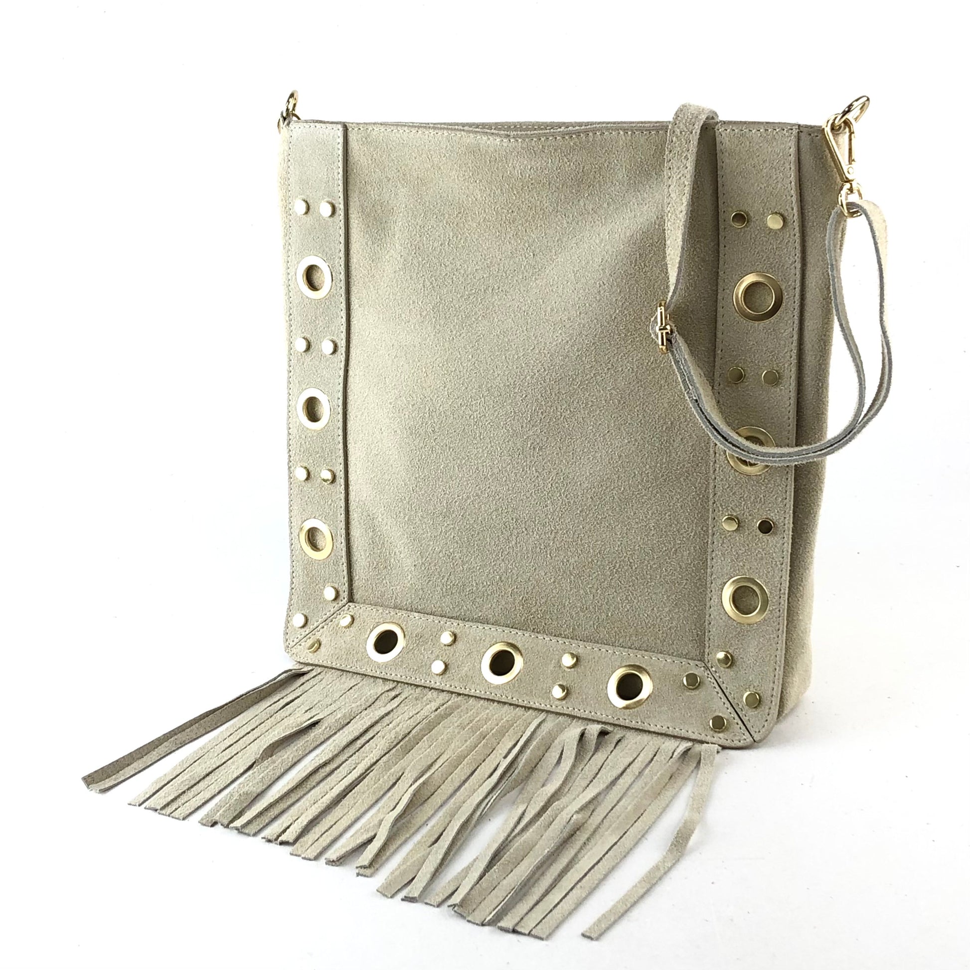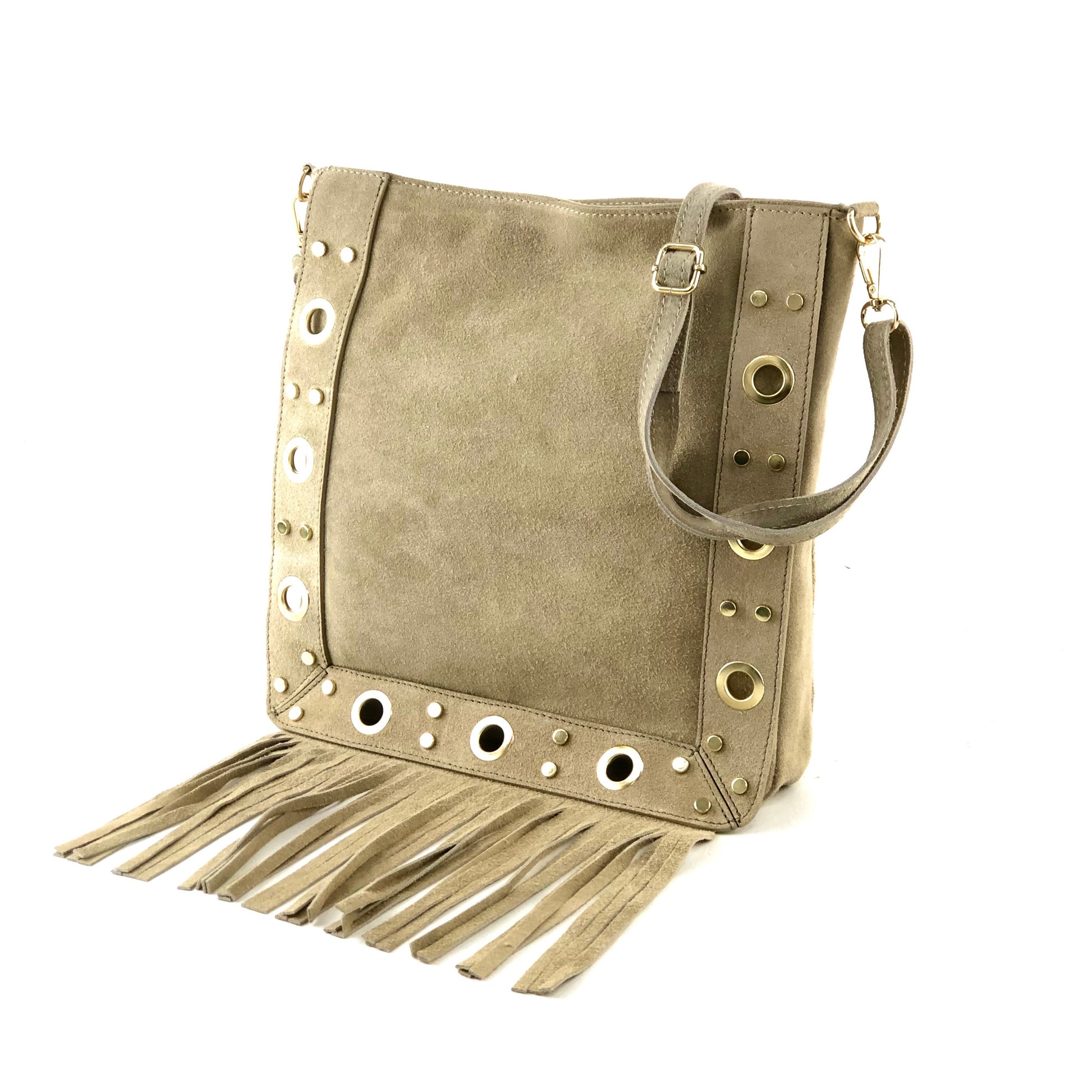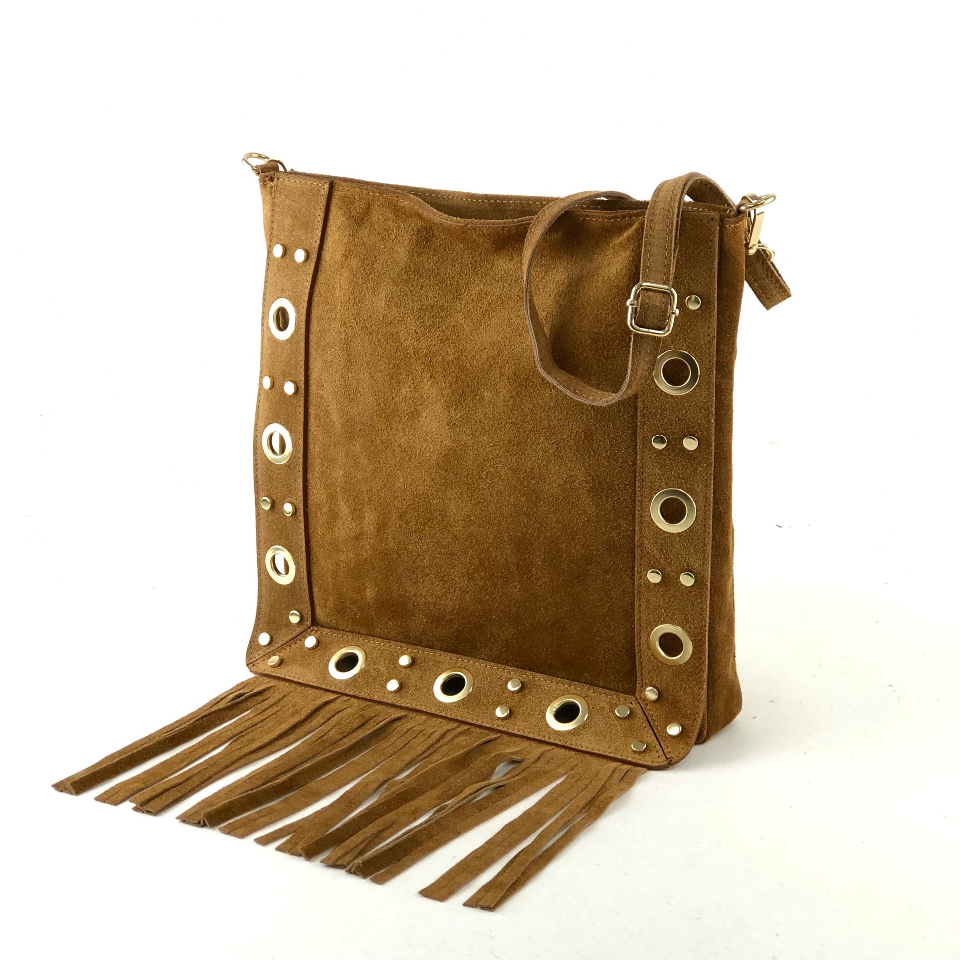 Sacca in vitello scamosciato a tracolla con frange , interno unico foderato in cotone ,tasca interna con cerniera