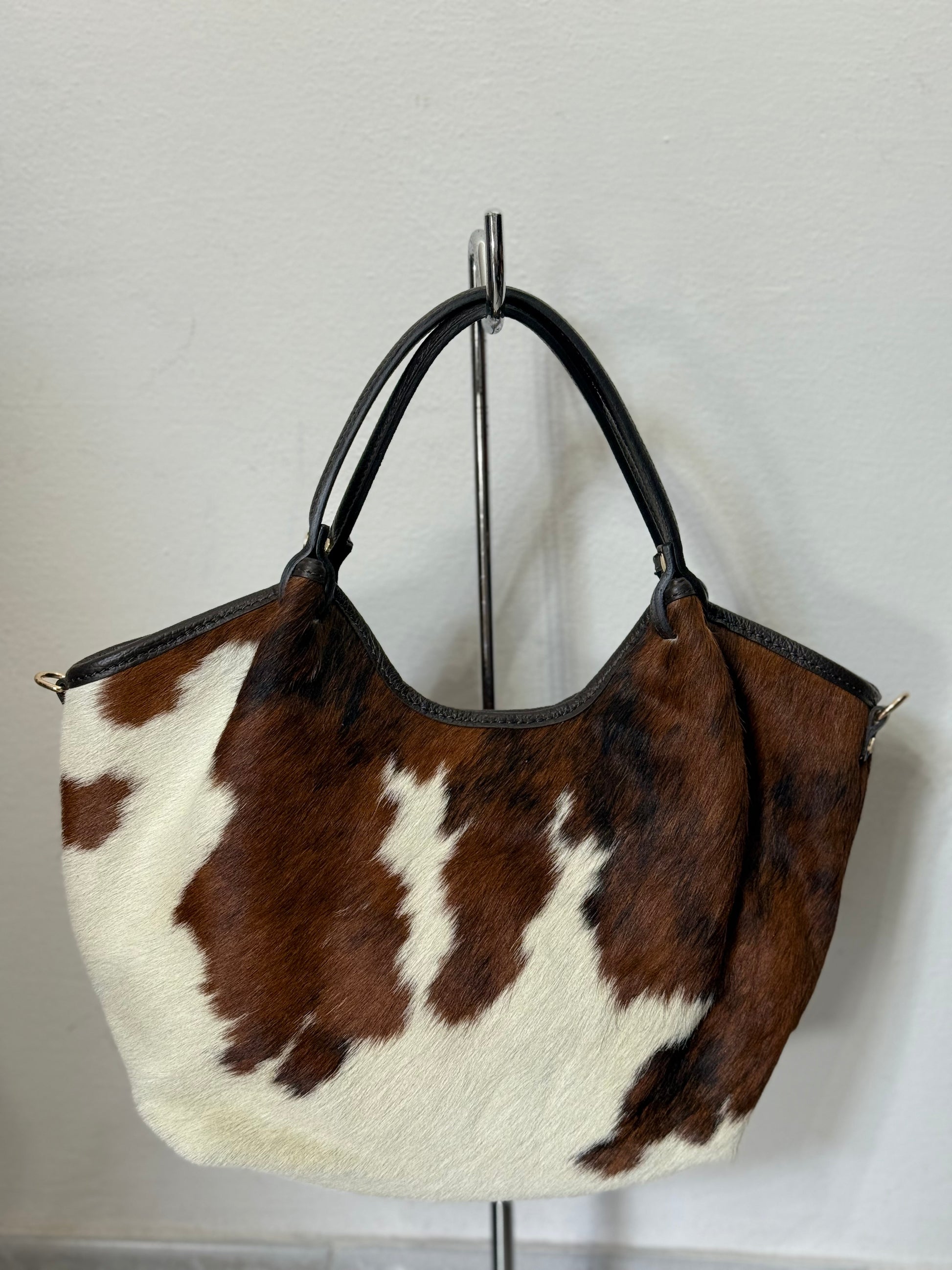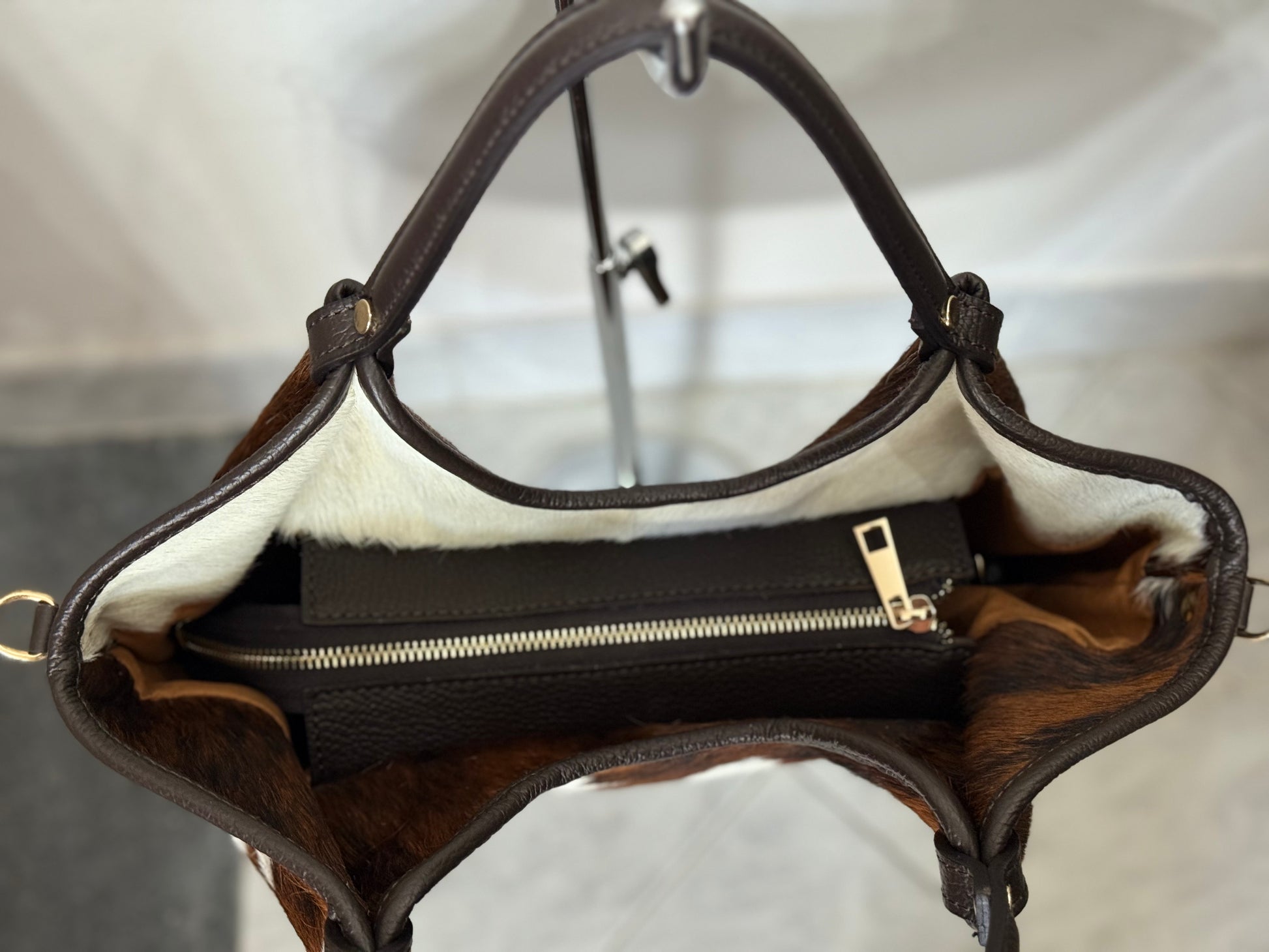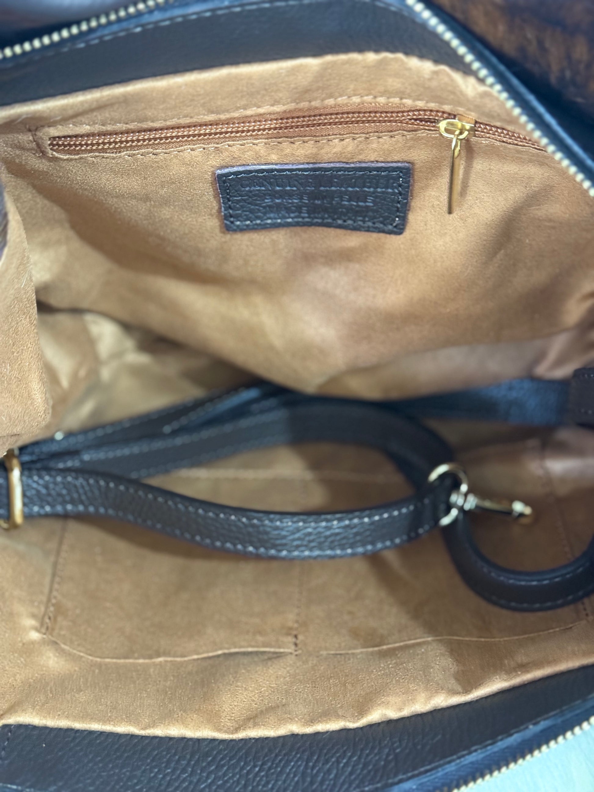 Borsa a spalla realizzata in vero cavallino con rifiniture in pelle di vitello botalato.
