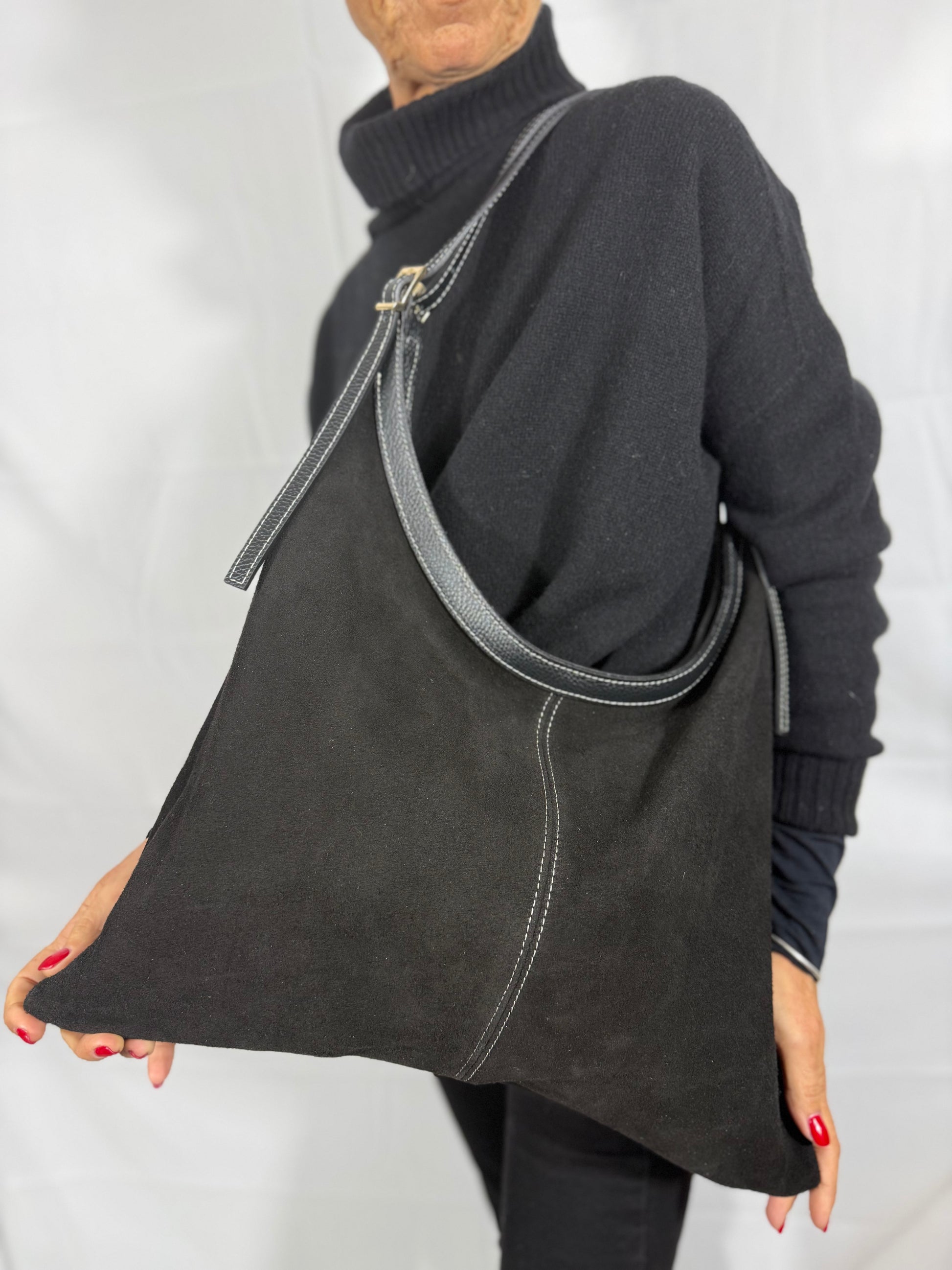 Borsa realizzata in pelle di vitello scamosciata con rifiniture in pelle di vitello botalato, tracolla regolabile con impunture bianche e tasca interna
