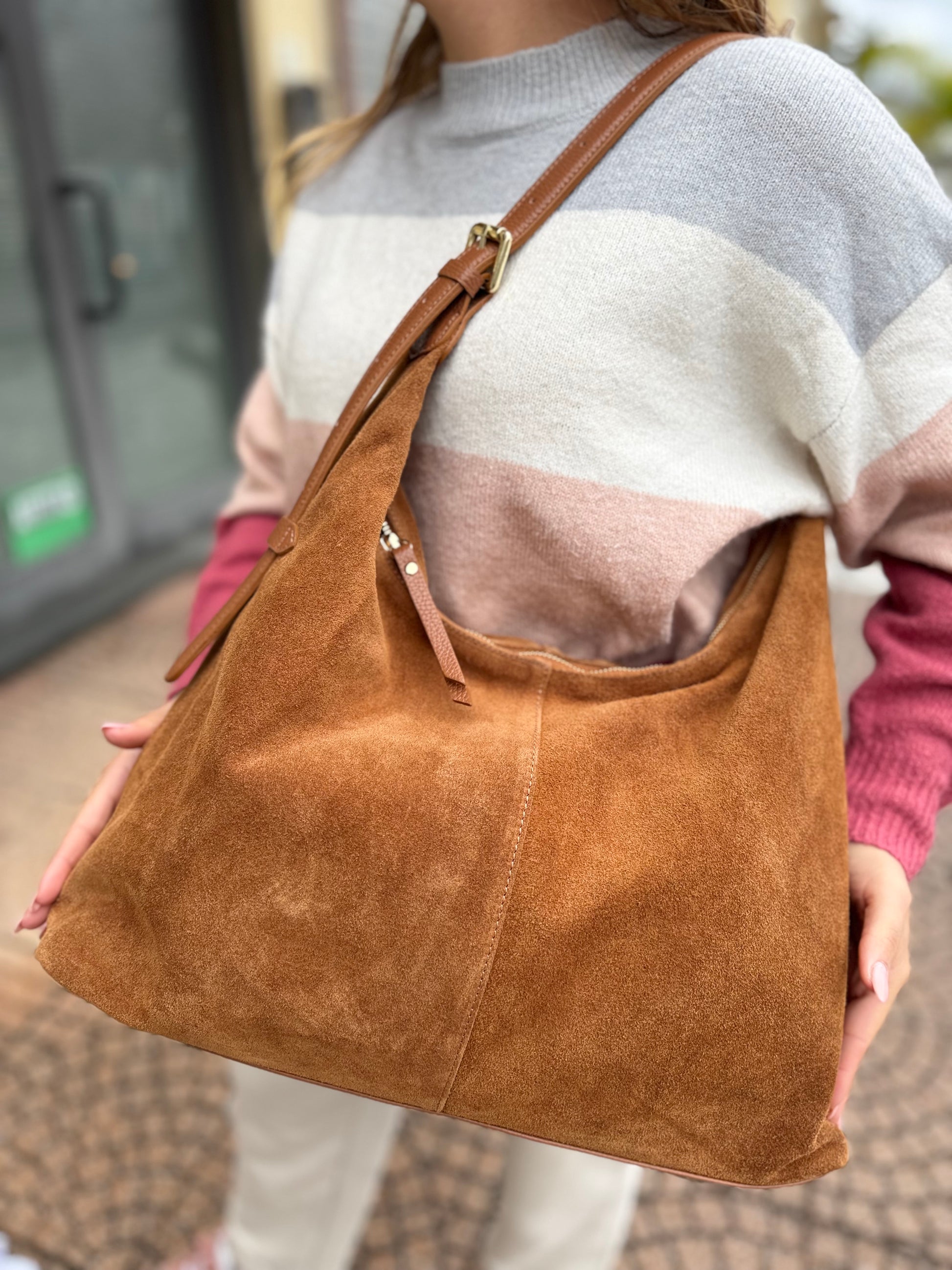 Borsa a spalla realizzata in pelle di vitello scamosciato con rifiniture in pelle di vitello botalato.