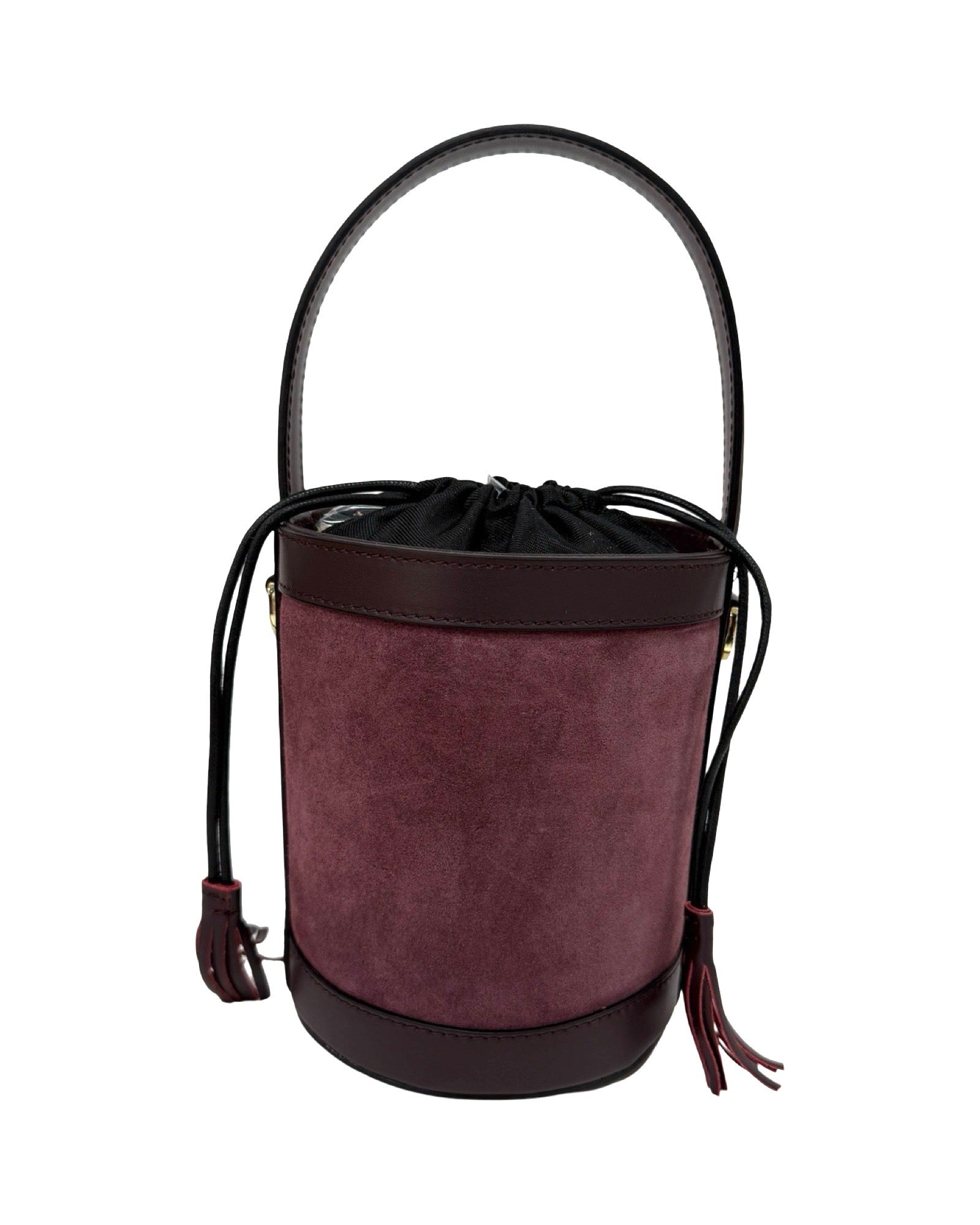 Secchiellino in pelle di vitello scamosciata con rifiniture in pelle di vitello liscio.