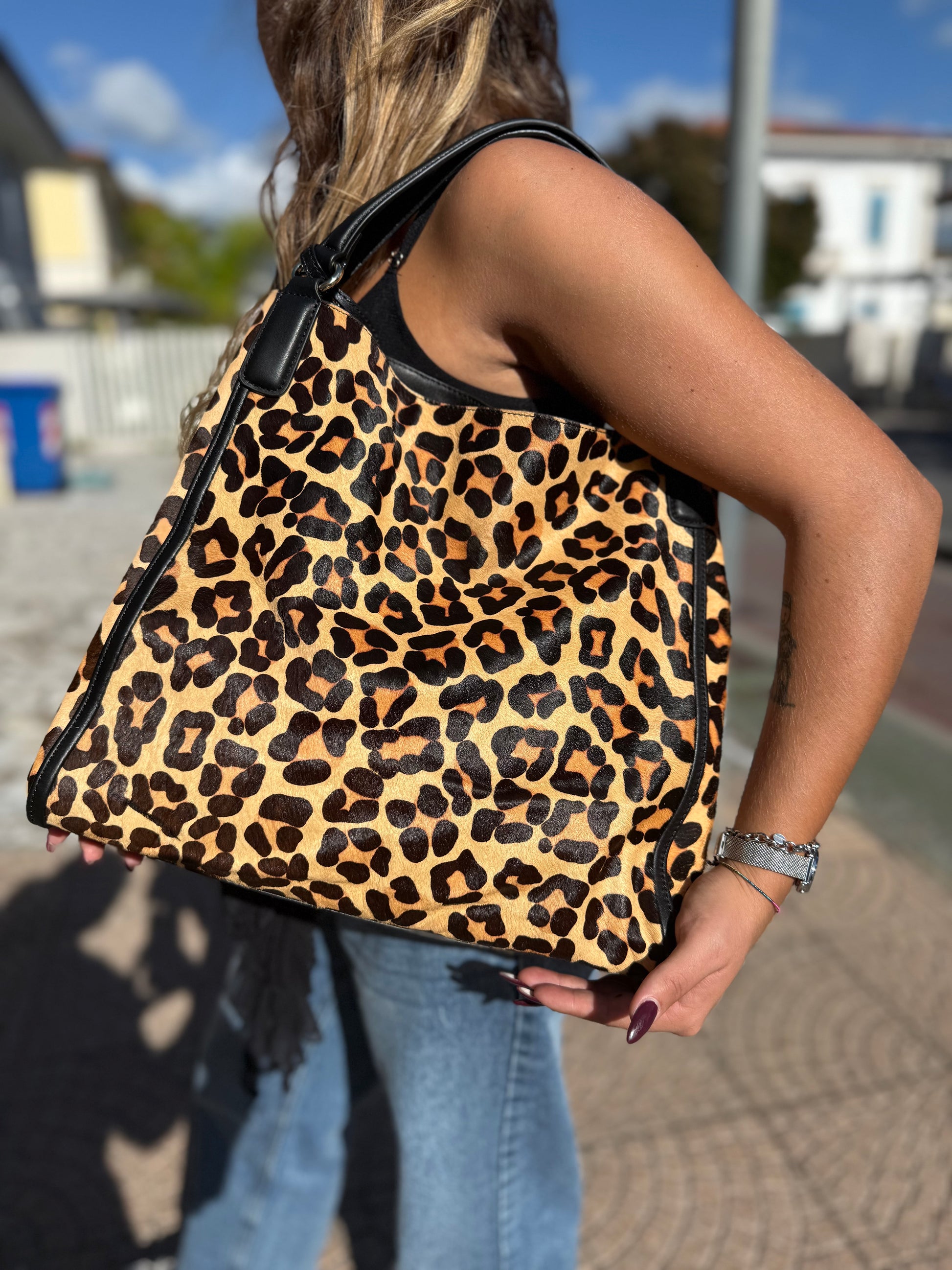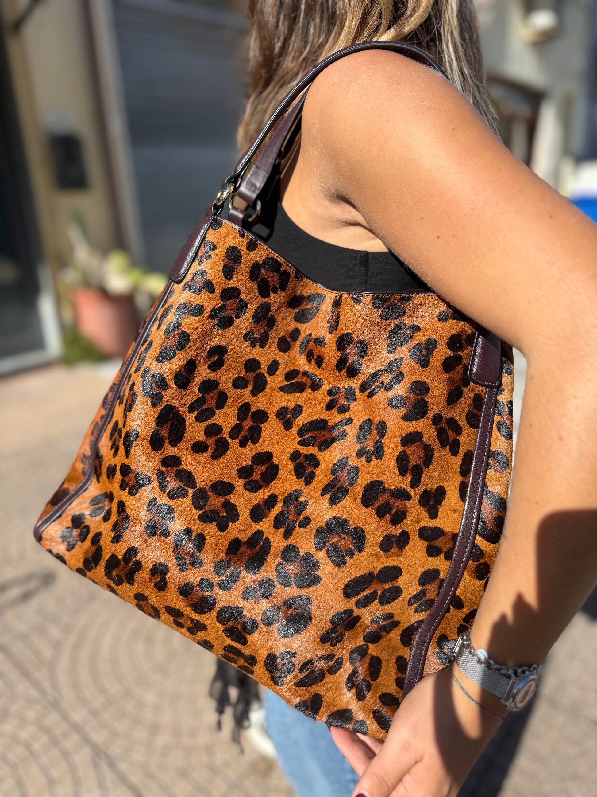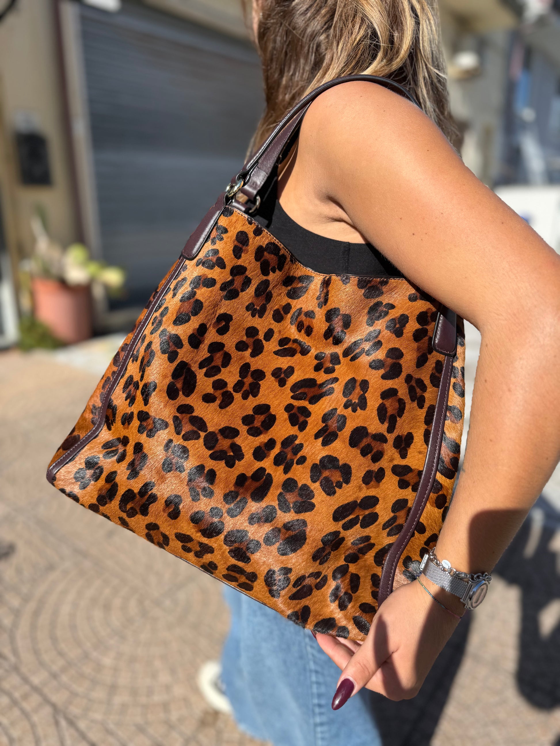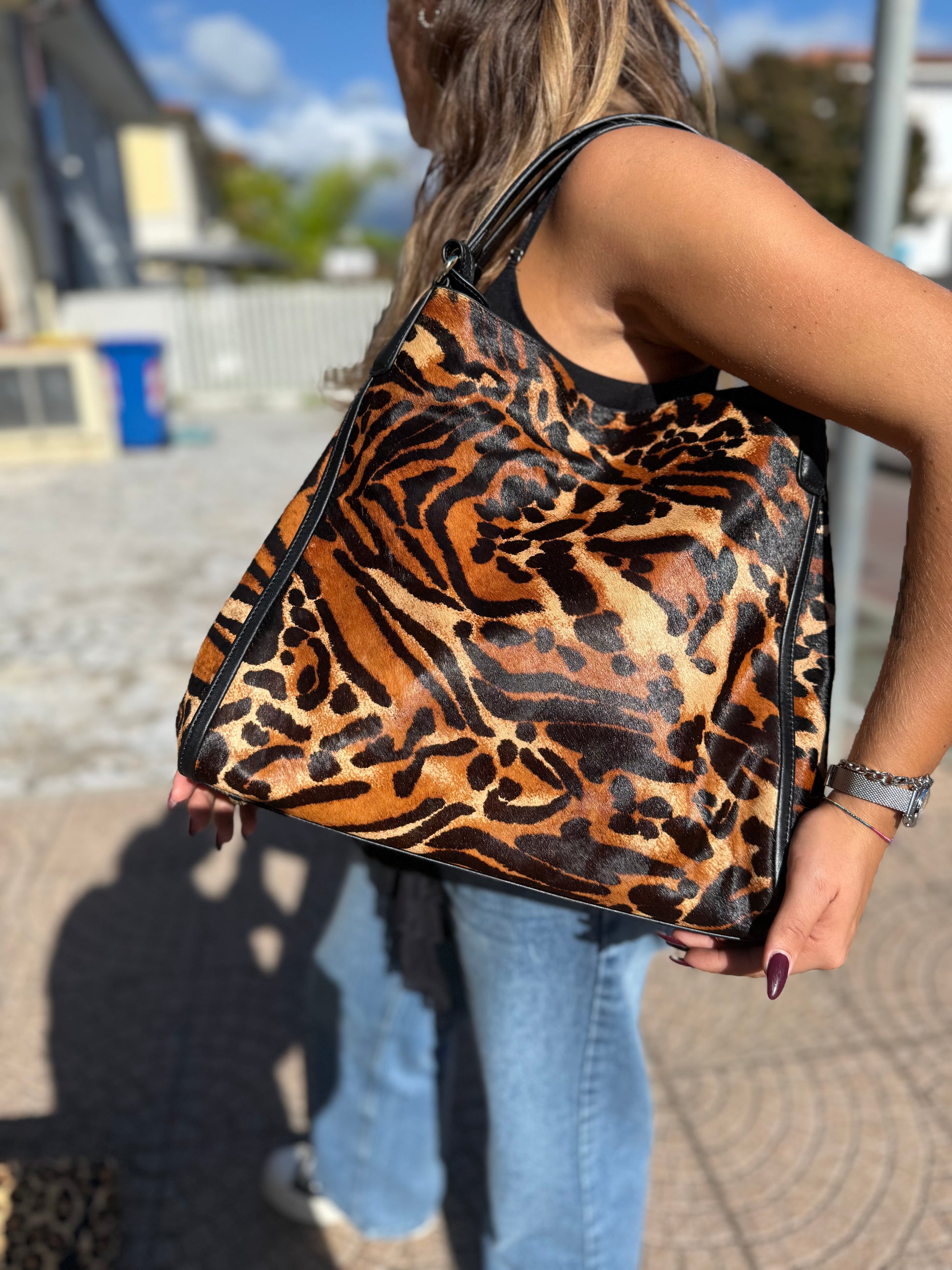 Borsa a spalla realizzata in cavallino con rifiniture in pelle di vitello liscio.