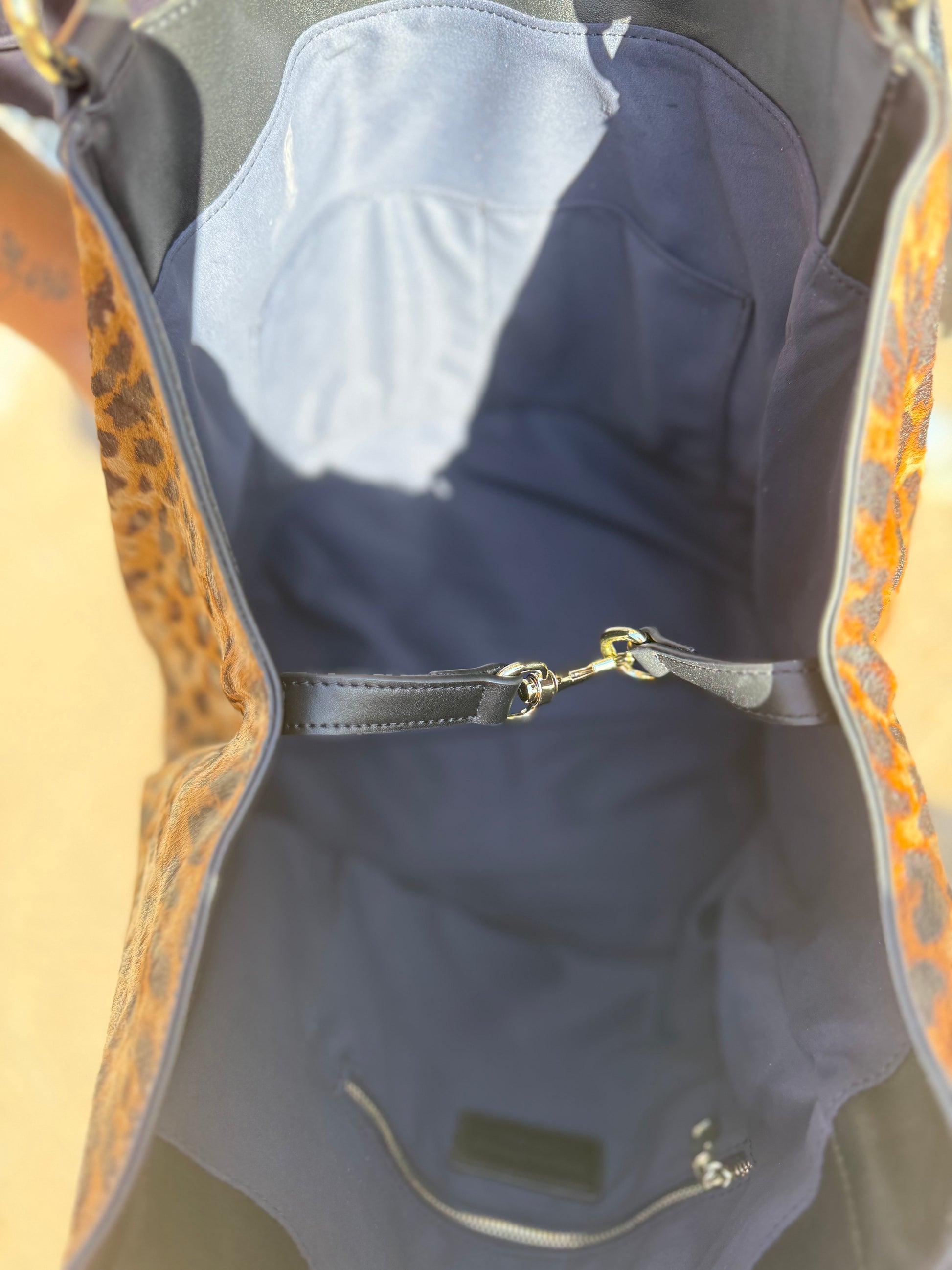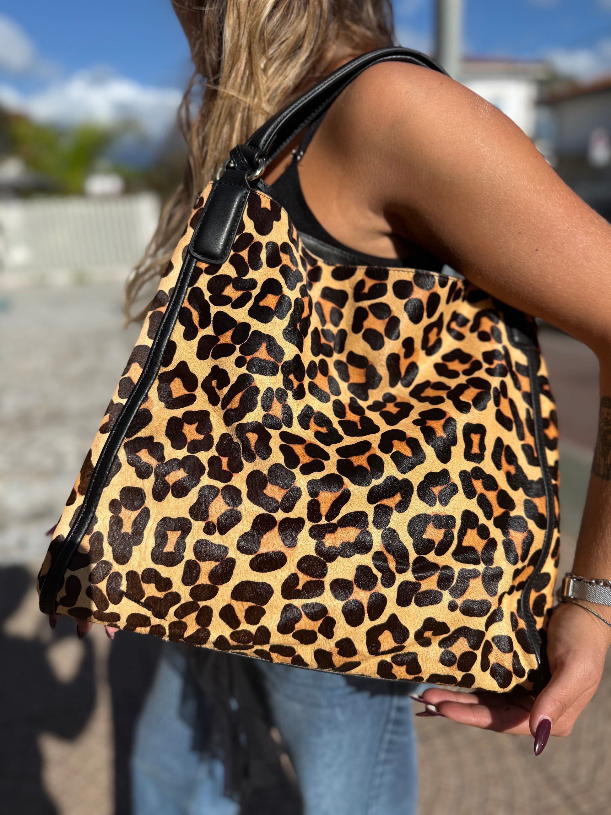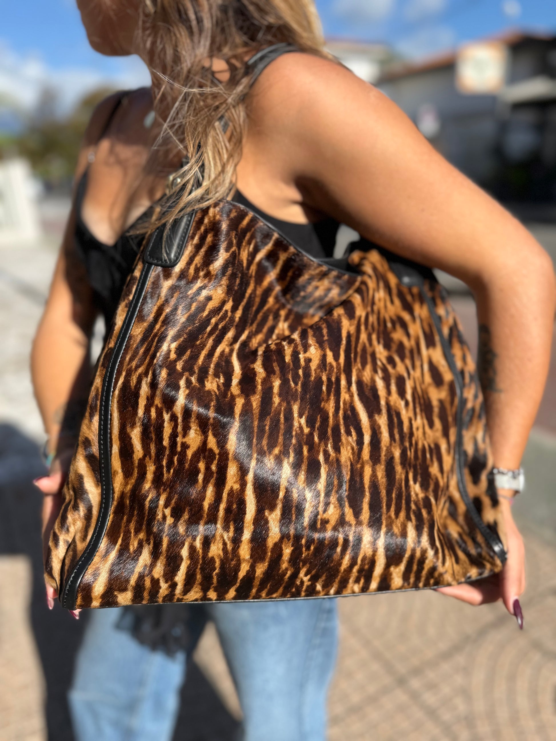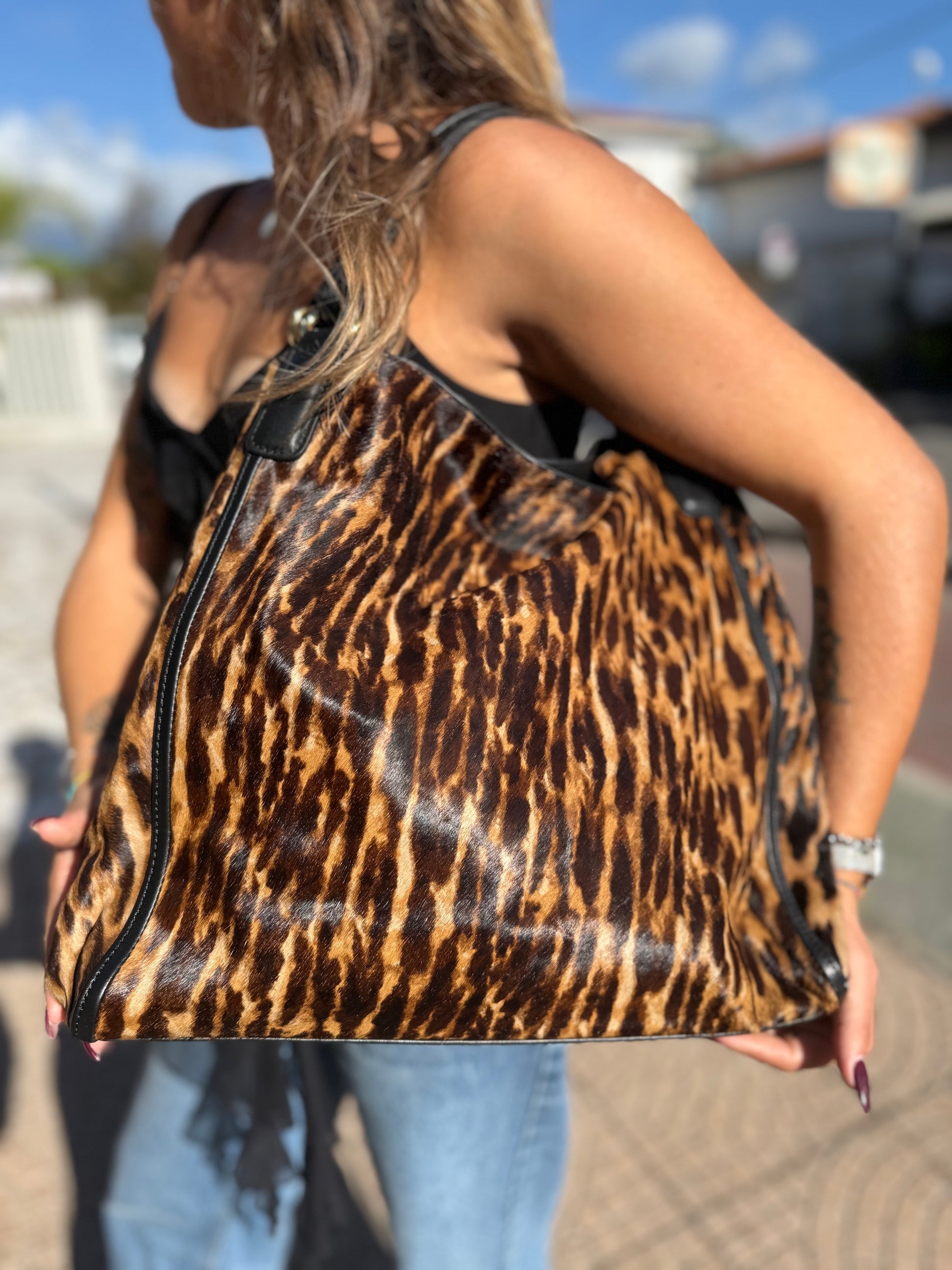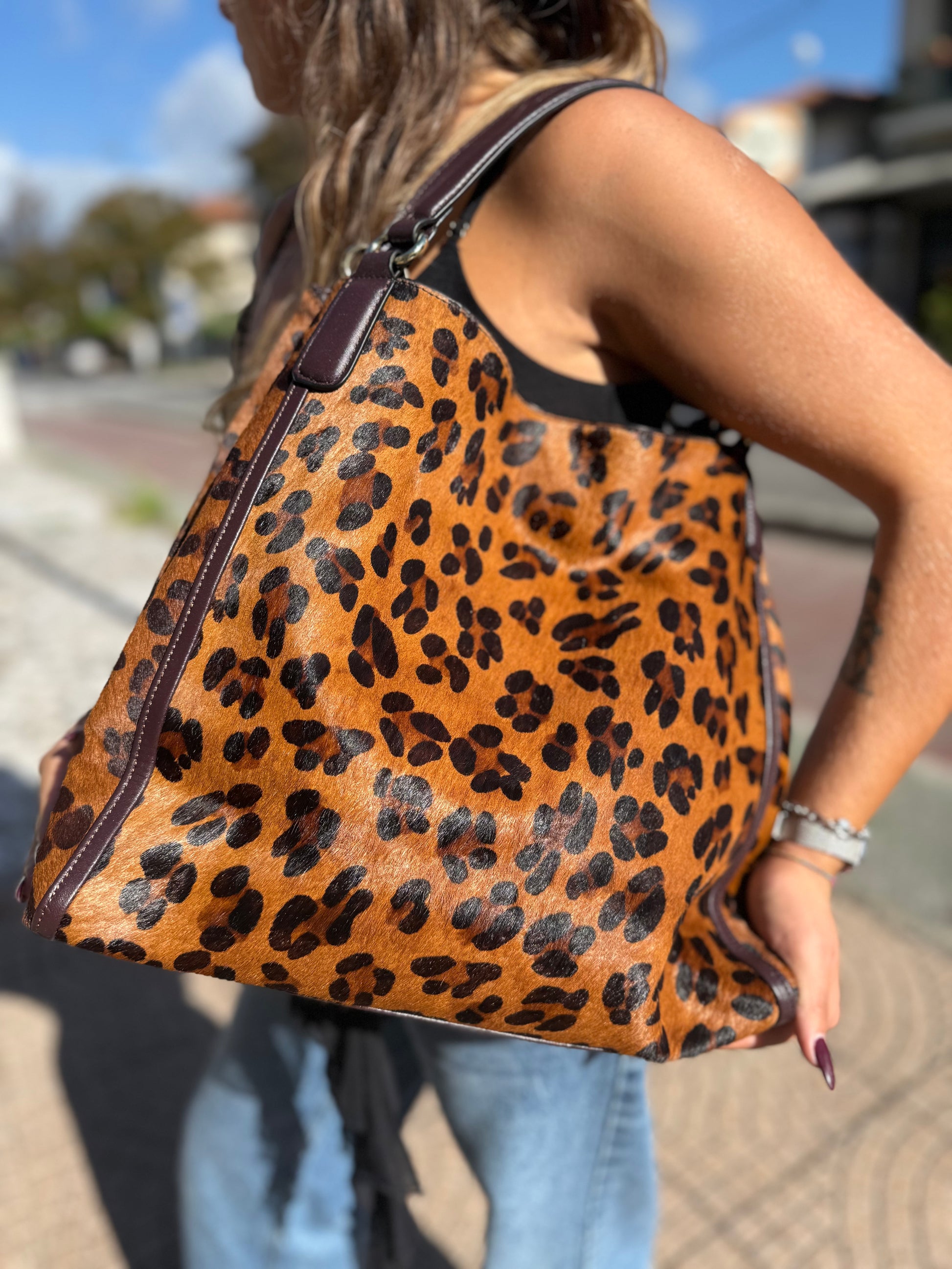 Borsa a spalla realizzata in cavallino con rifiniture in pelle di vitello liscio.