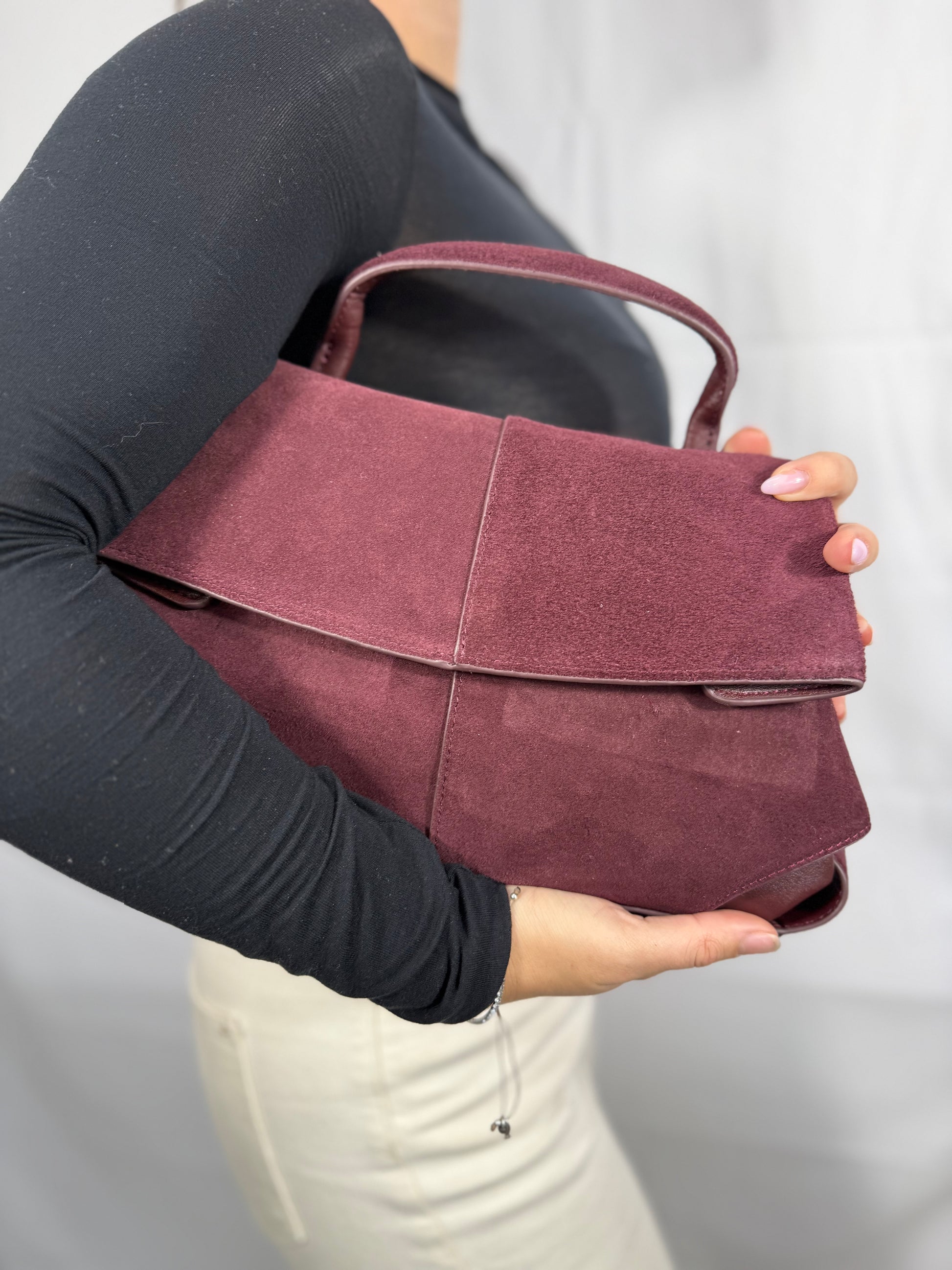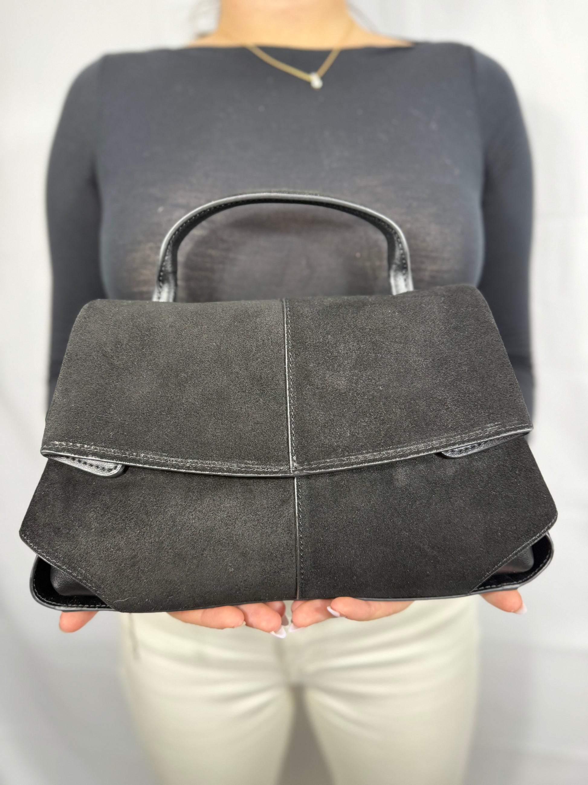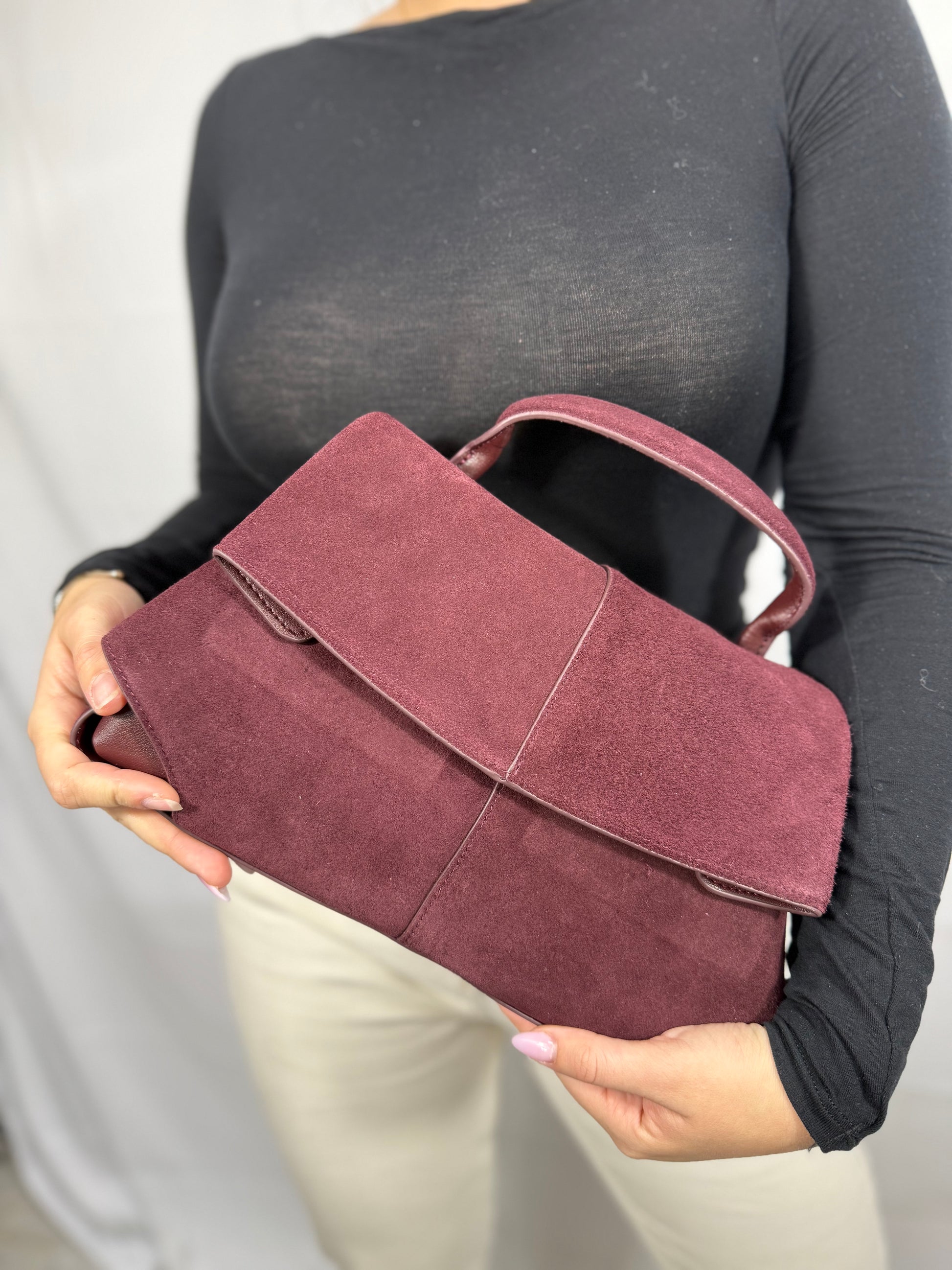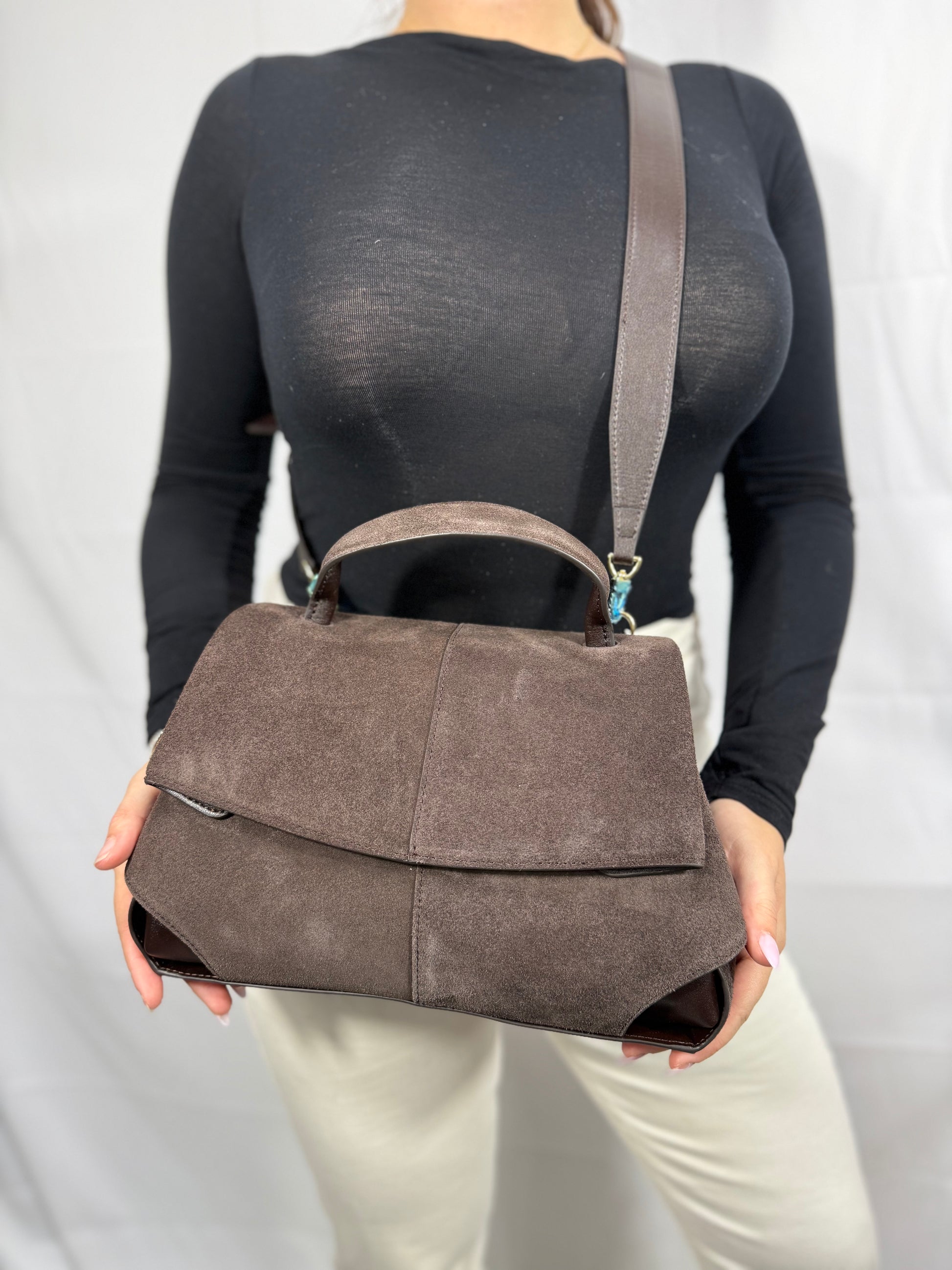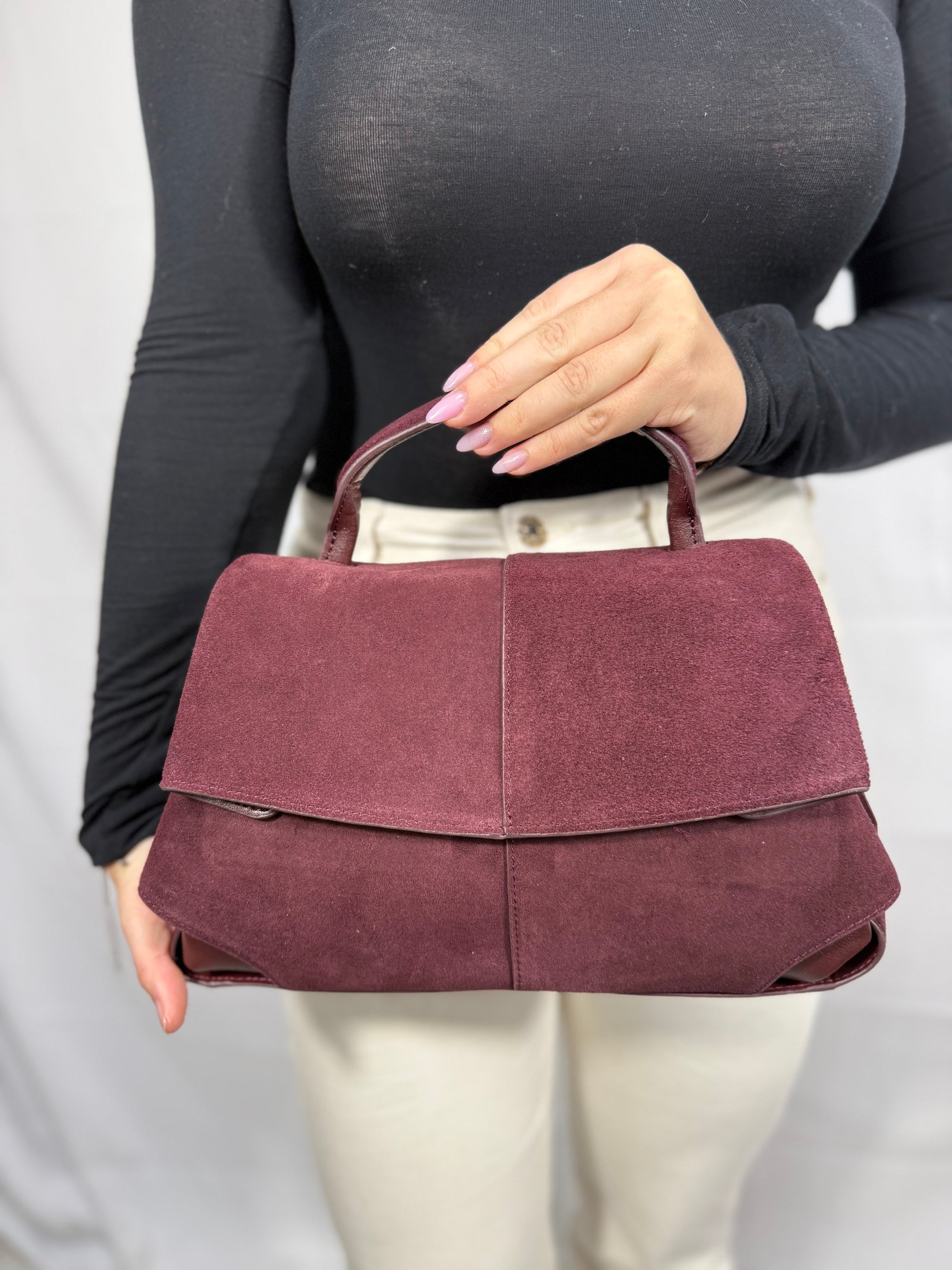 Borsa a mano realizzata in pelle di vitello scamosciato, con chiusura a clip, tasca interna con cerniera e interno diviso in 2 scomparti foderato in canvas e tracolla removibile regolabile.