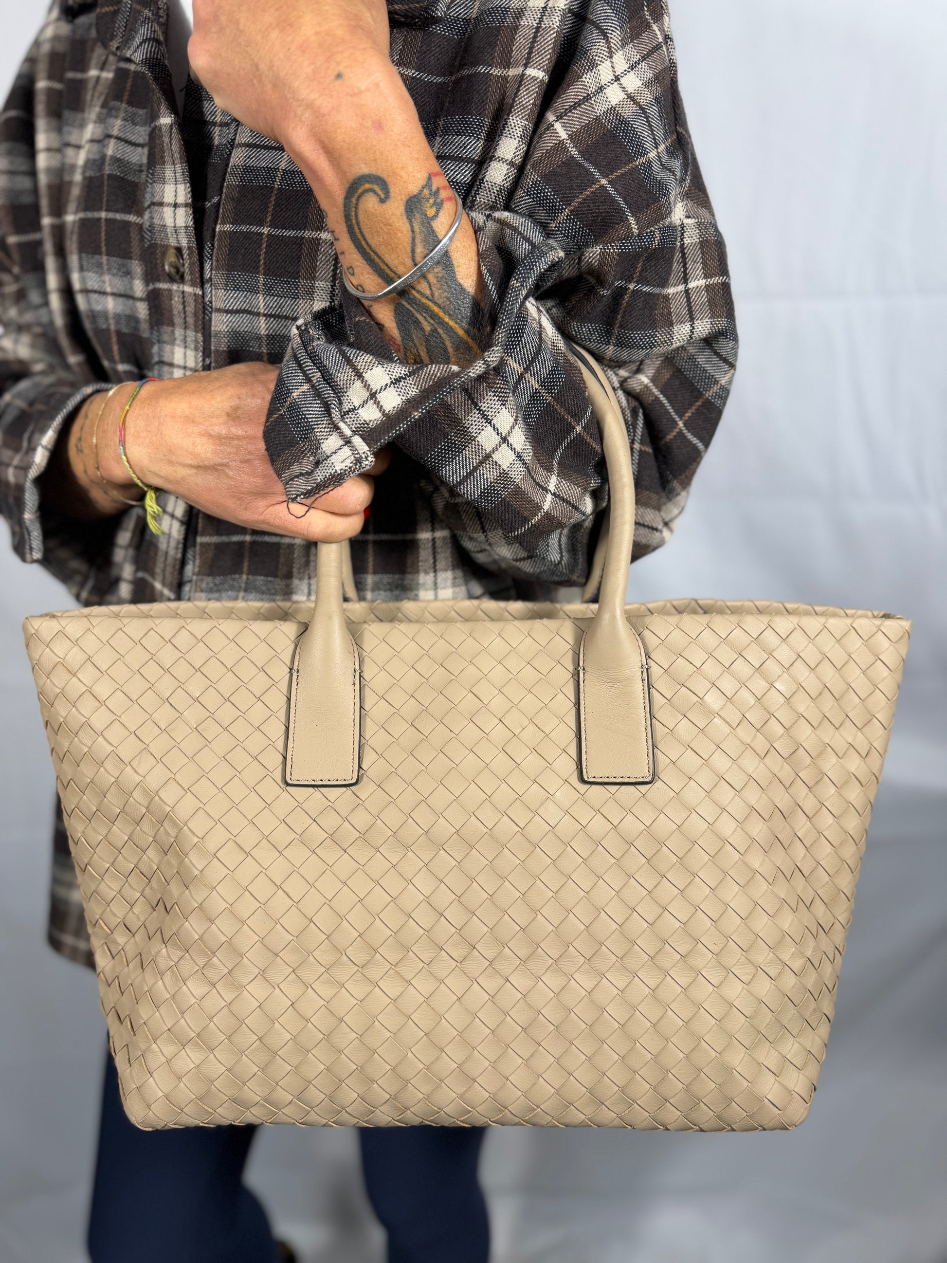 Tote bag realizzata in pelle di vitello liscio intrecciata a mano.