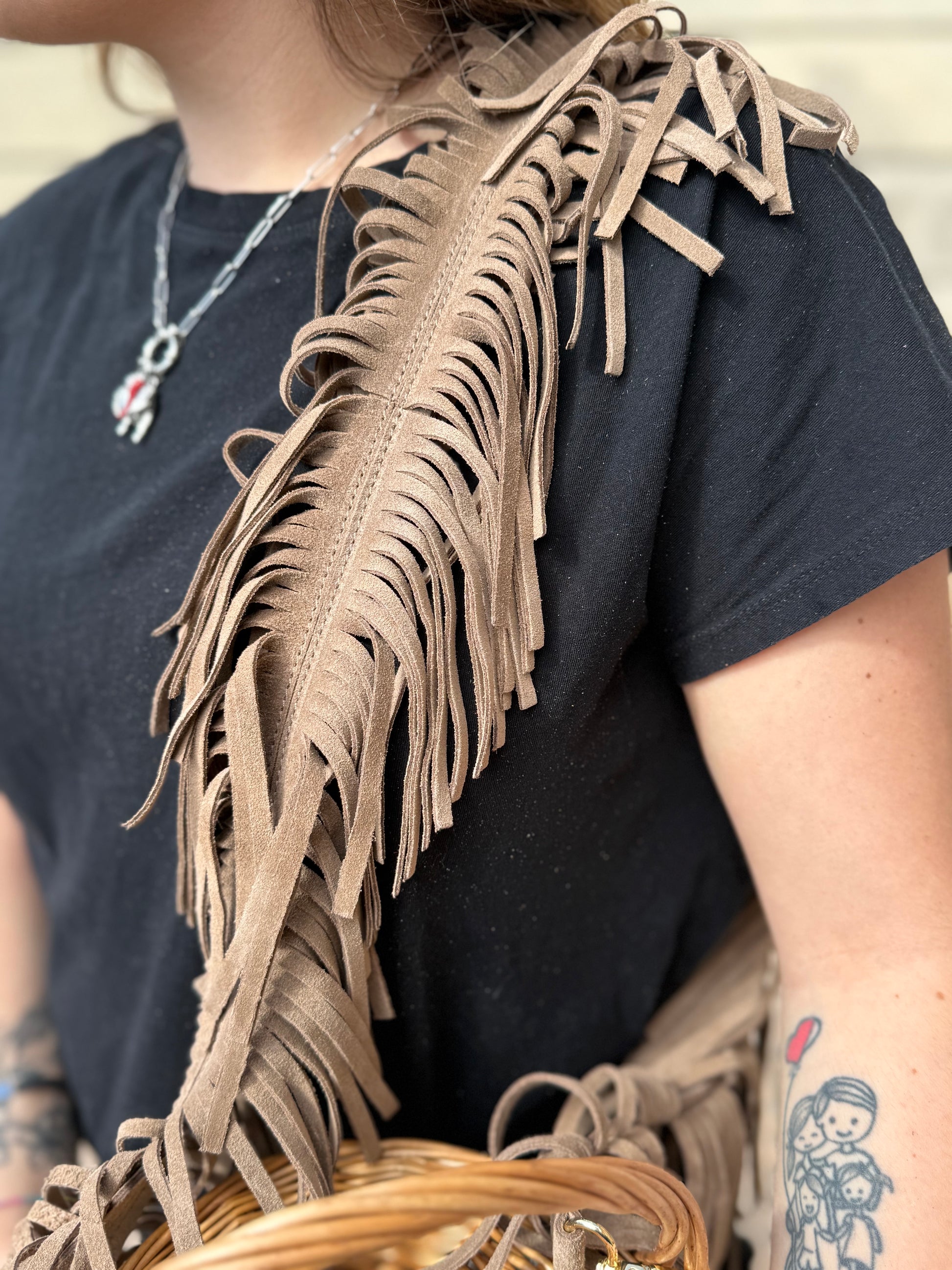 Tracolla con frange realizzata in pelle di vitello scamosciato.